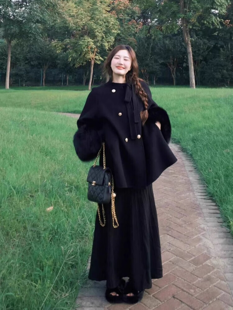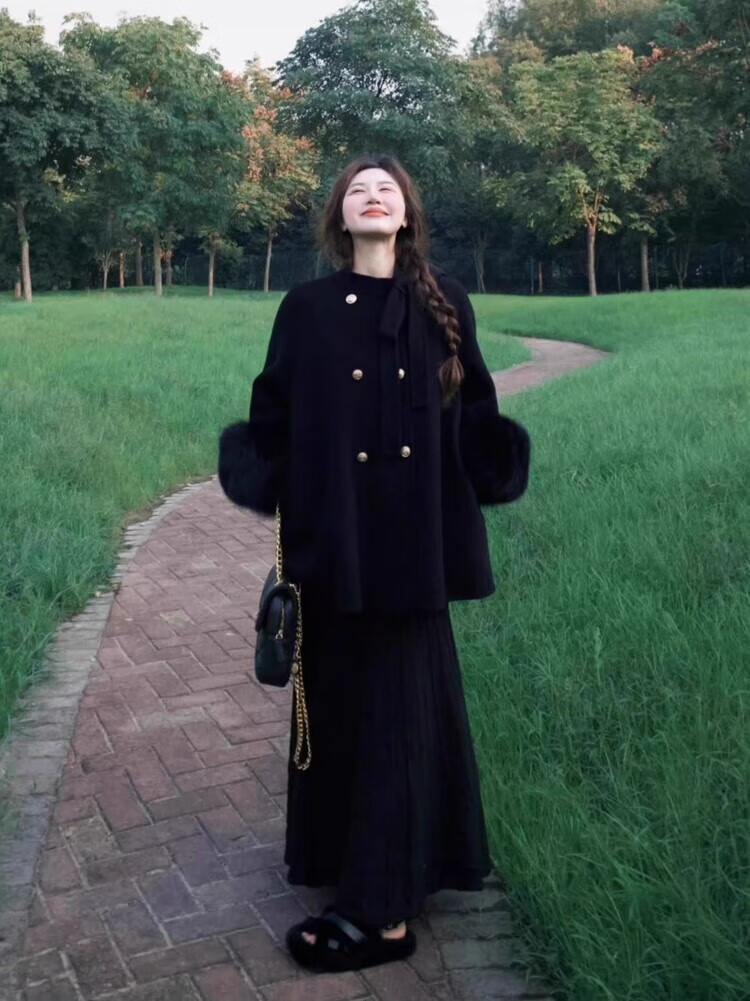 The bold and spicy lady's plus size women's woolen coat autumn and winter new fat mm small fragrance black temperament royal sister high-end suit skirt woolen coat + black skirt suit XL (recommended 120-140Jin Jin equals 0.5 kg)