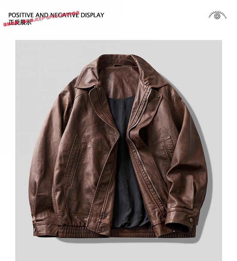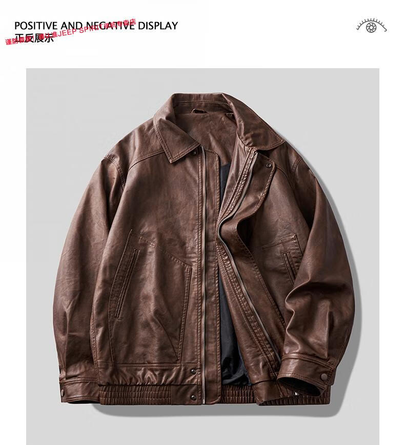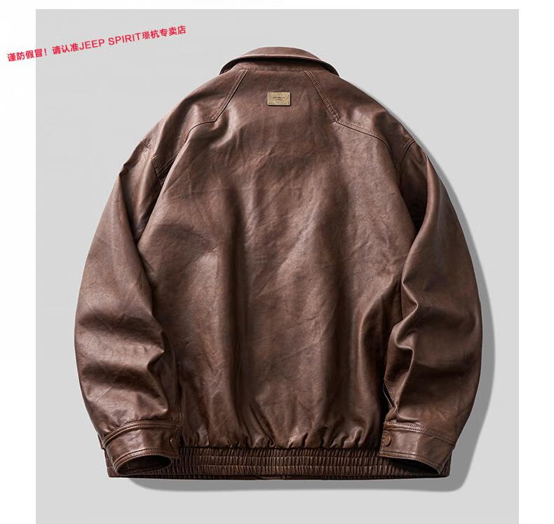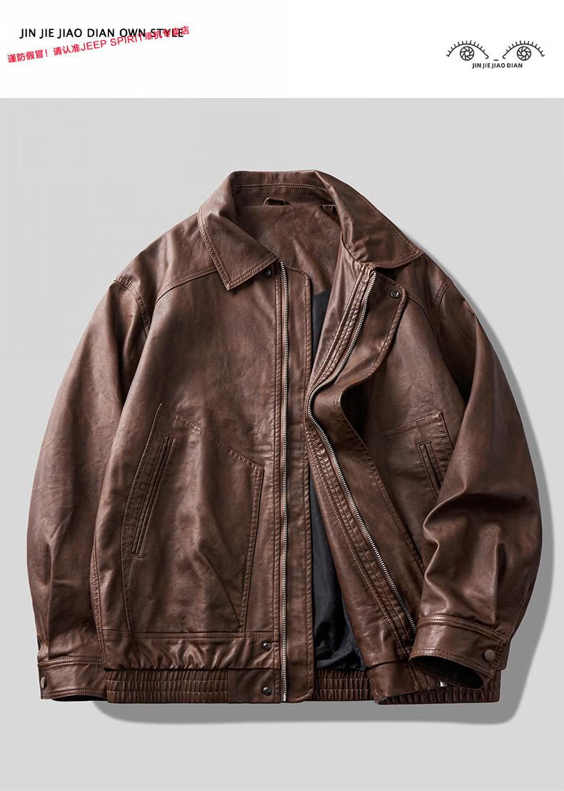 JEEP SPIRIT Jeep high-definition saddle vegetable tanned oil leather motorcycle lapel leather jacket for men 2025 autumn loose leather jacket for men, coffee color, handsome loose version