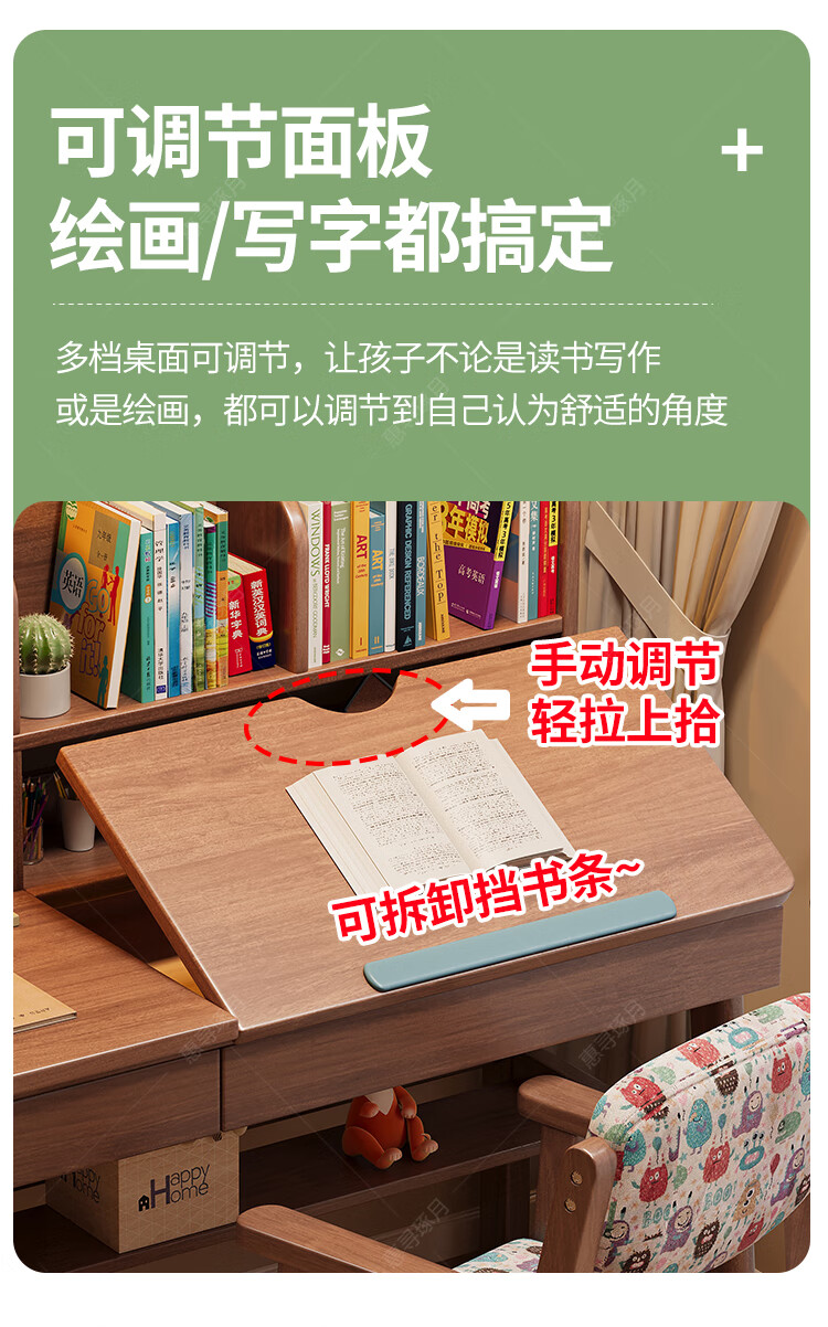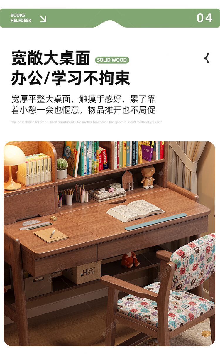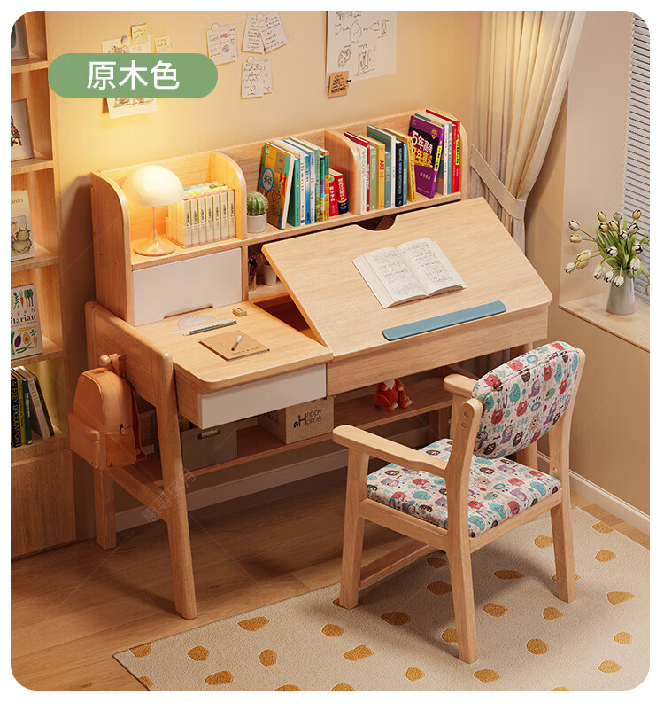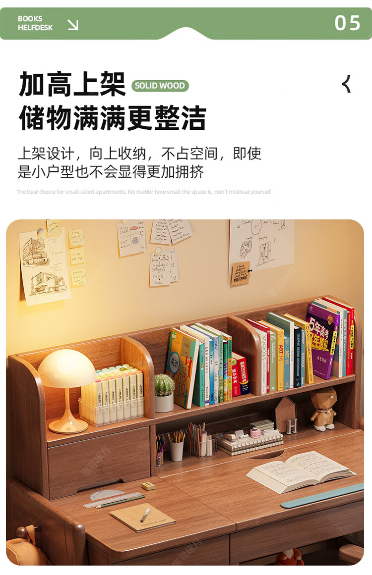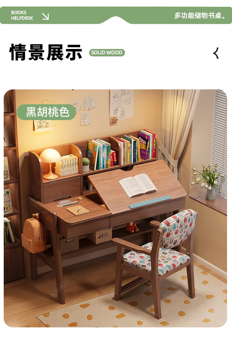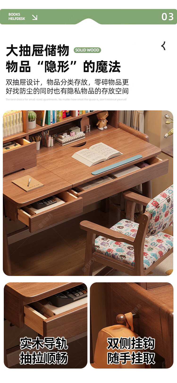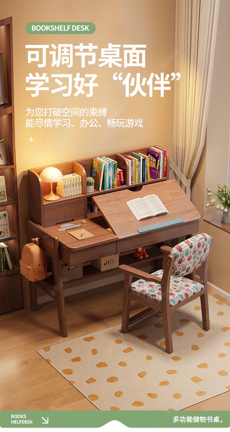 Huixun Children's Study Table Primary and Secondary School Solid Wood Desk with Bookshelf Children's Liftable Home Desk and Chair Set Walnut Color #Desk + Bookshelf 100cm*60cm*75cm Total Height 112cm