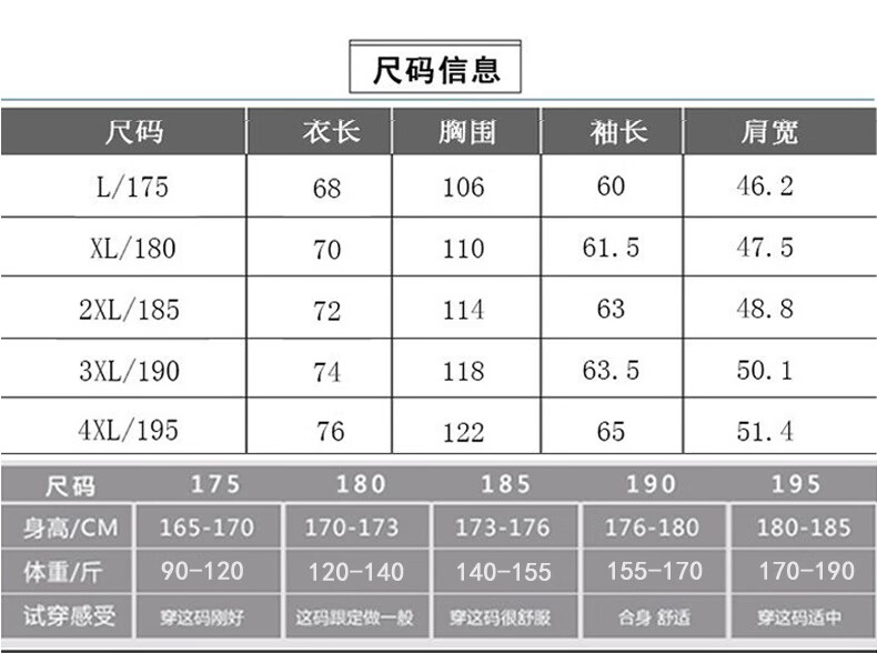 China (cm) 165 / 88-90 170 / 96-98 175 / 108-110 180 / 118-122 185 / 126-130