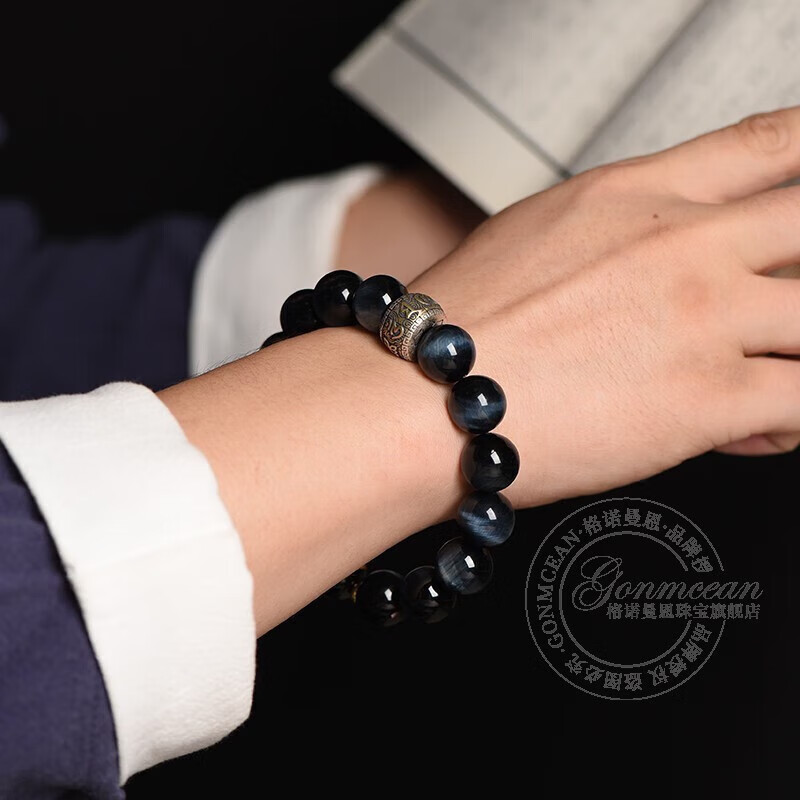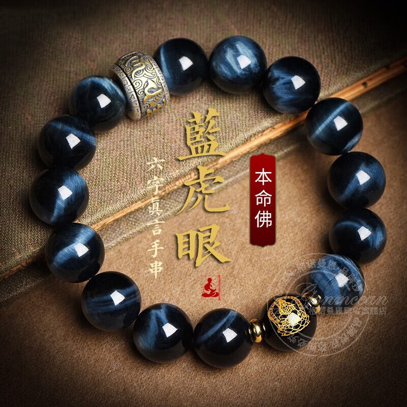 Qiaoyu 2025 Blue Tiger Eye Stone Bracelet Men's Zodiac Year Collection Lightning Pattern Zodiac Year Bracelet Gift 12mm Bead Diameter (please note the zodiac sign when placing an order)