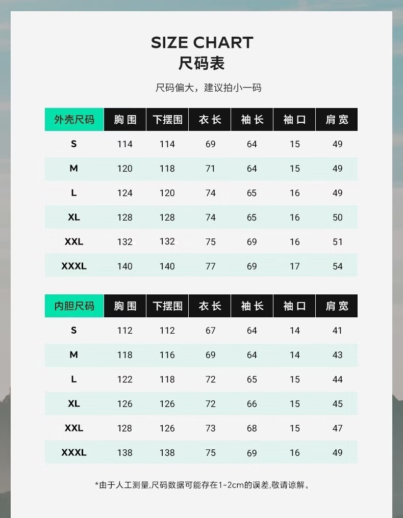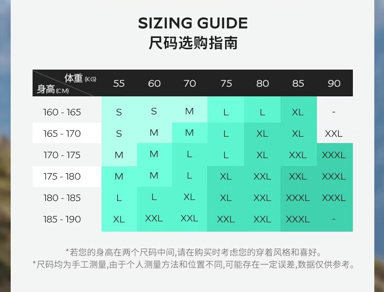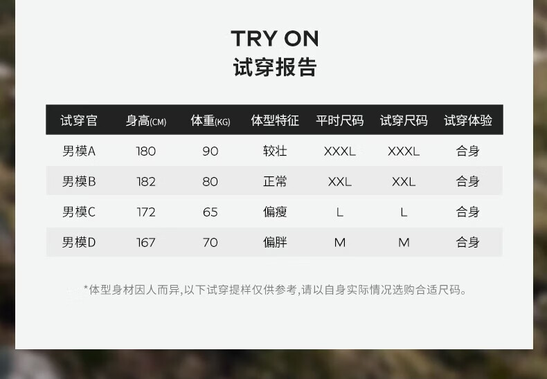 China (cm) 165 / 88-90 170 / 96-98 175 / 108-110 180 / 118-122 185 / 126-130