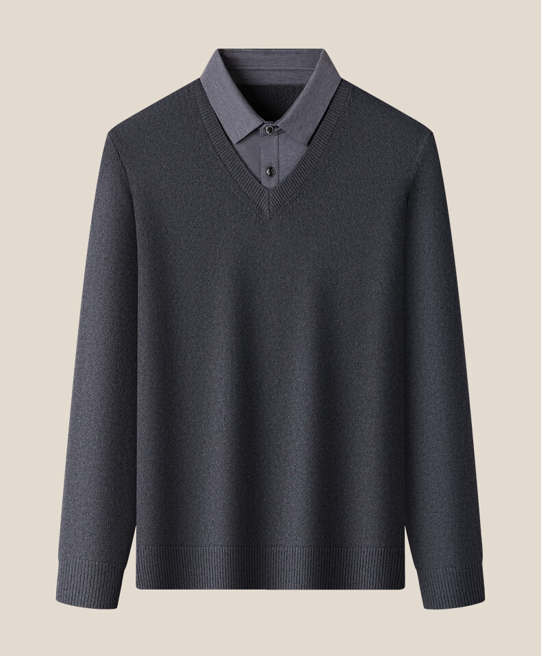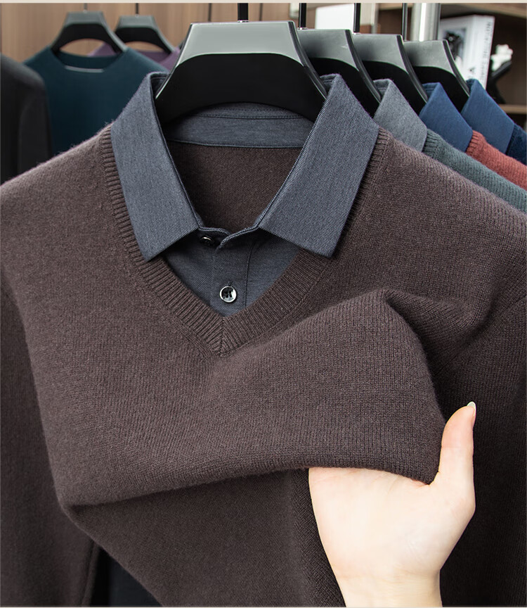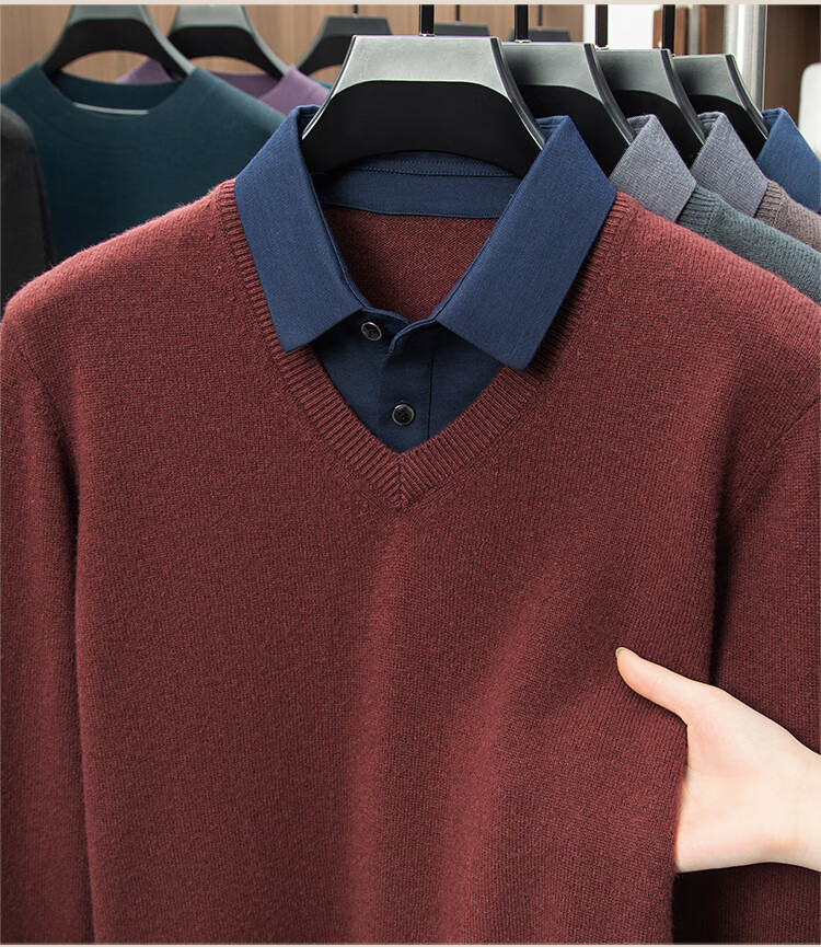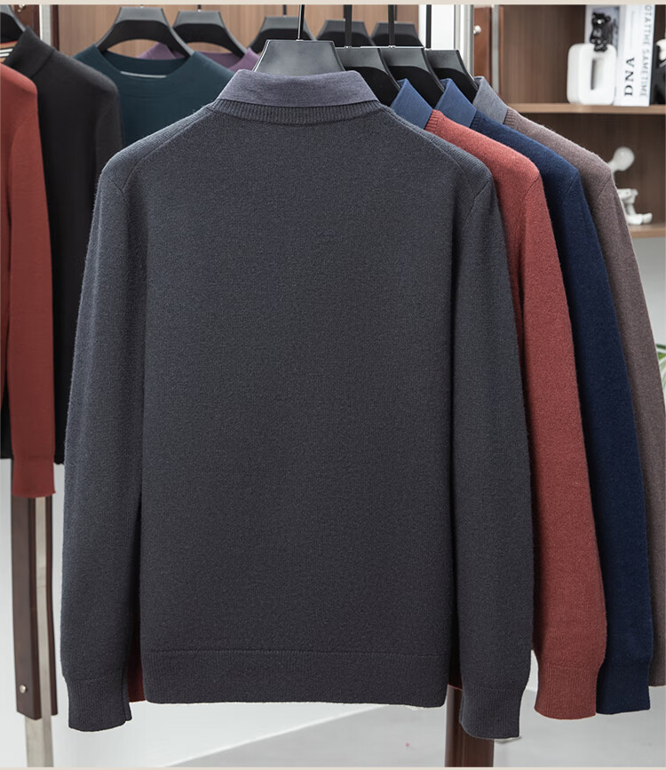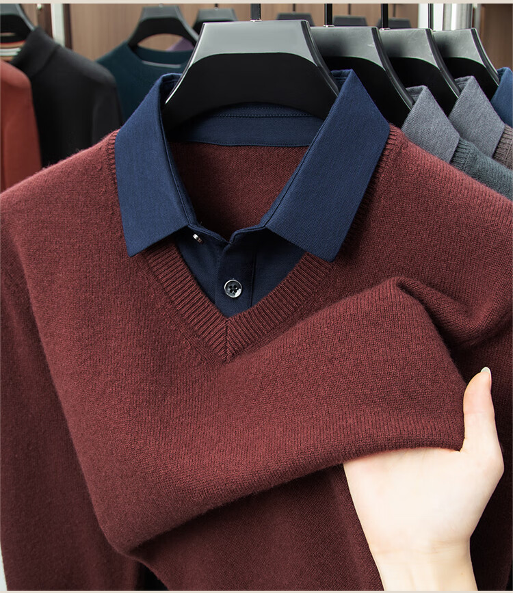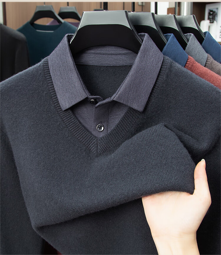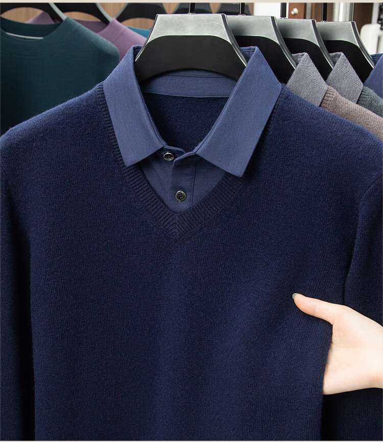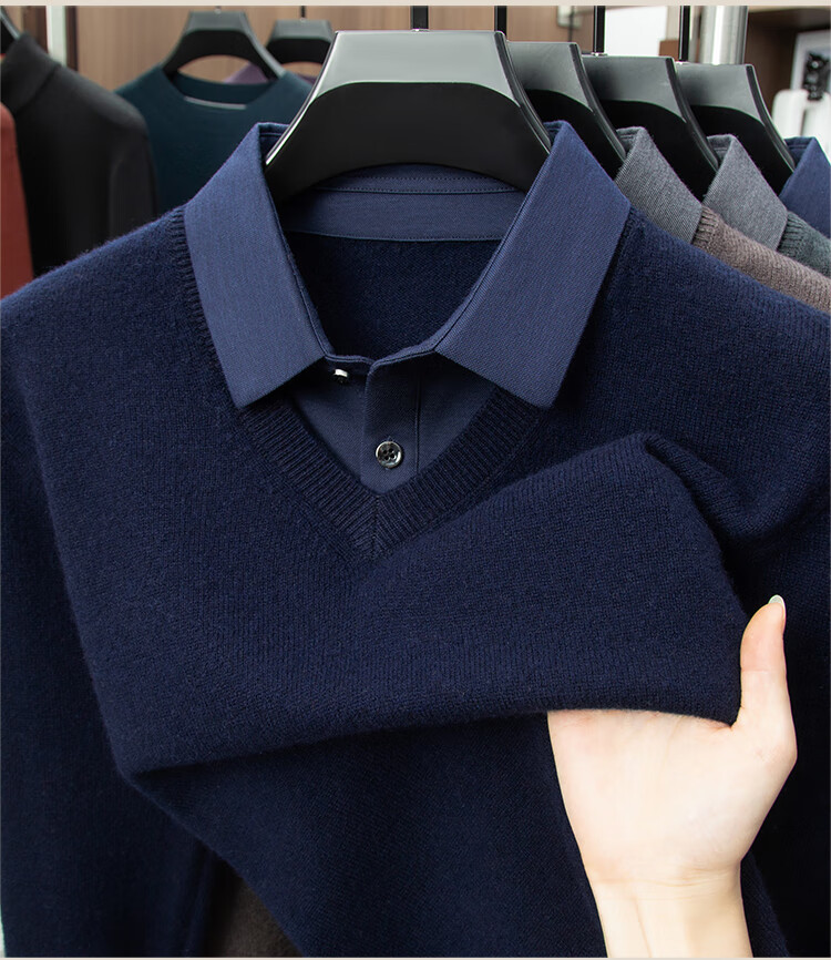 Hengyuanxiang Shirt Collar Sweater Men's Pure Wool 2025 Autumn and Winter New Men's Fake Two-Piece Wool Sweater Tops Business Casual Deep Sea Blue