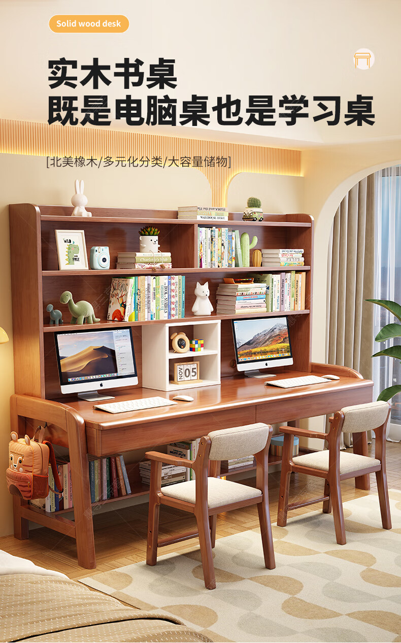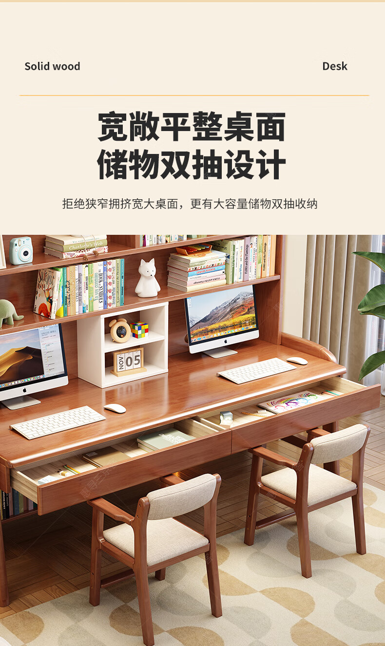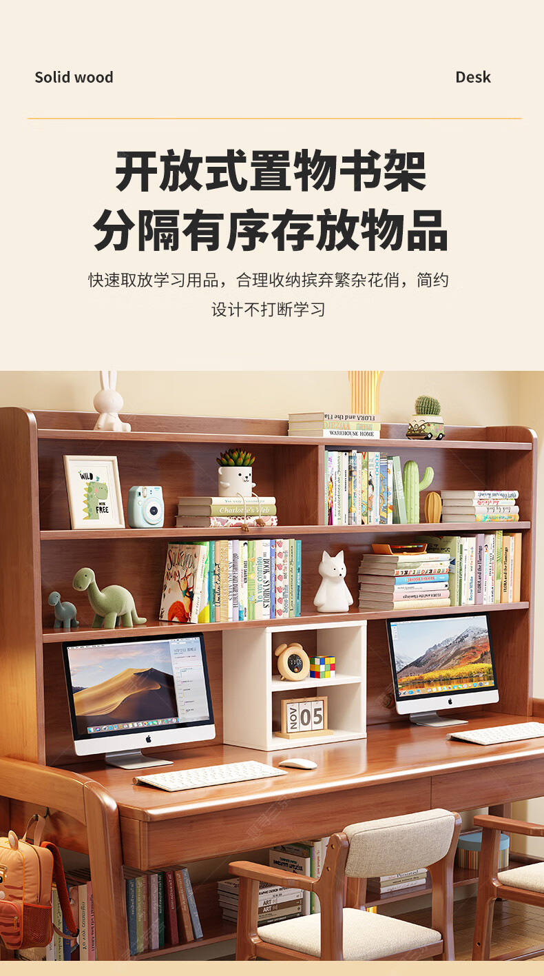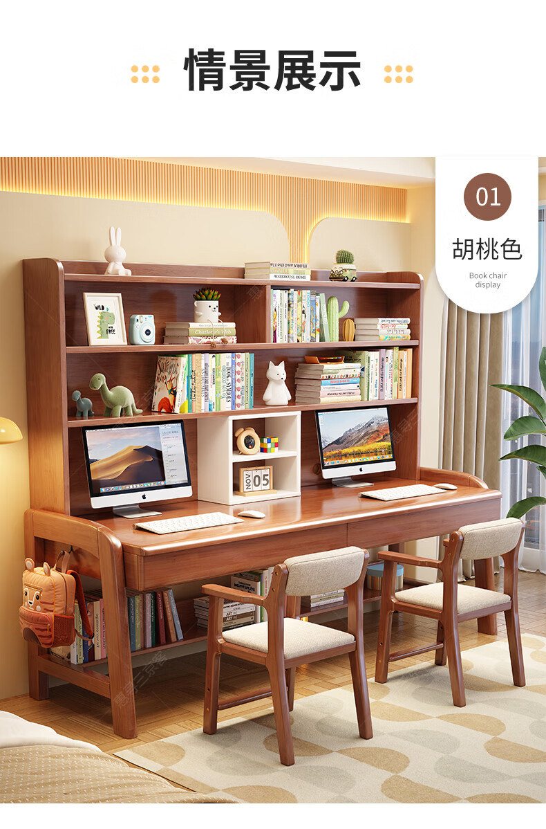 Huixun solid wood double desk bookshelf integrated home liftable children's study table study student study desk writing desk walnut color #desk + bookshelf 160cm*60cm*75cm total height 190cm