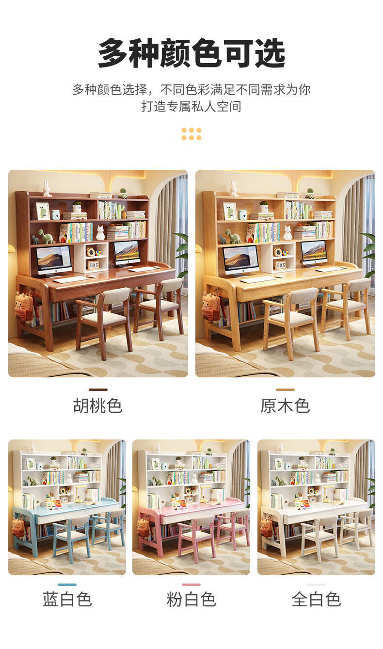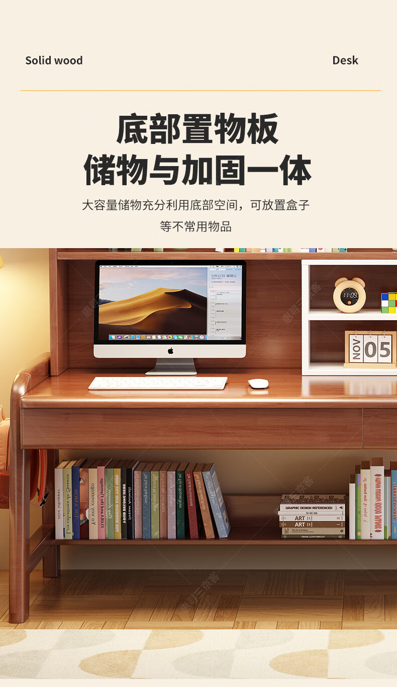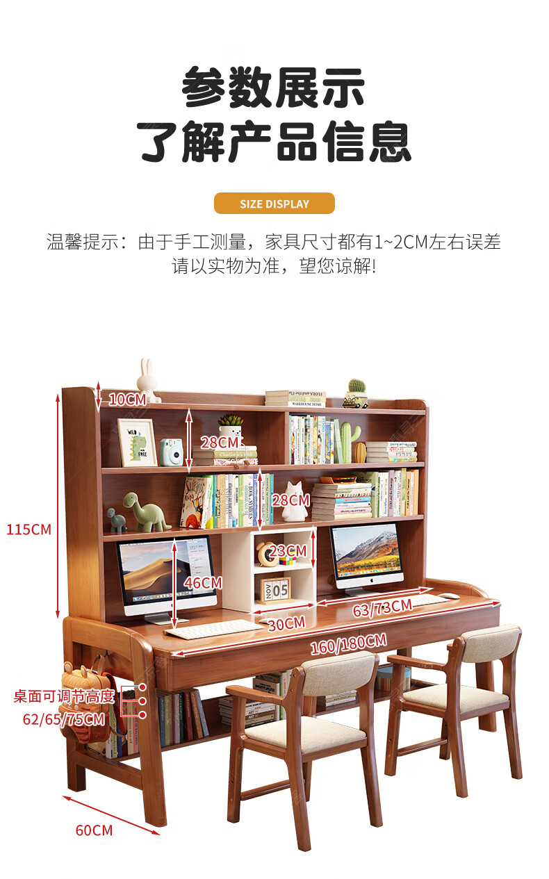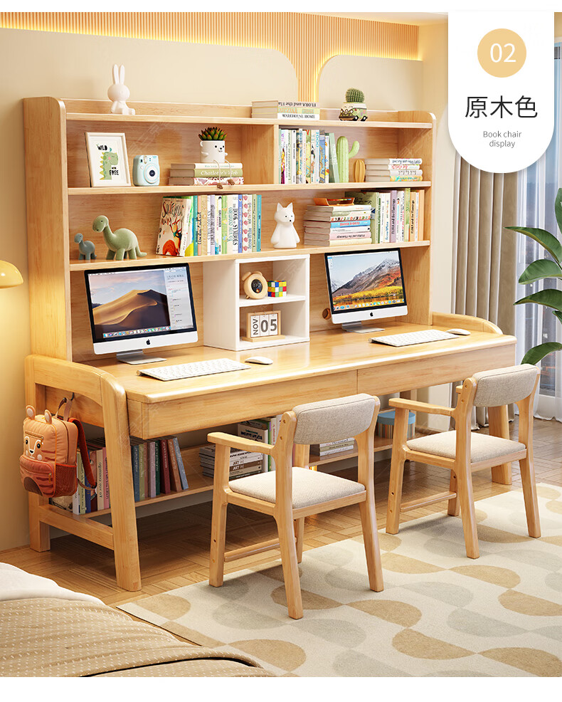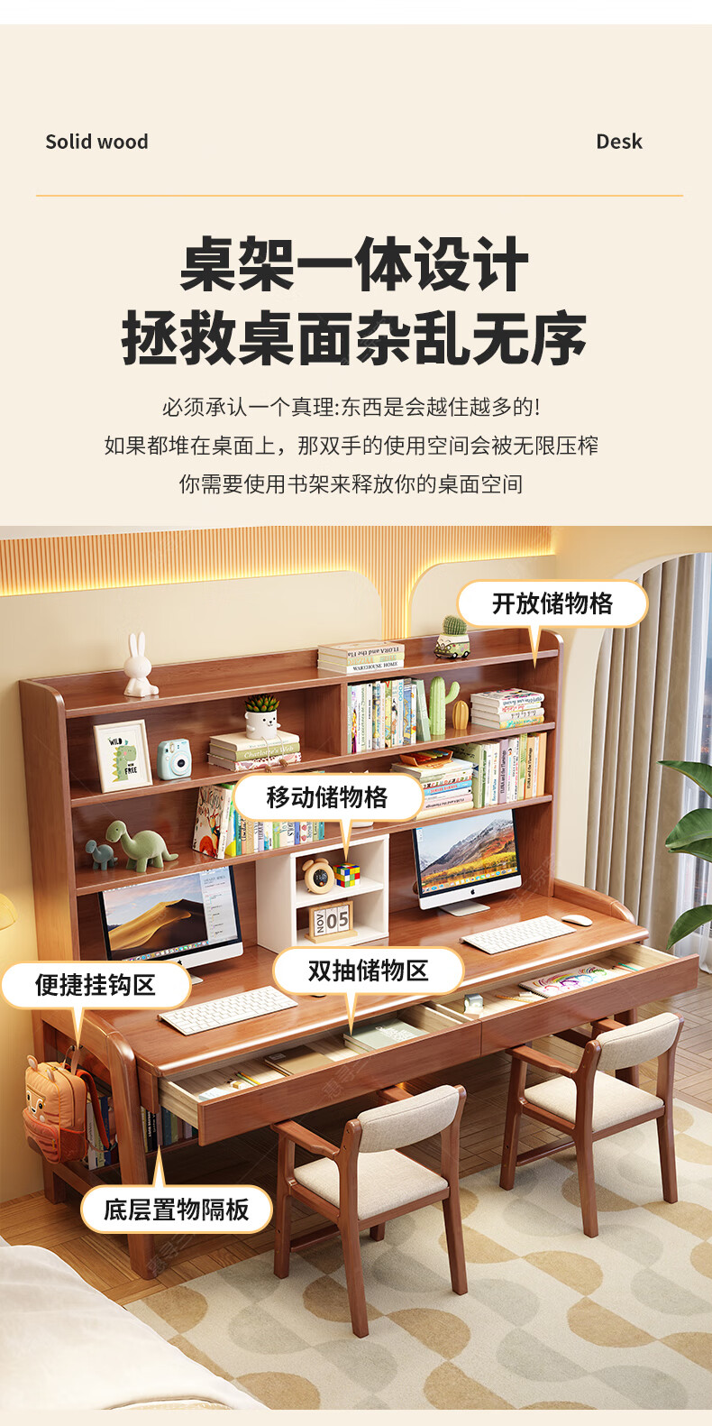 Huixun solid wood double desk bookshelf integrated home liftable children's study table study student study desk writing desk walnut color #desk + bookshelf 160cm*60cm*75cm total height 190cm