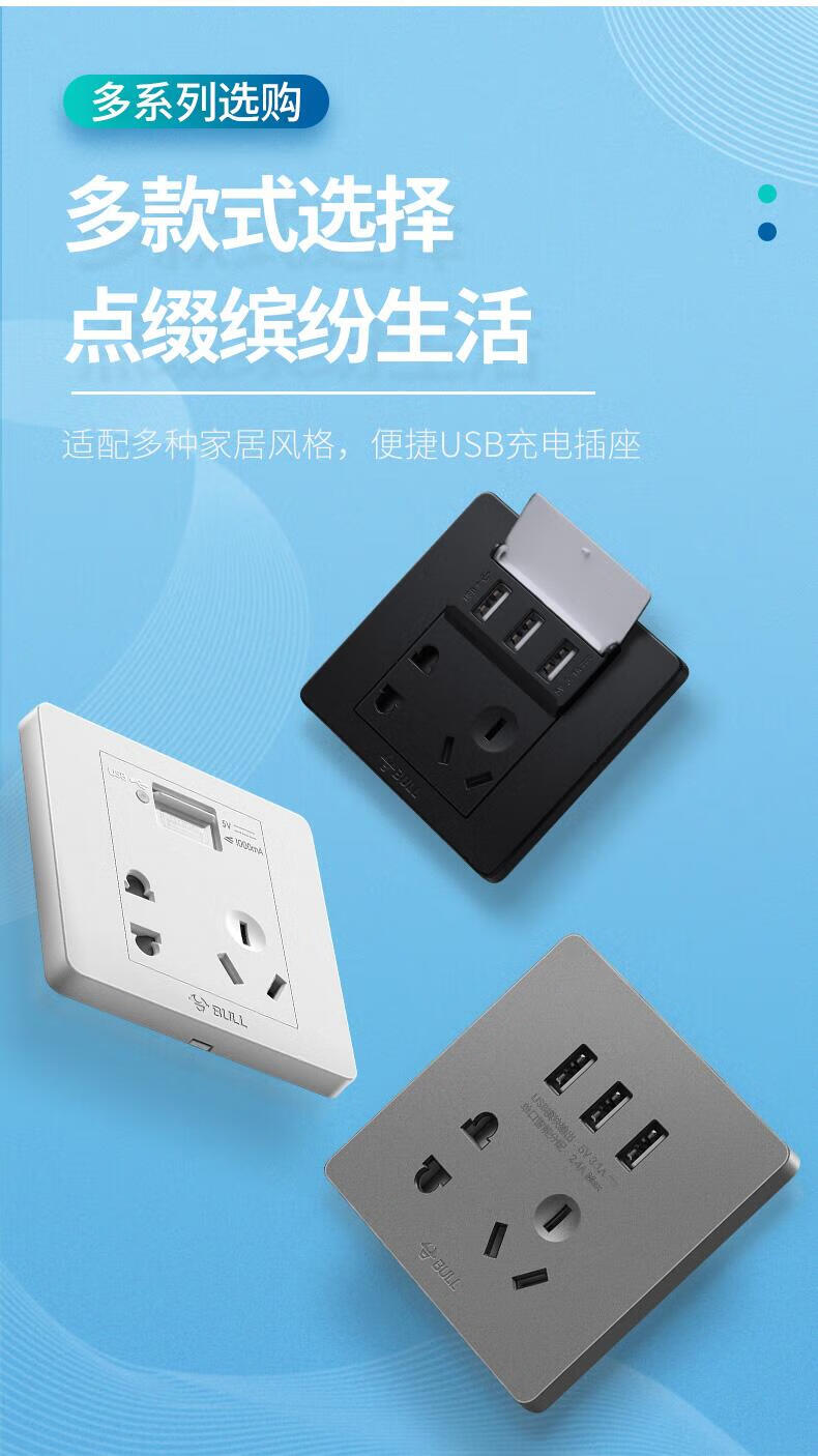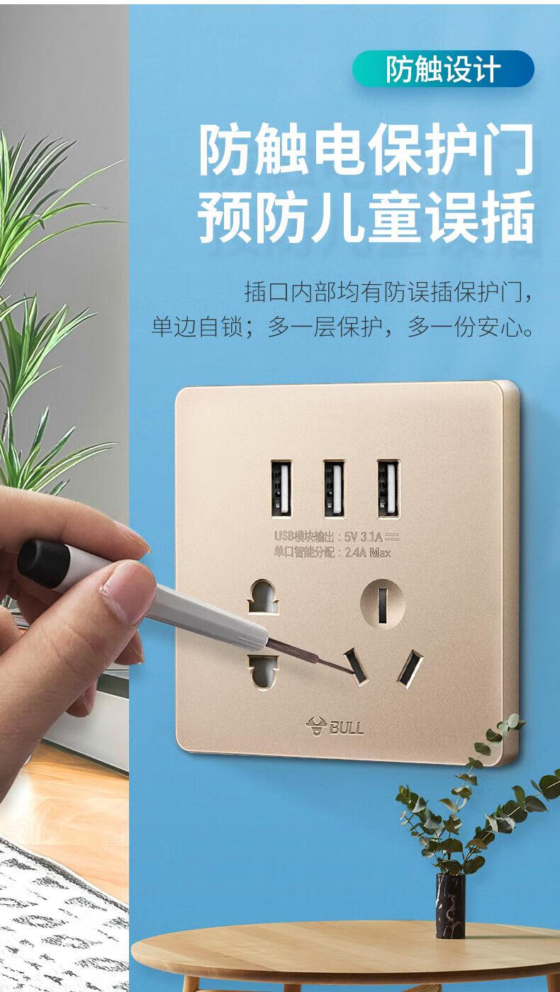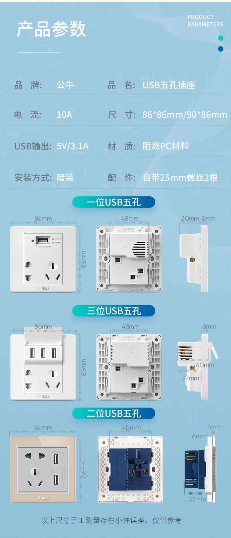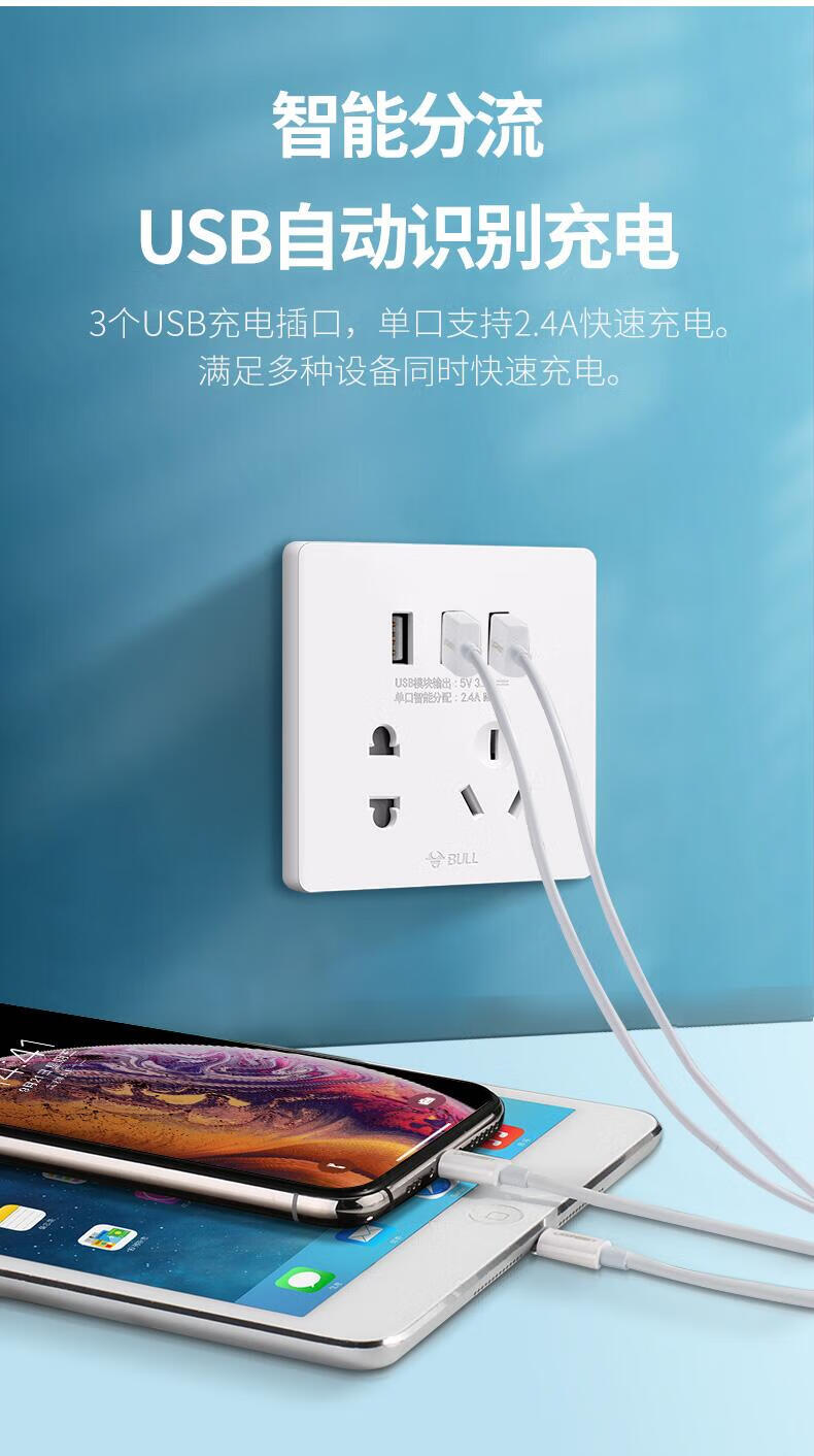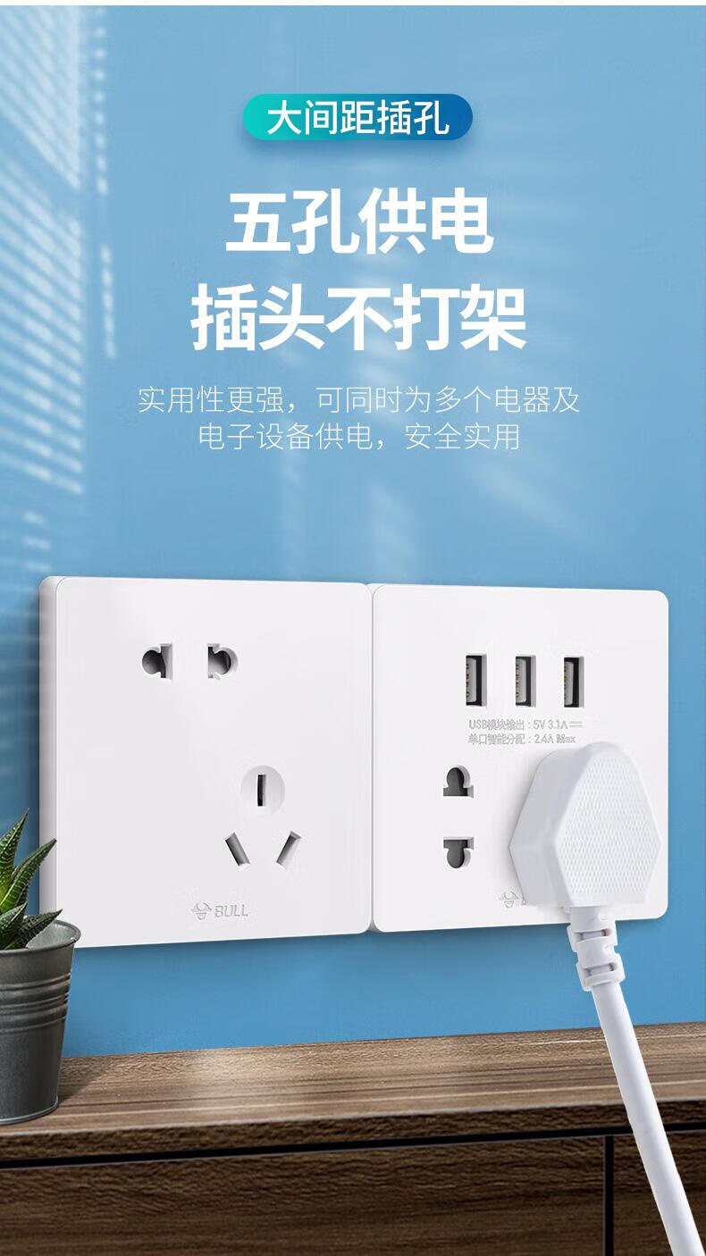 Bull household USB socket with 5 five-hole socket panel mobile phone charging fast charging hotel dedicated 86 concealed two-position USB five-hole socket white