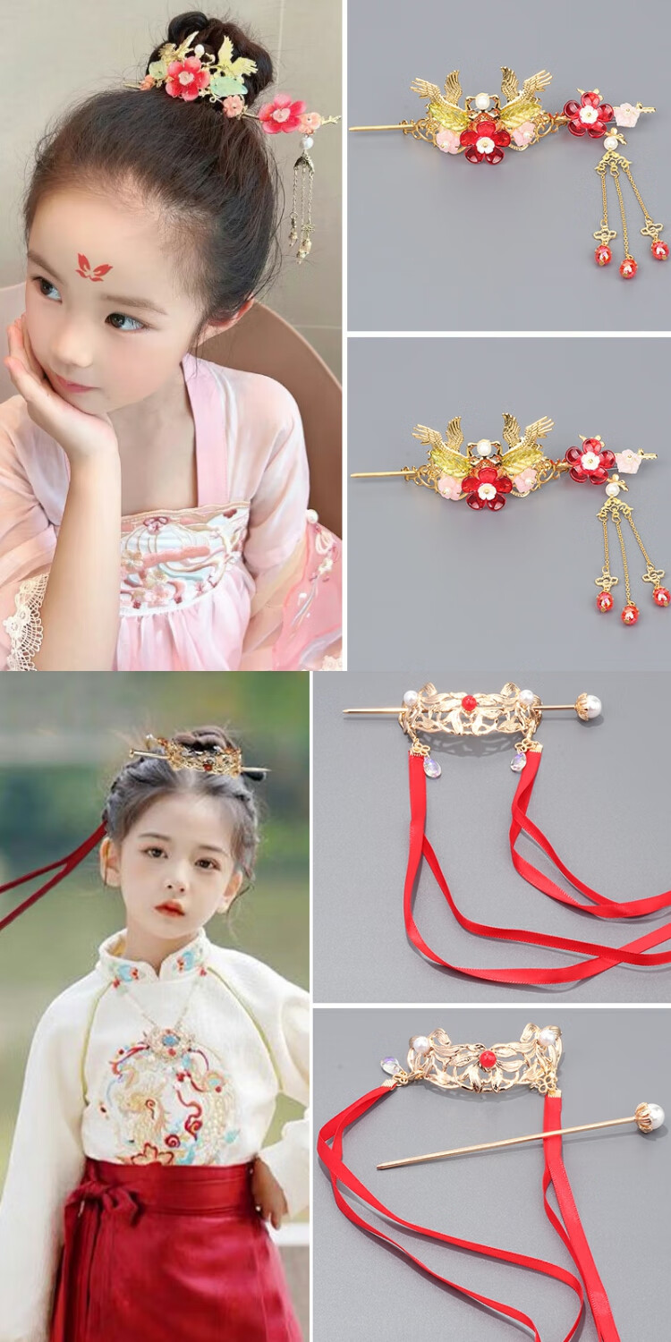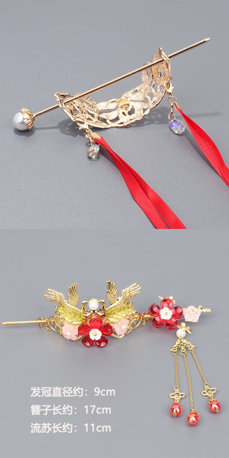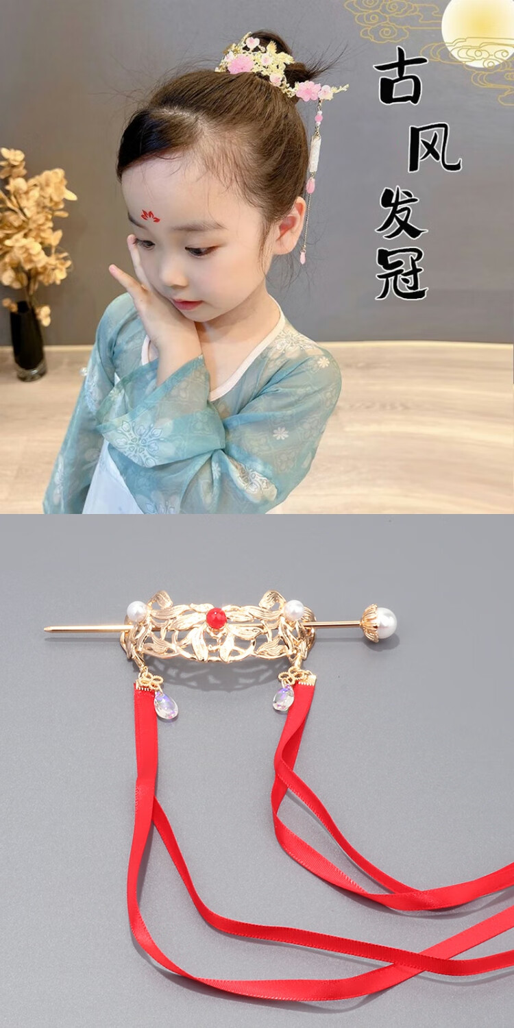Qimei Love New Year Children's Hanfu Hair Accessories Ancient Style Step Princess Hairpin Girls Chinese Style Red Tassel Ball Hair Crown 2 Hair Crowns Red Ribbon Style