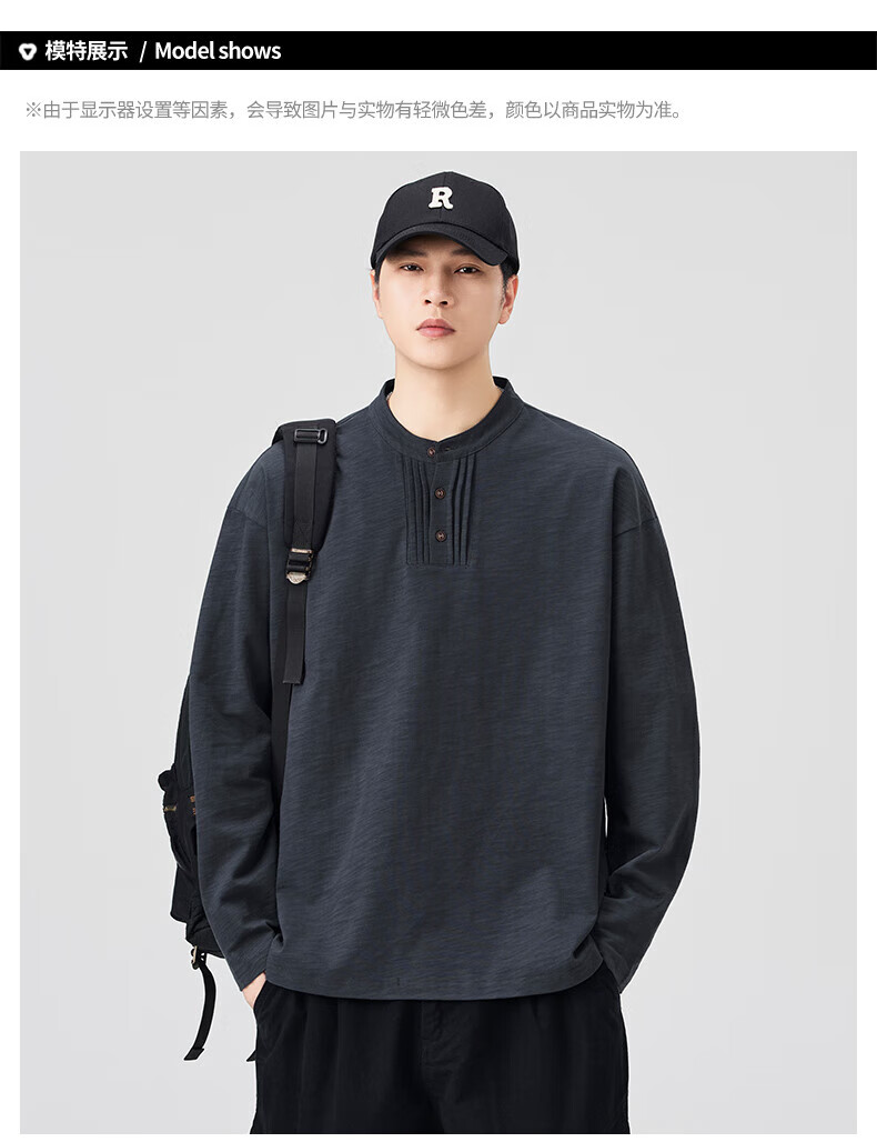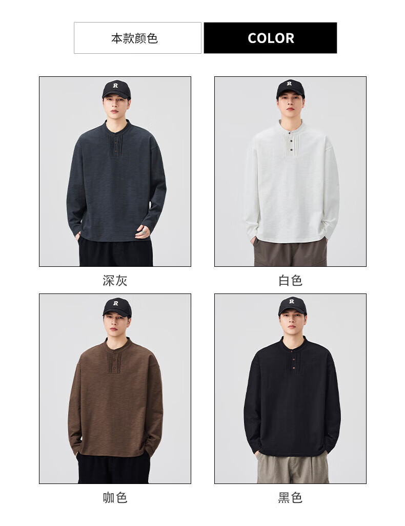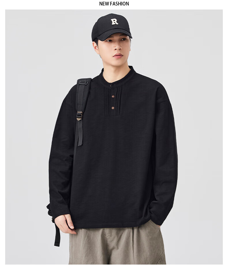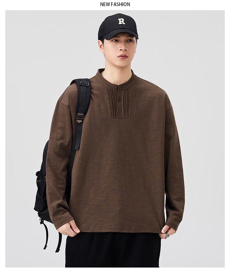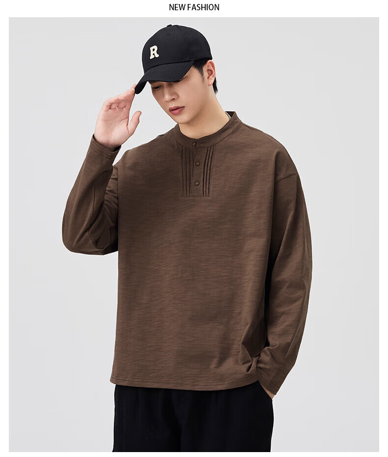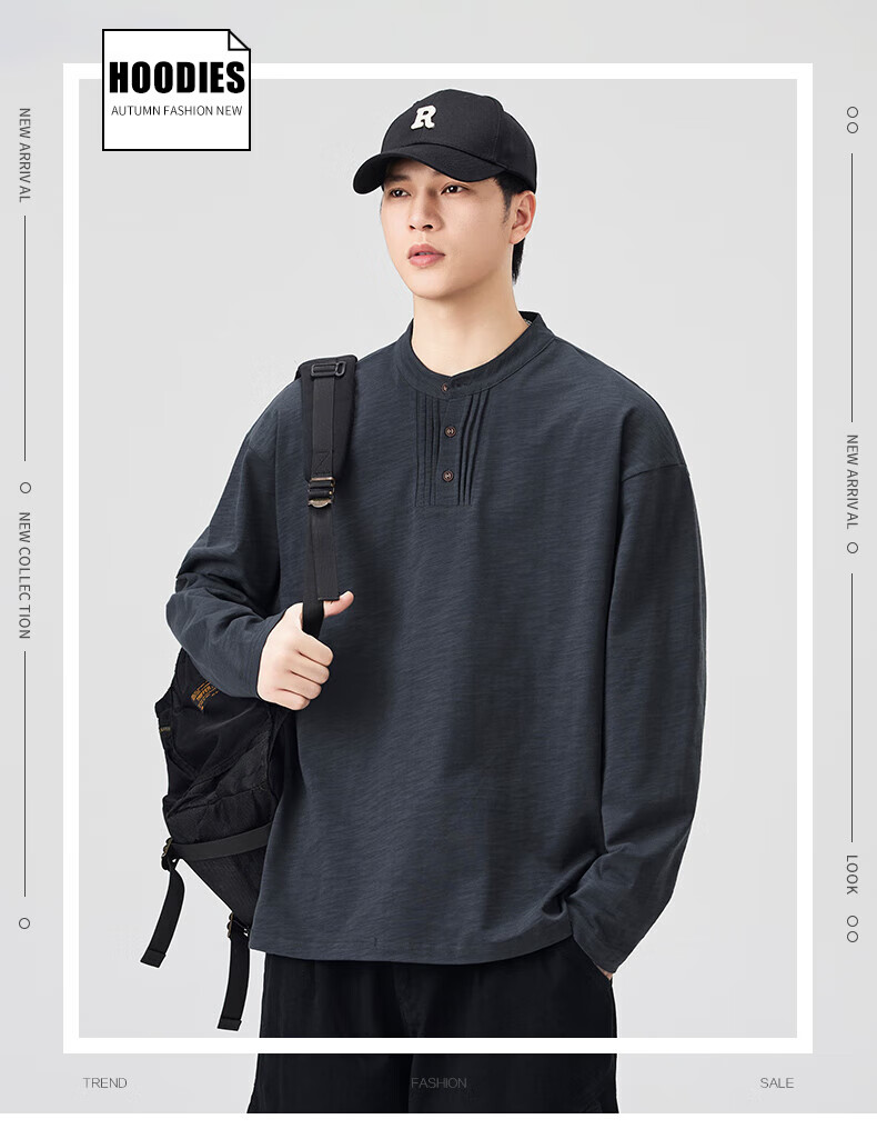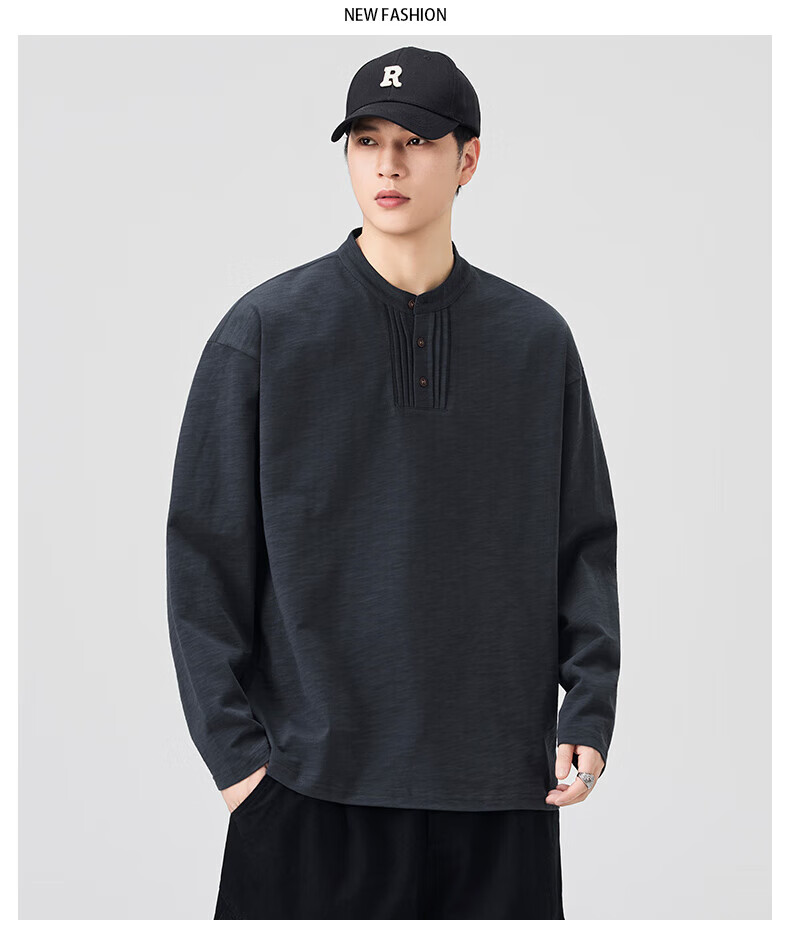 Queli Henry collared long-sleeved T-shirt for men, autumn trendy pure cotton top, American loose inner layering shirt for men, dark gray M
