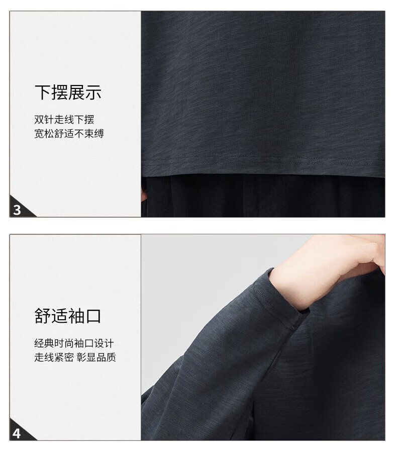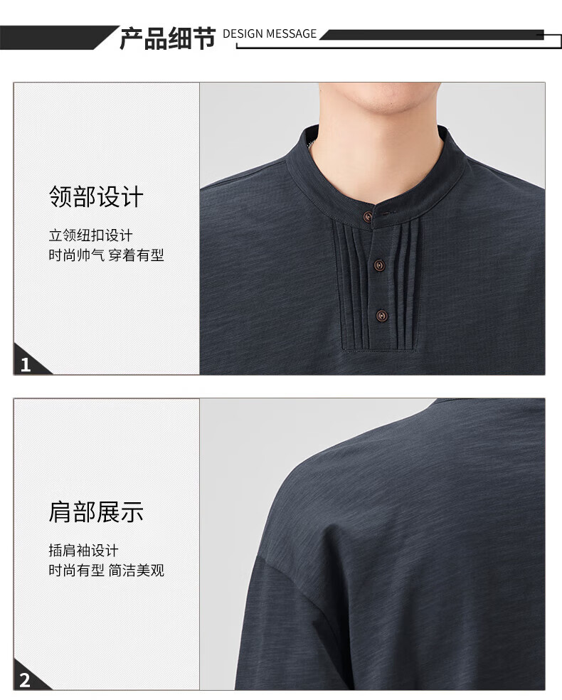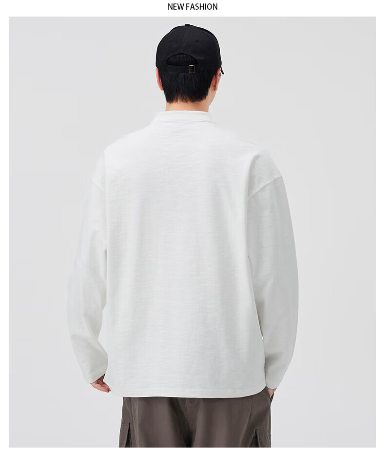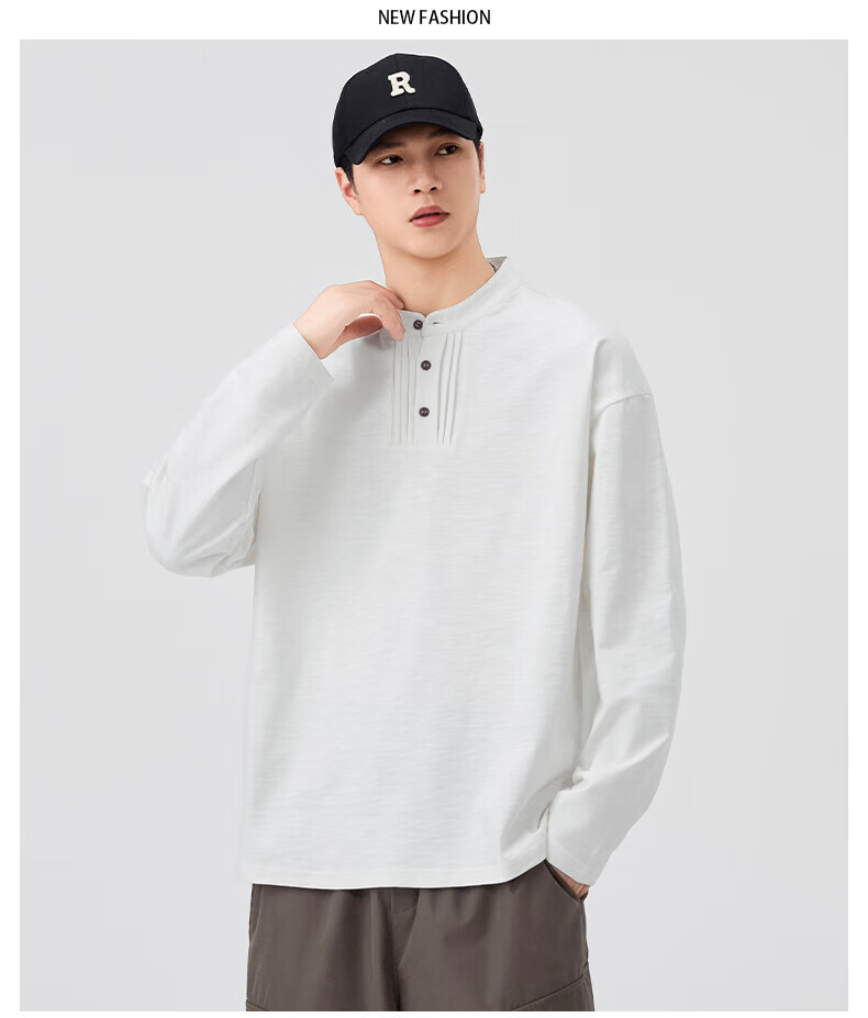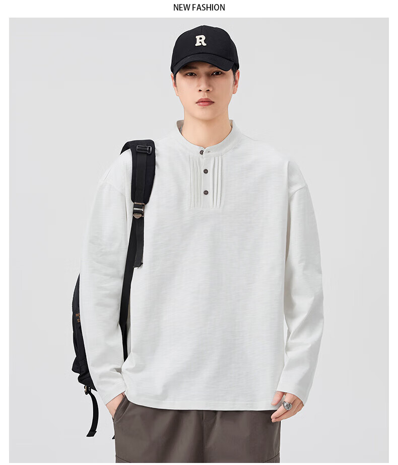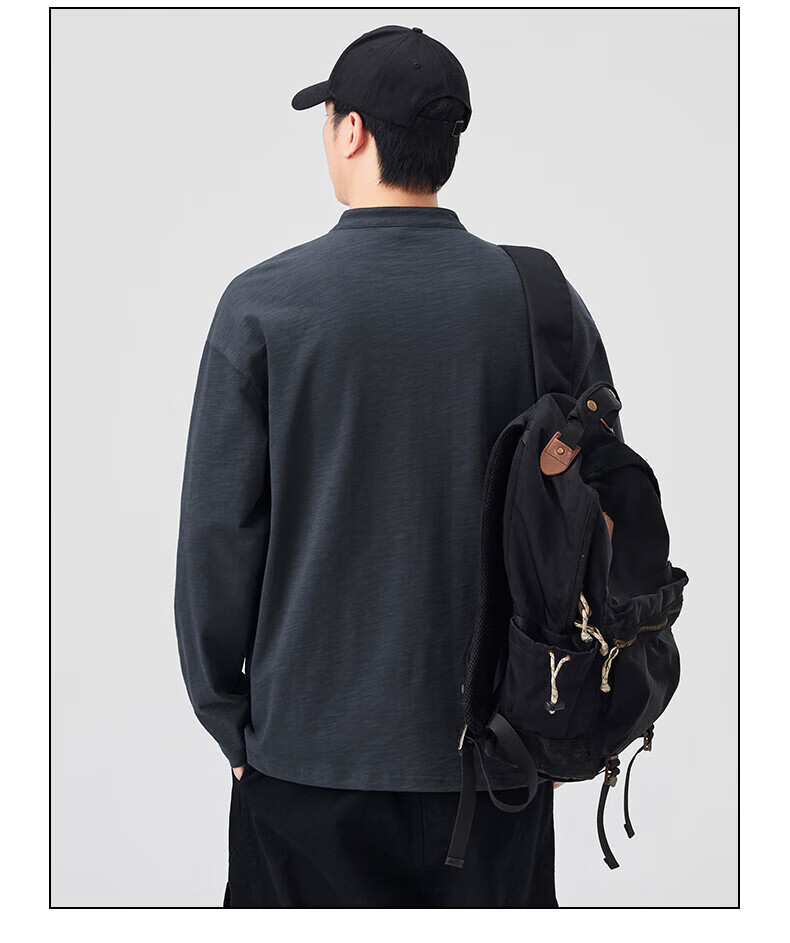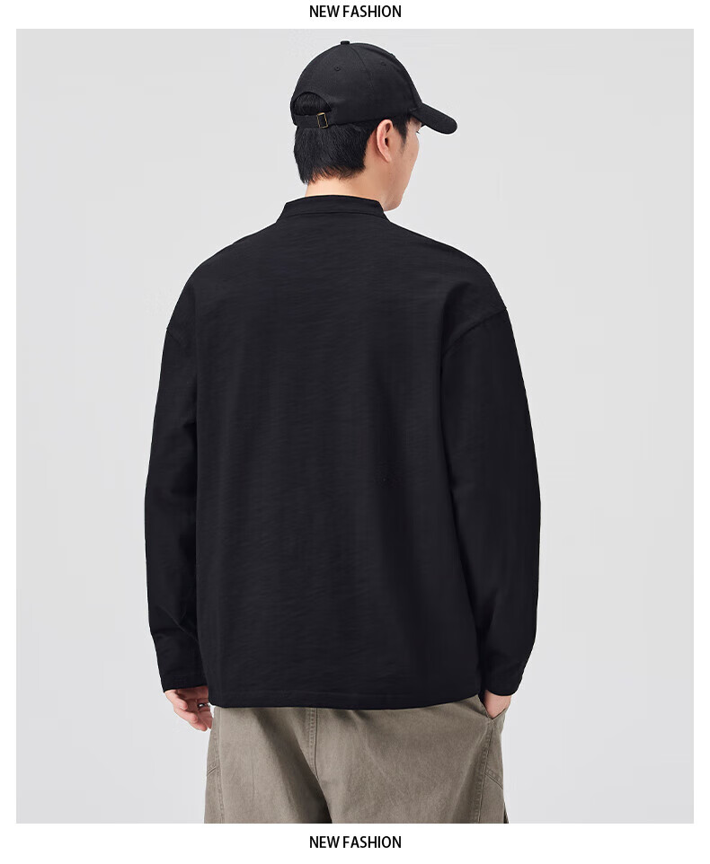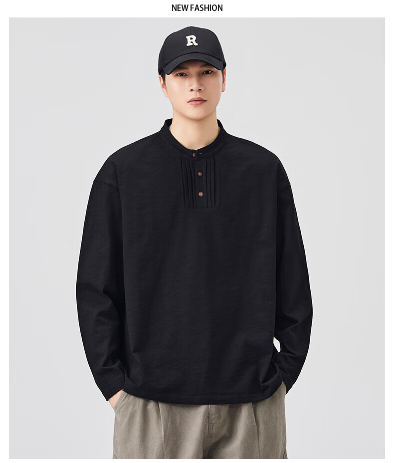 Queli Henry collared long-sleeved T-shirt for men, autumn trendy pure cotton top, American loose inner layering shirt for men, dark gray M