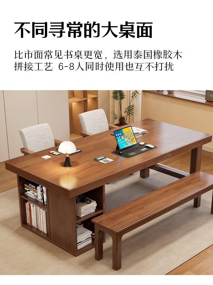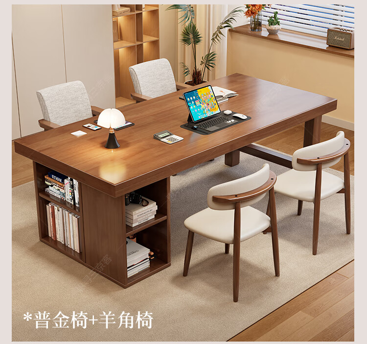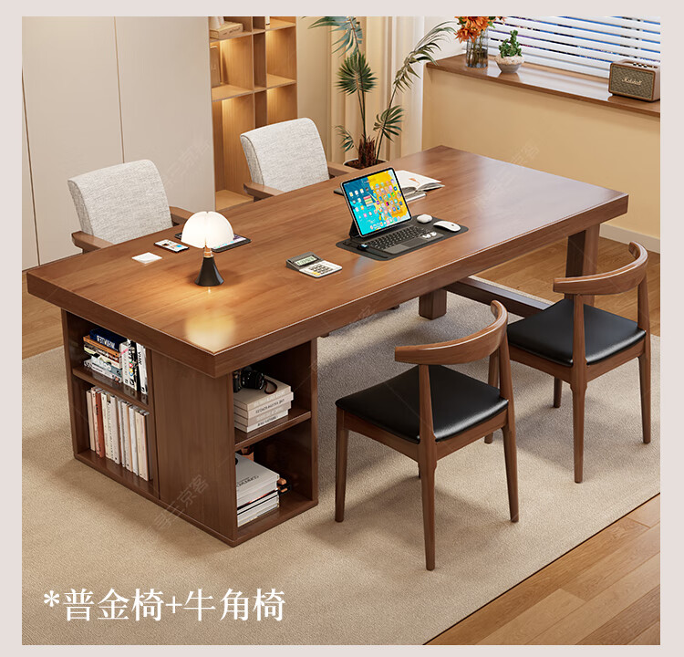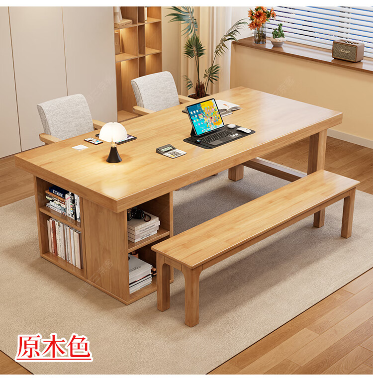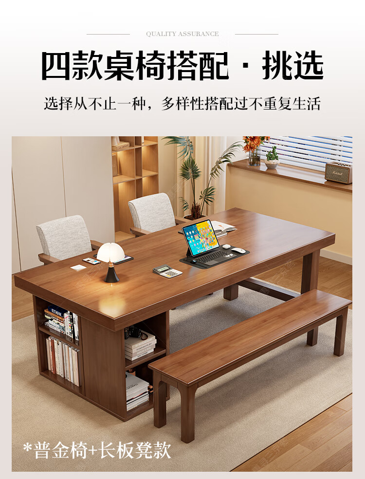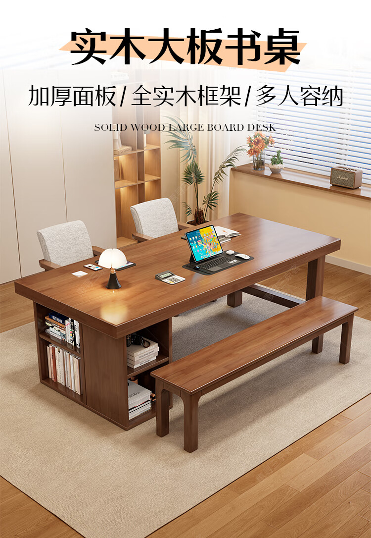 Huixun solid wood large board table living room long desk bookcase combination home dining table integrated workbench multi-person reading and study table walnut color #big board table 140cm*80cm*75cm desktop thickness 6.5cm