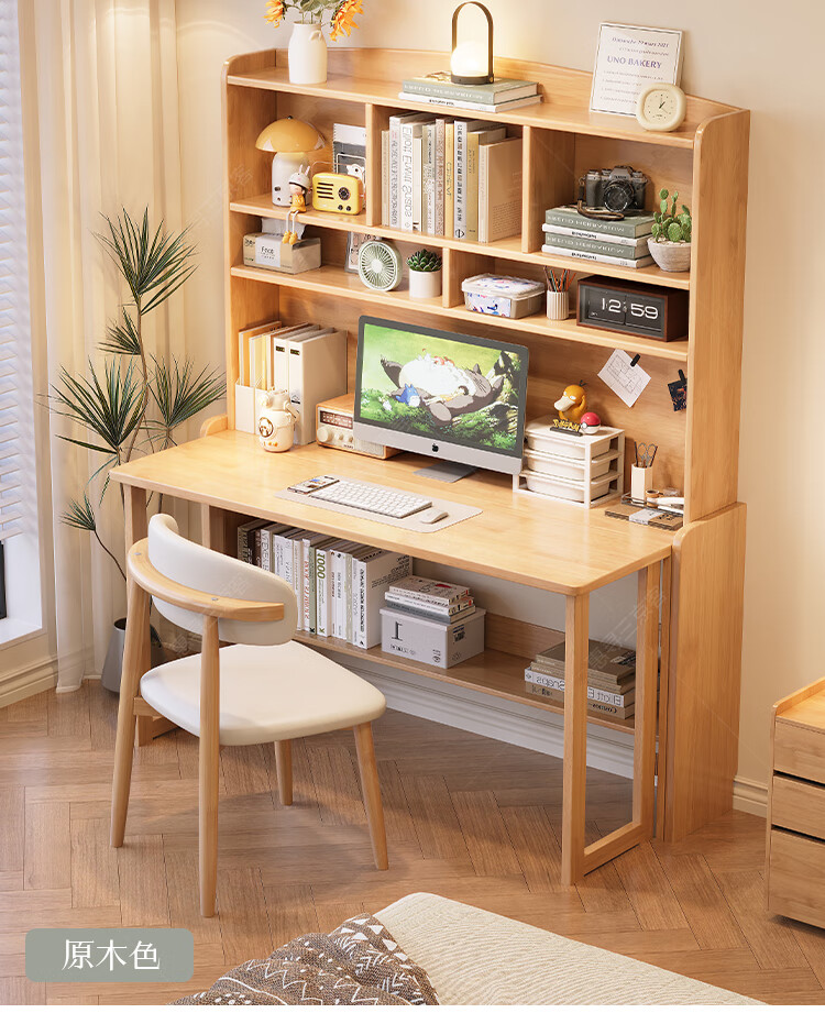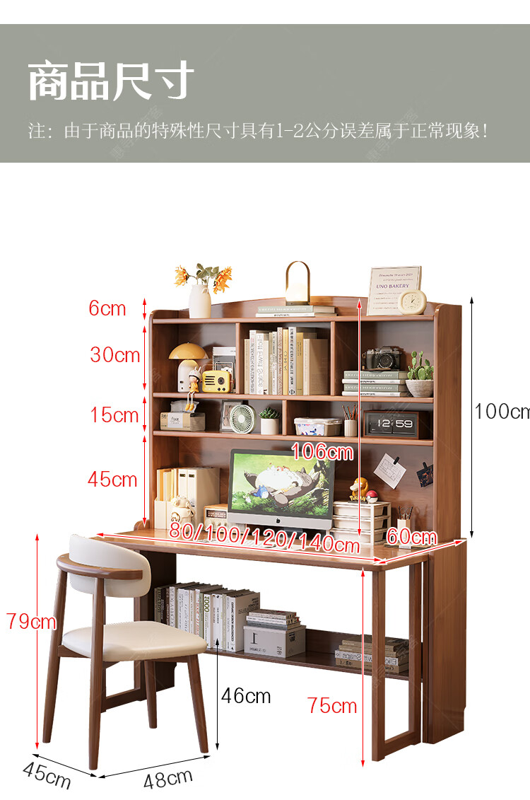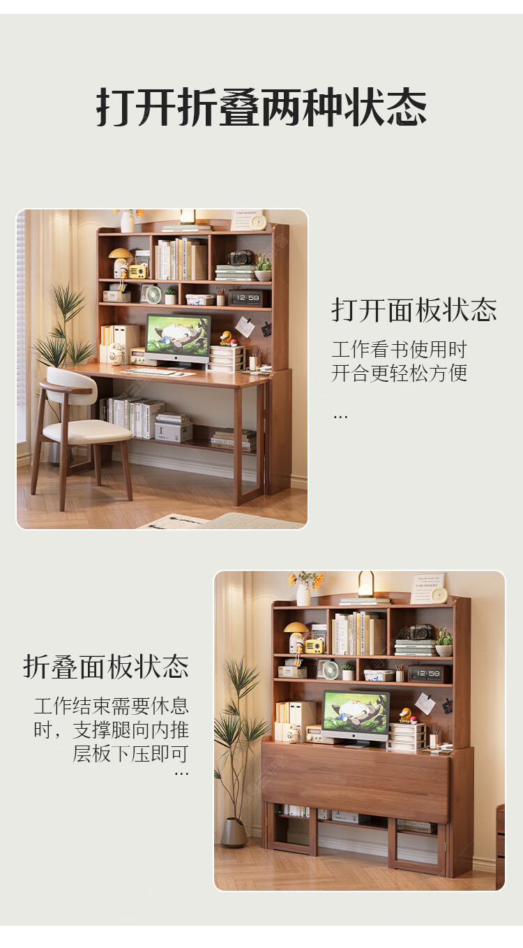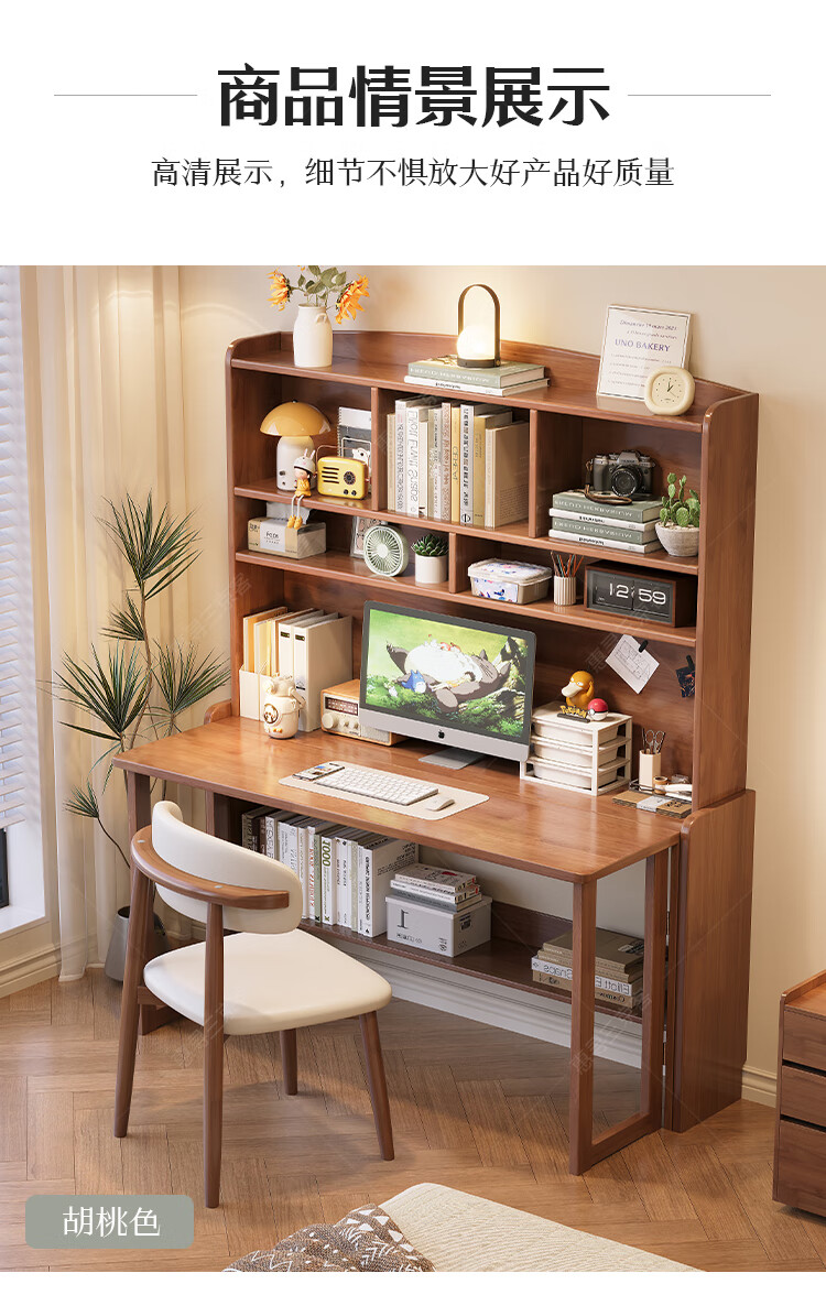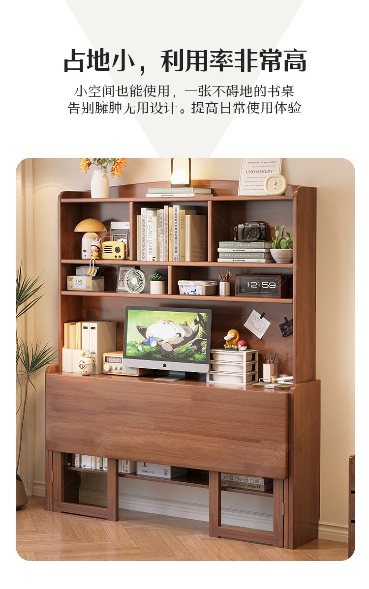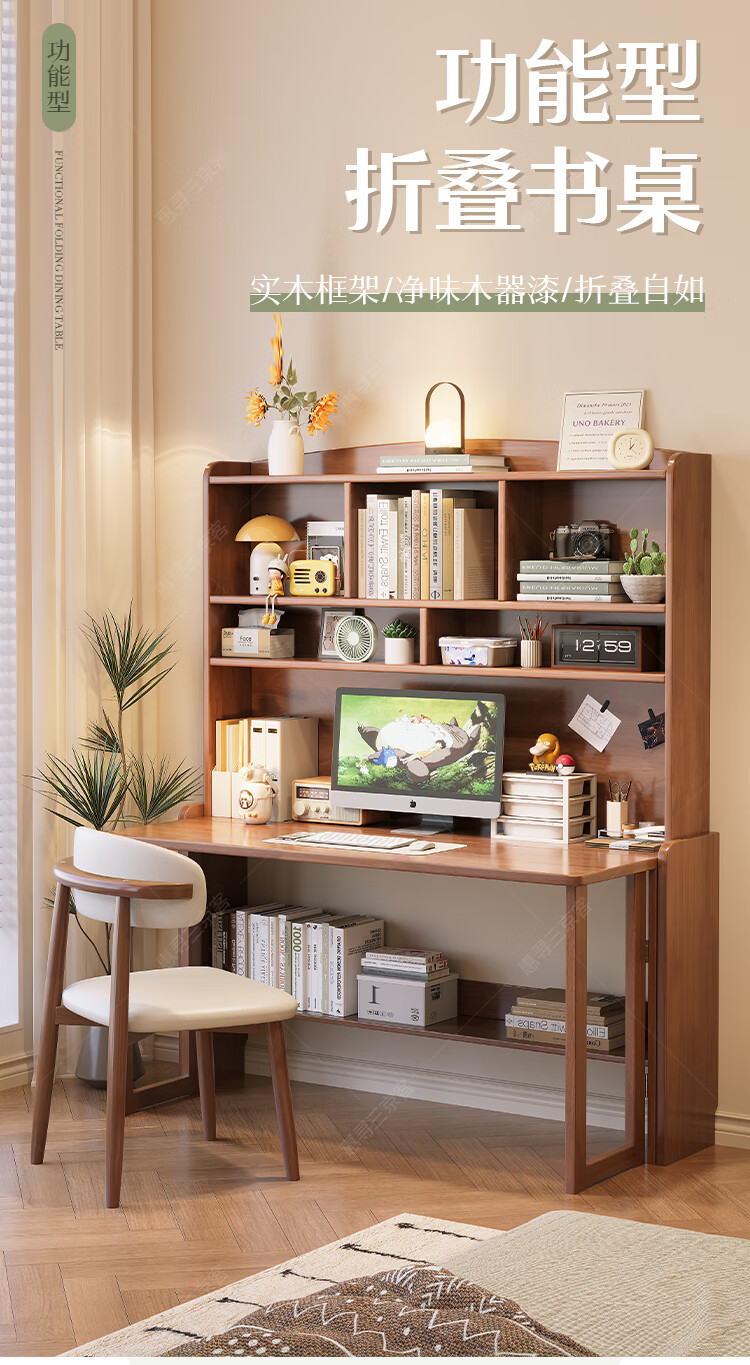 Huixun solid wood folding desk bookshelf integrated desk student computer desk home study table small apartment retractable abbreviation desk walnut color #folding desk + bookshelf 80cm*60cm*75cm total height 175cm