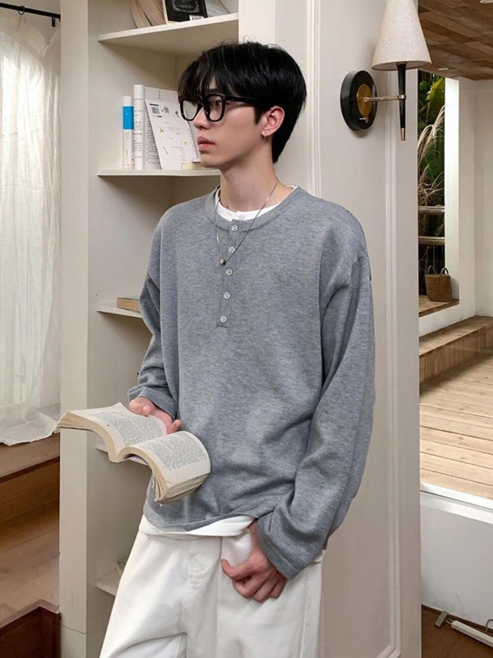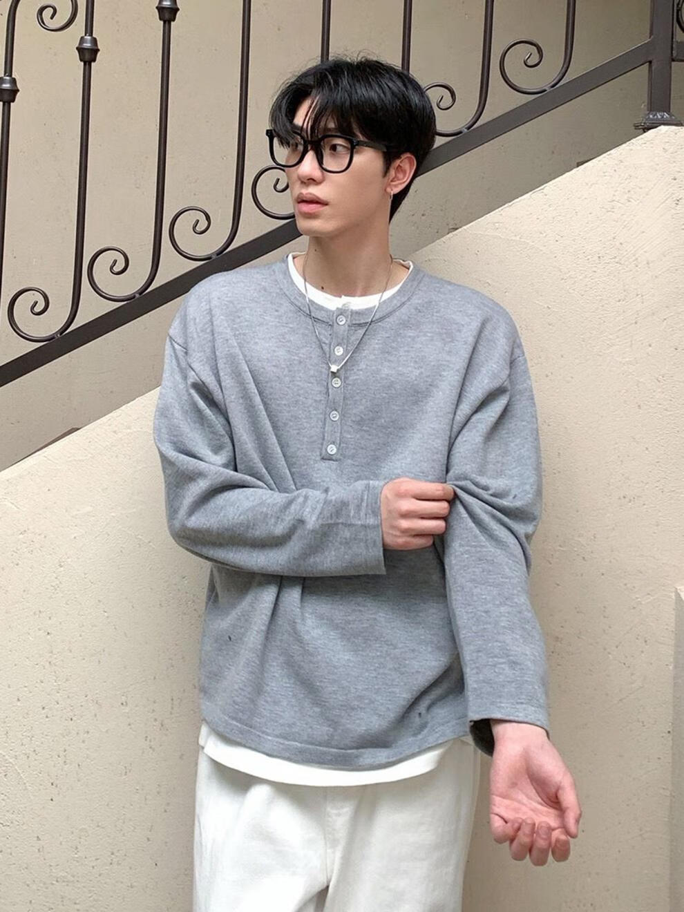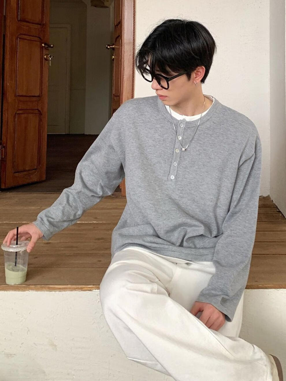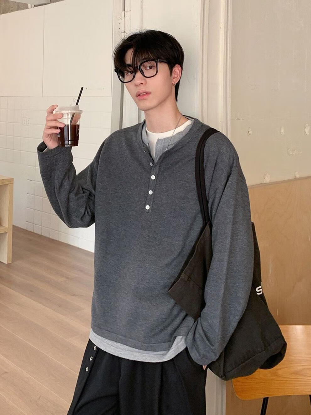 XUANSENTU fake two-piece henley sweatshirt men's autumn loose lazy style long-sleeved T-shirt American retro inner layering shirt glutinous beige upgraded model M