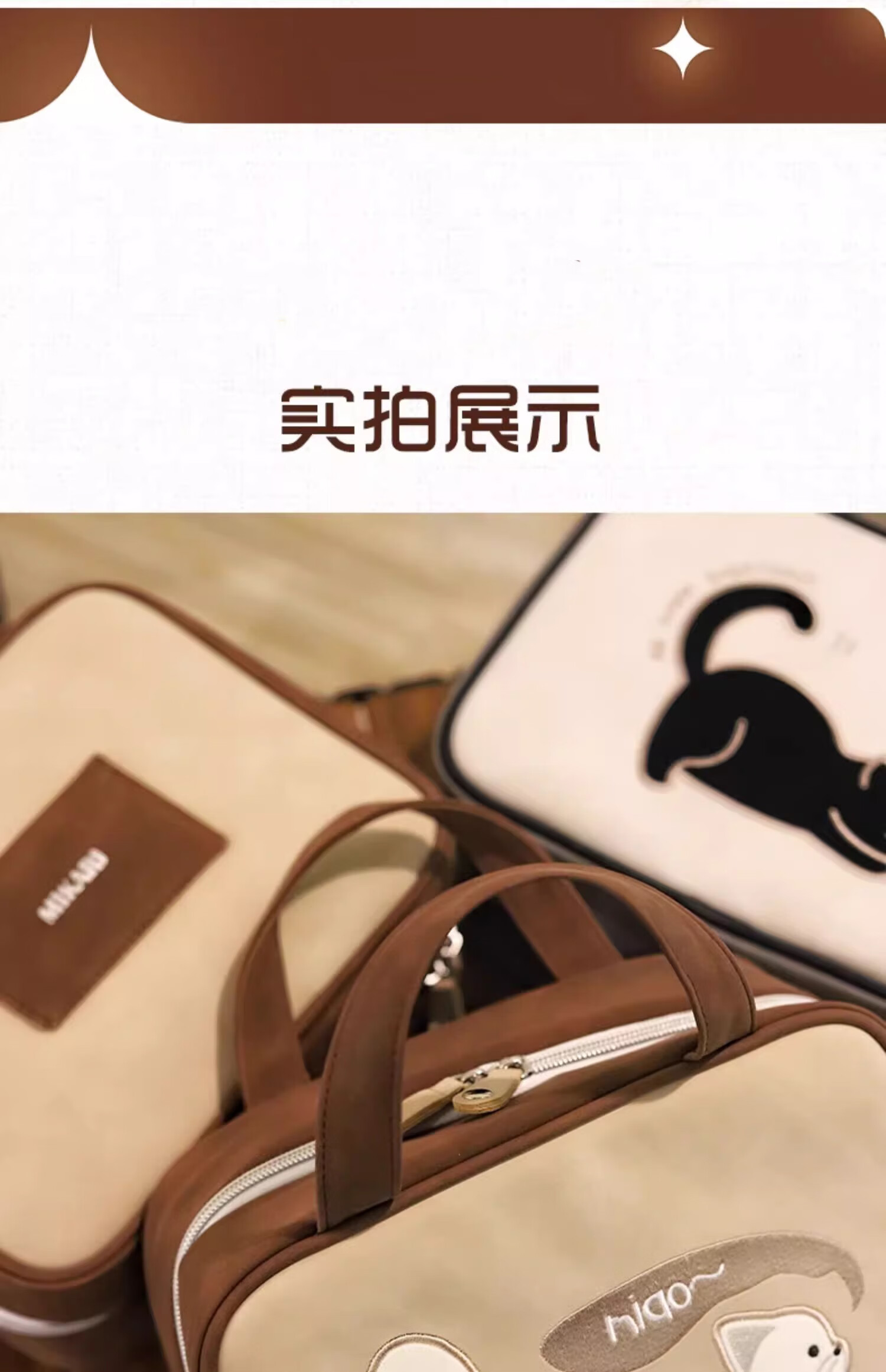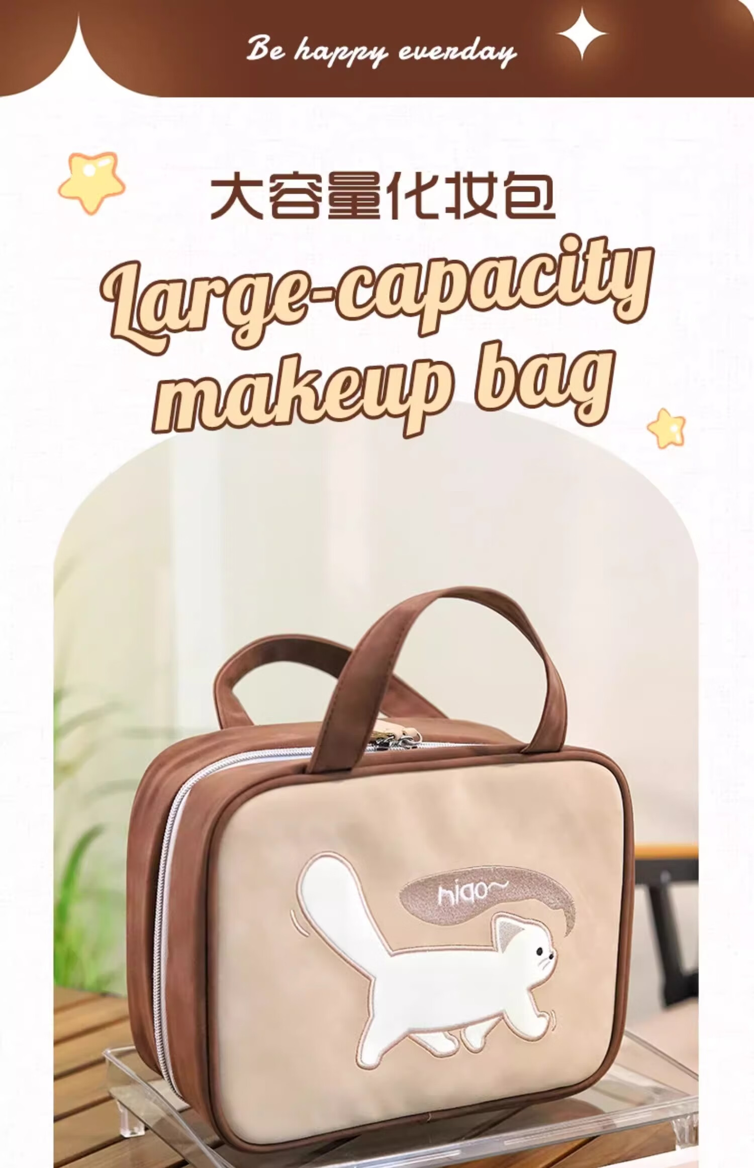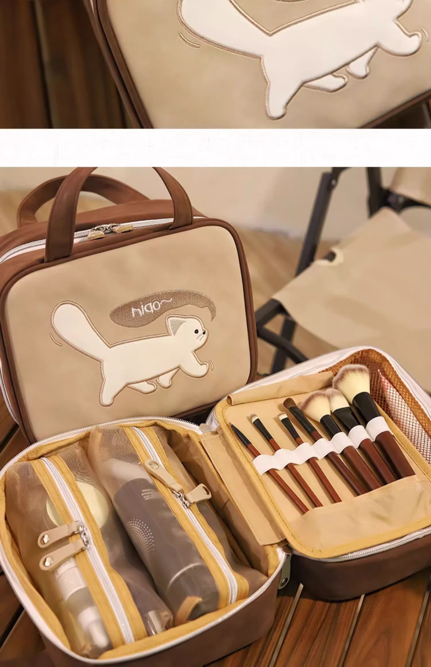 Light luxury cosmetic bag, portable zipper cosmetic bag, waterproof large-capacity storage bag, handbag for makeup artists, kitten cosmetic bag, brown