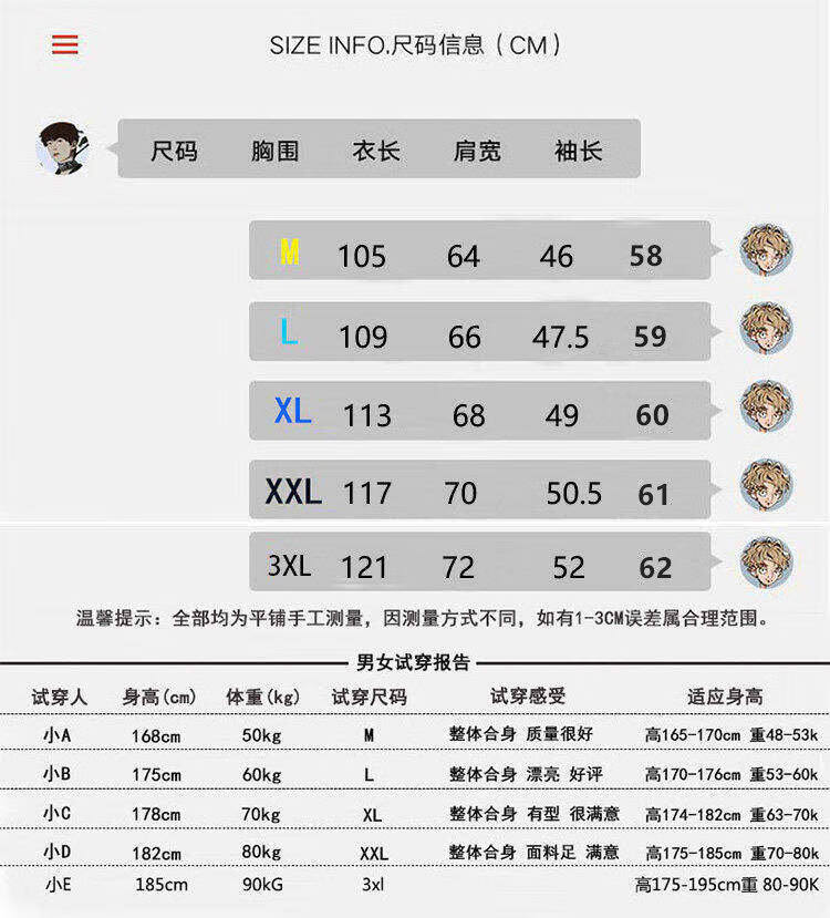 China (cm) 165 / 88-90 170 / 96-98 175 / 108-110 180 / 118-122 185 / 126-130