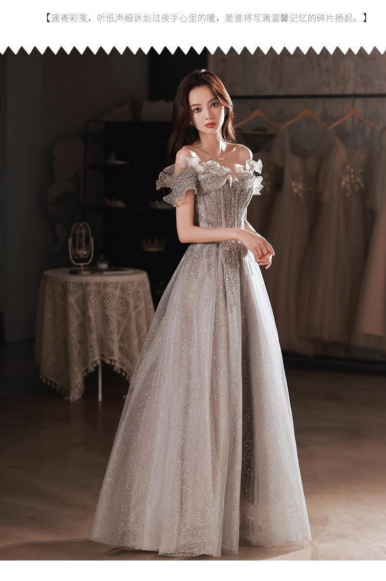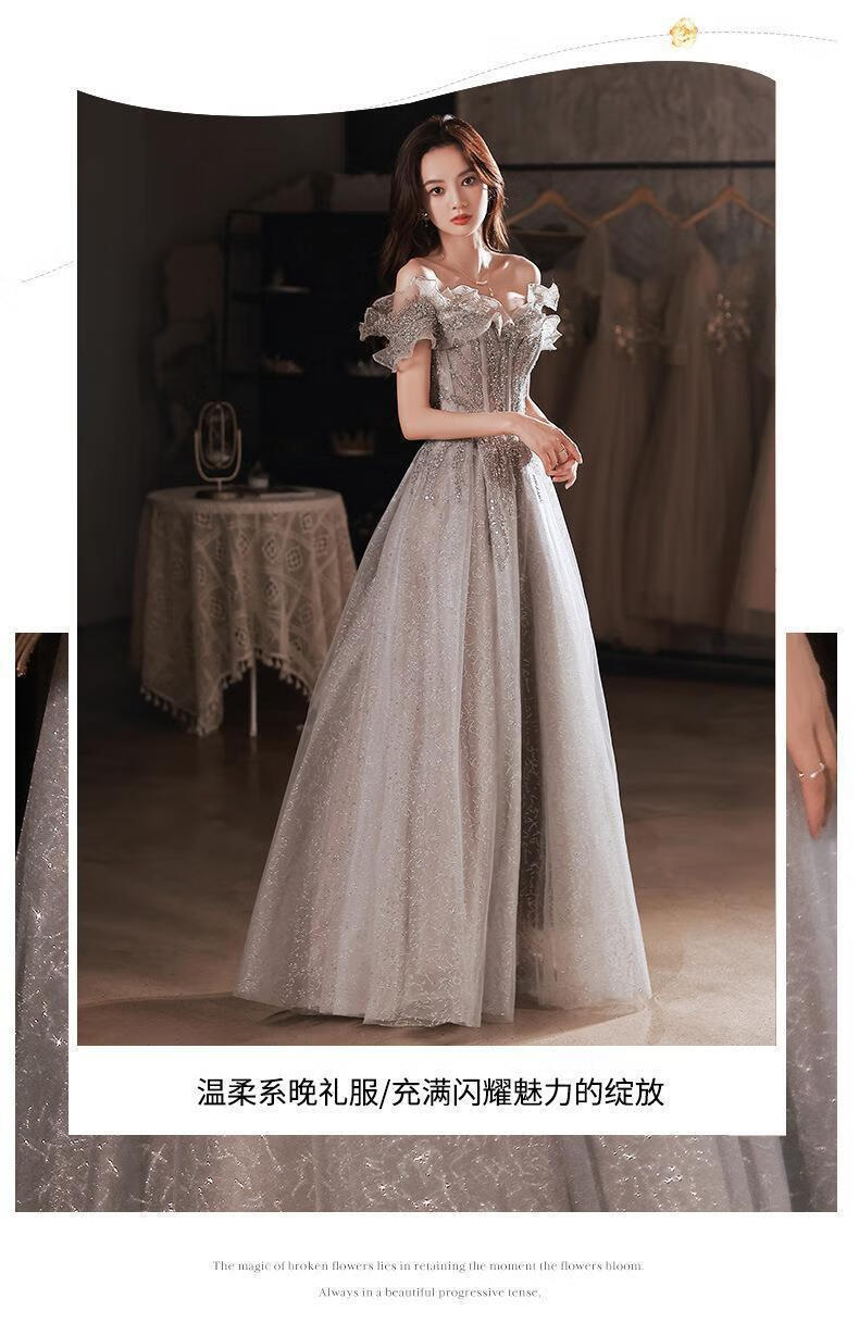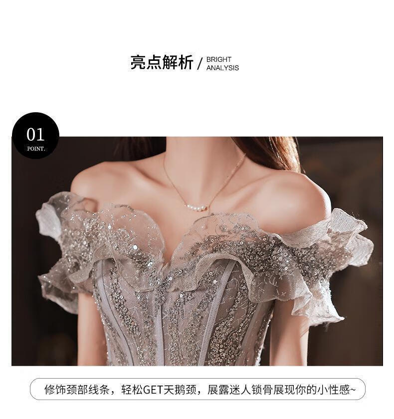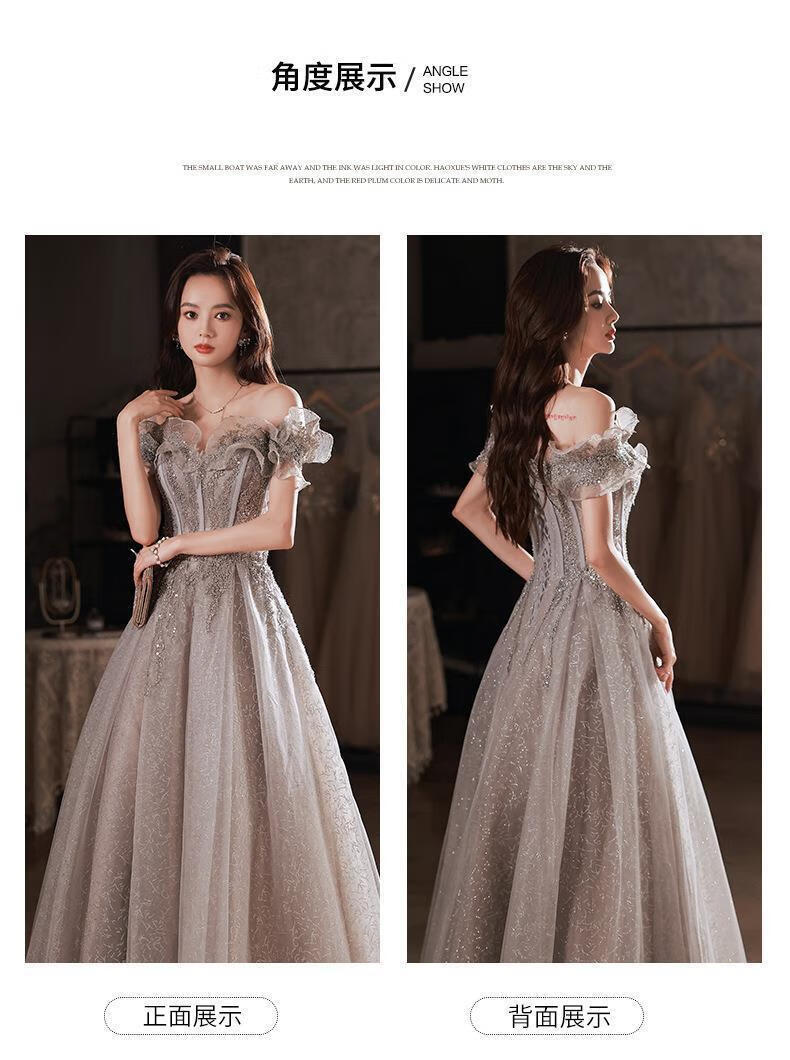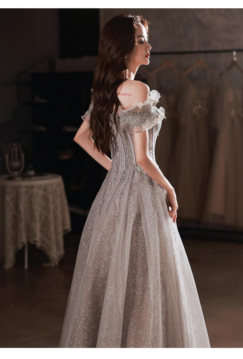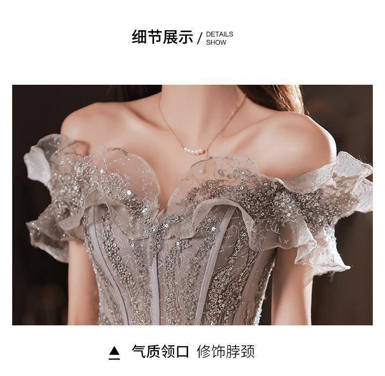 Gray banquet evening dress 2025 new one-shoulder elegant annual meeting host fairy temperament birthday party dress gray long S
