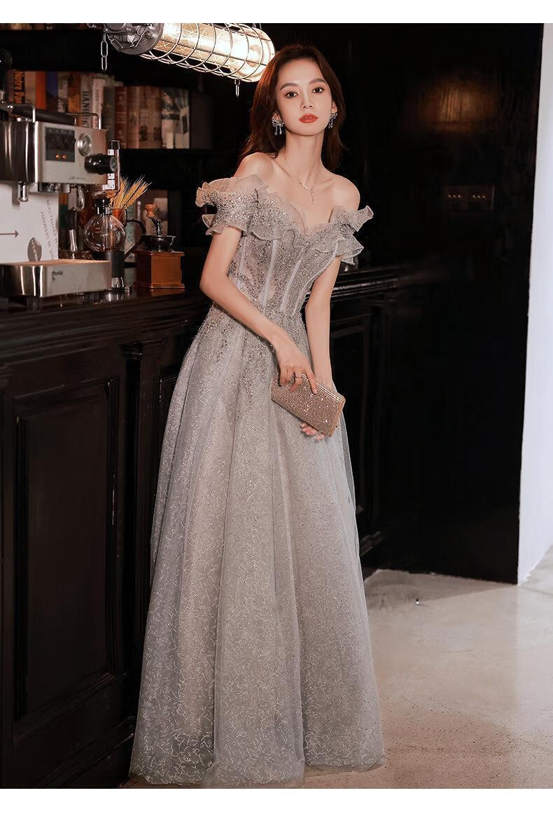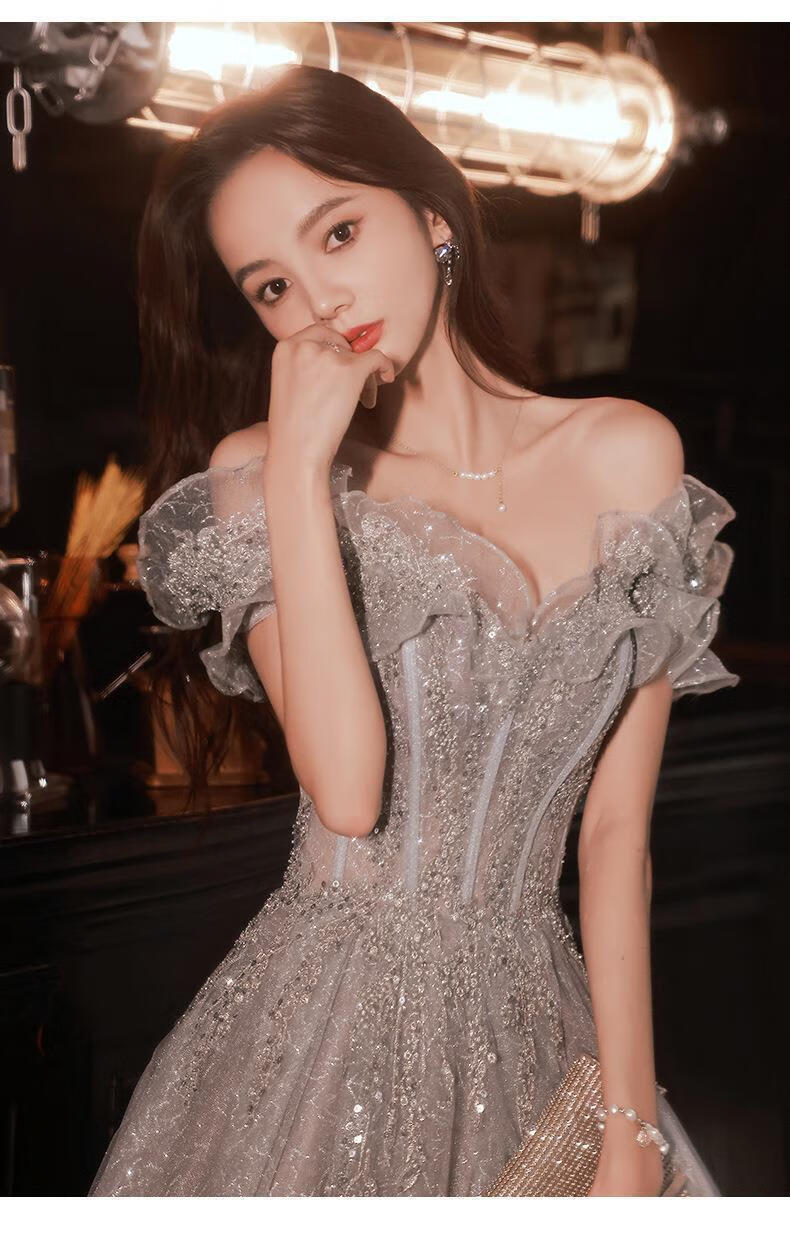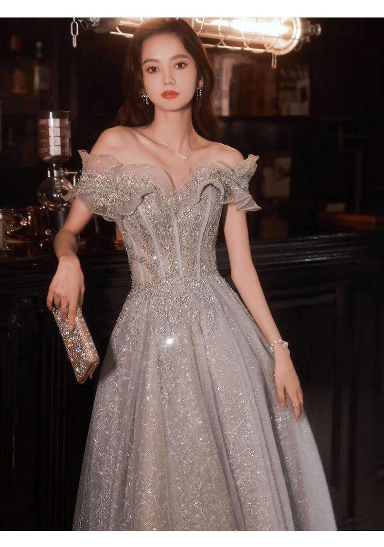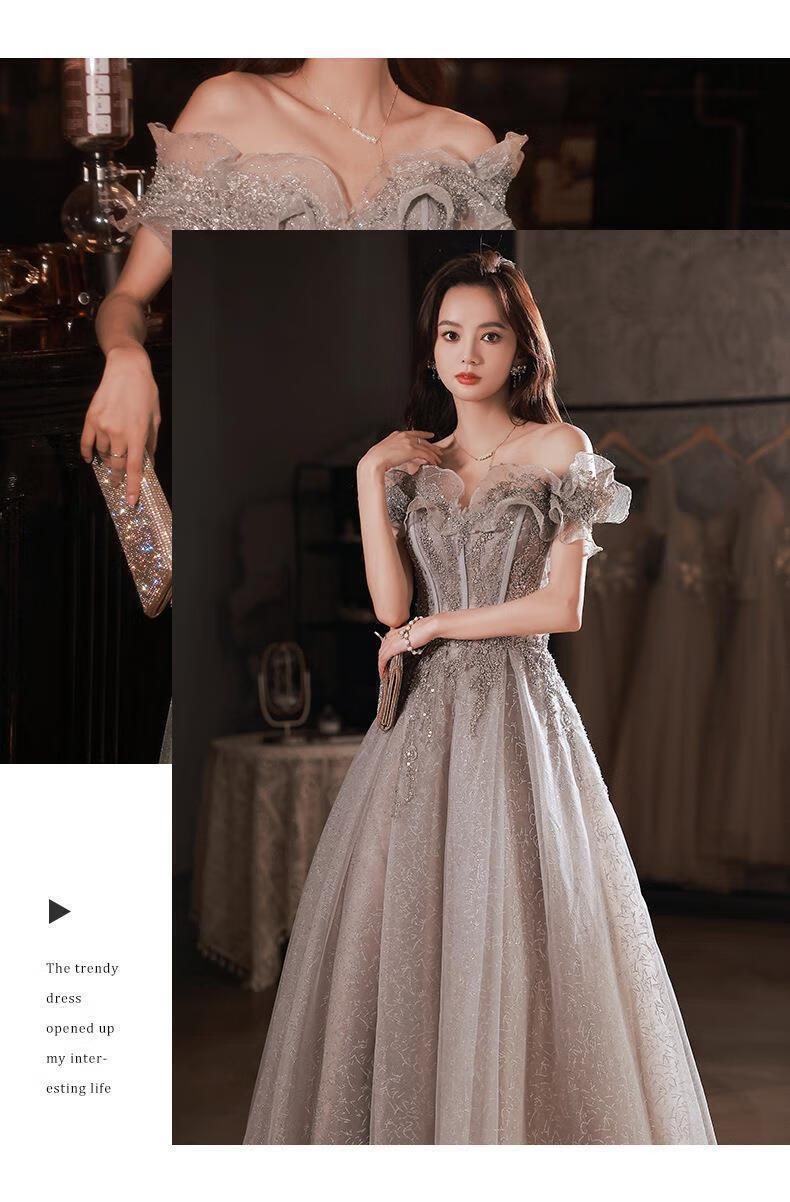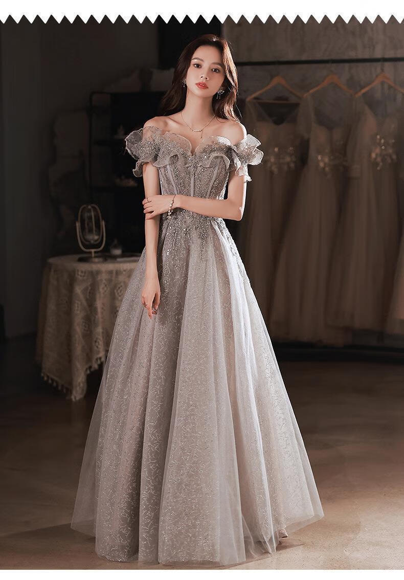 Gray banquet evening dress 2025 new one-shoulder elegant annual meeting host fairy temperament birthday party dress gray long S