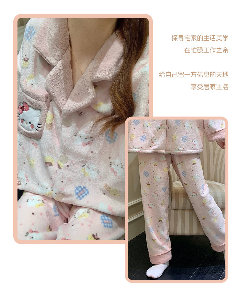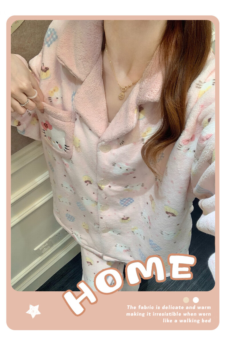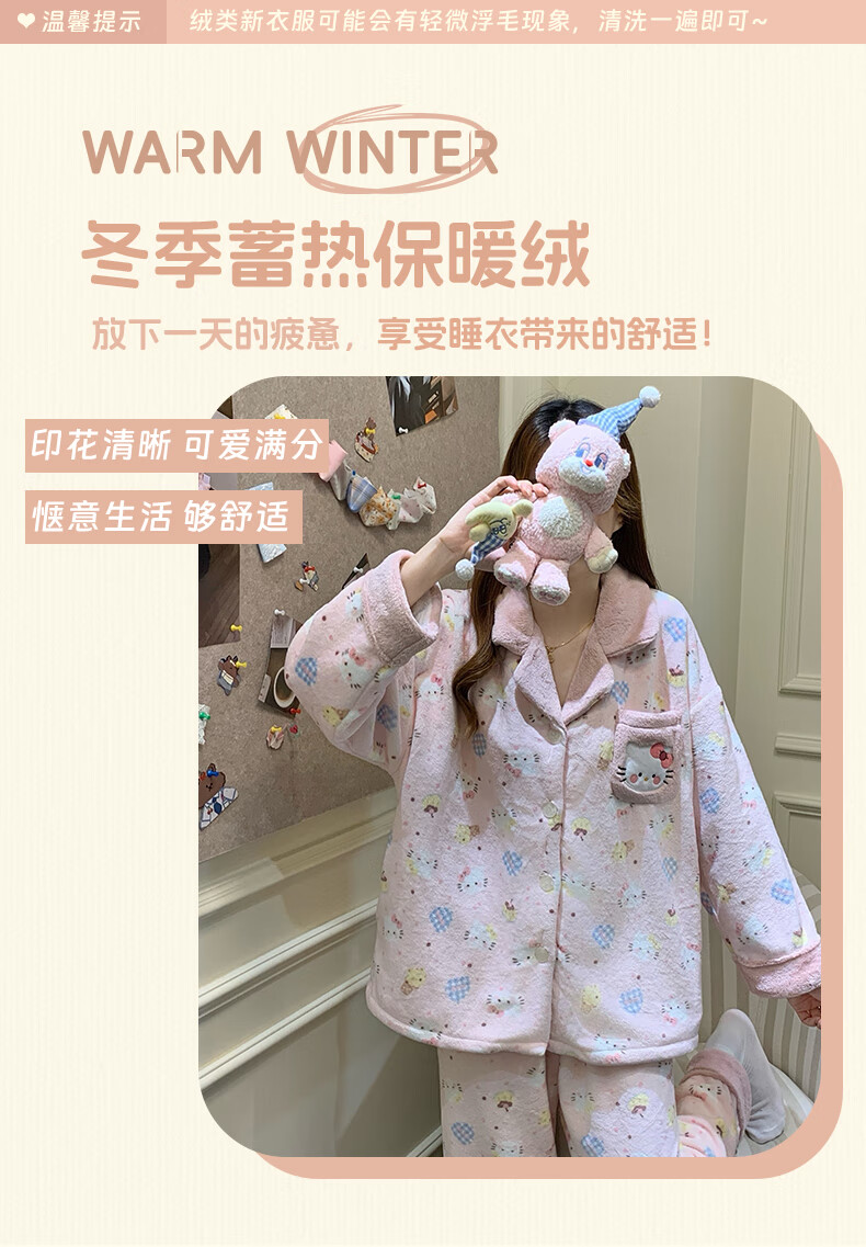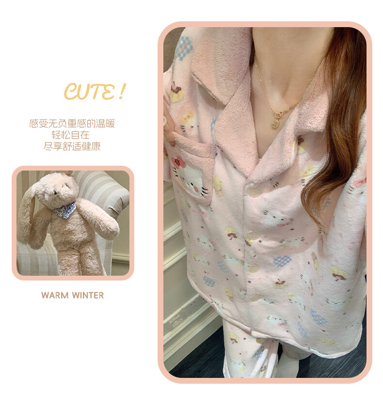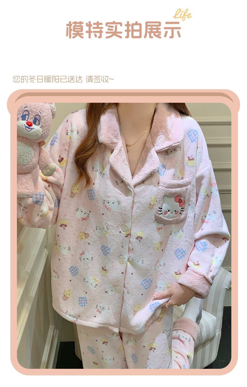 Also about autumn and winter pajamas for women, plus velvet and thickened coral velvet long-sleeved trousers, sweet and cute Hellokitty home clothes 2637 Sweetheart Pink Cat M