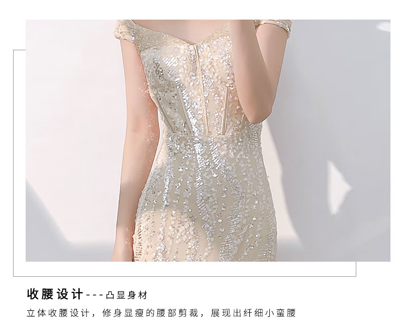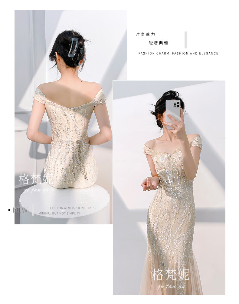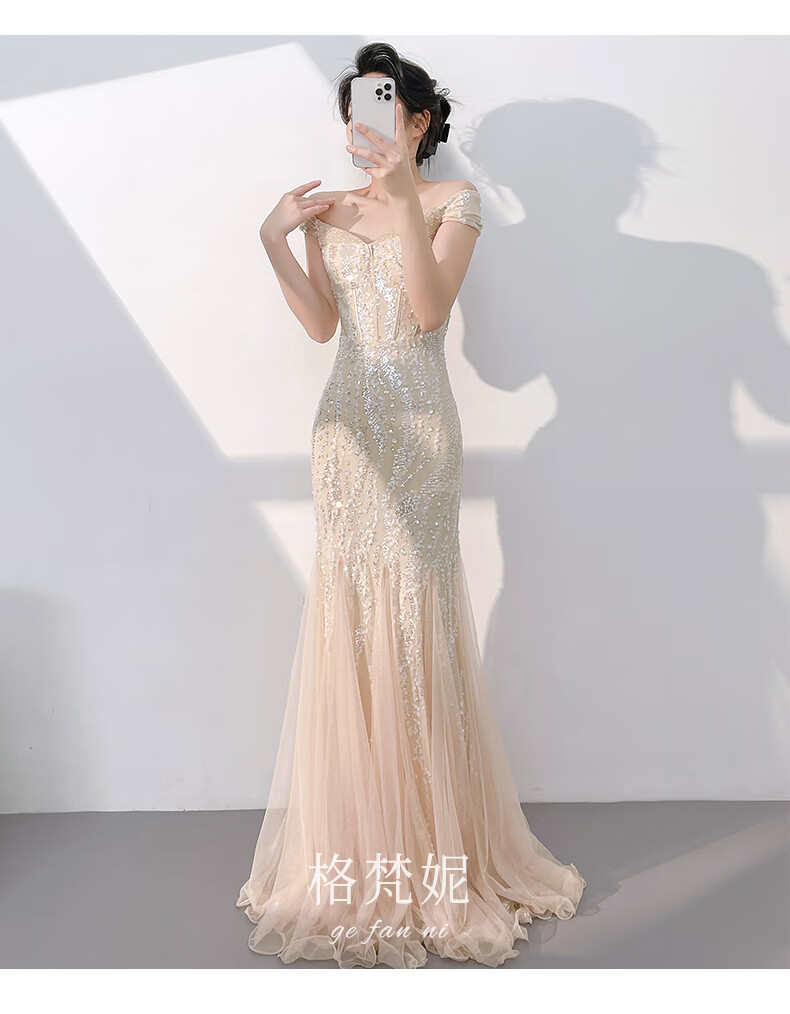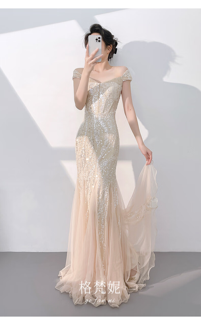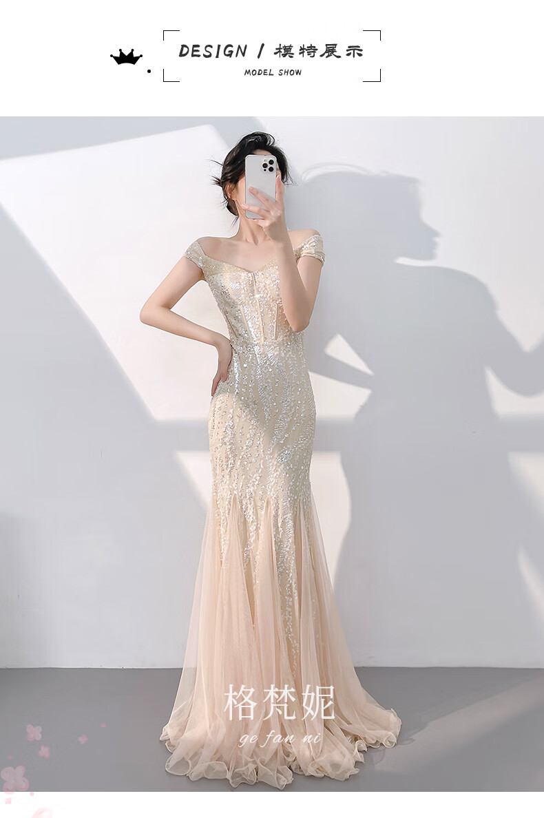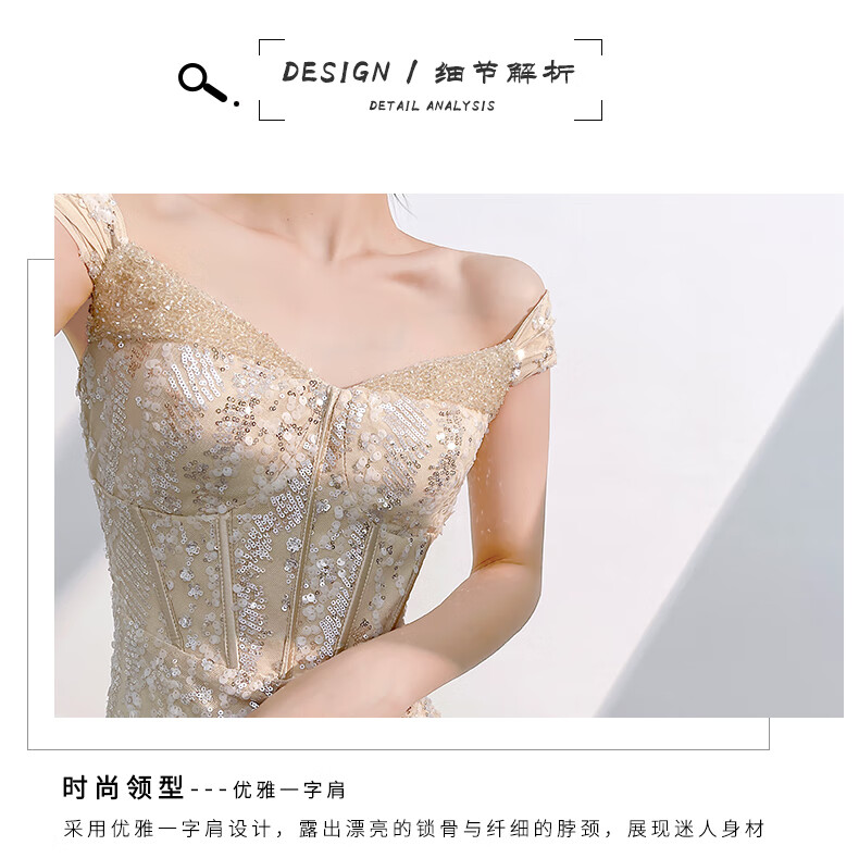 ACJK champagne color evening dress for women 2025 new style, stunning temperament, host one-shoulder fishtail sequined long dress champagne color_ready in stock L