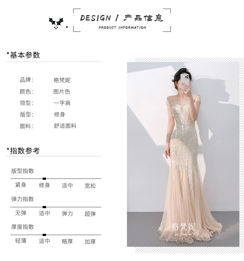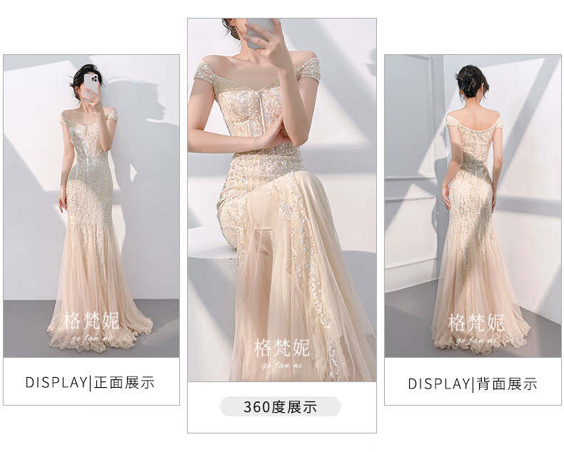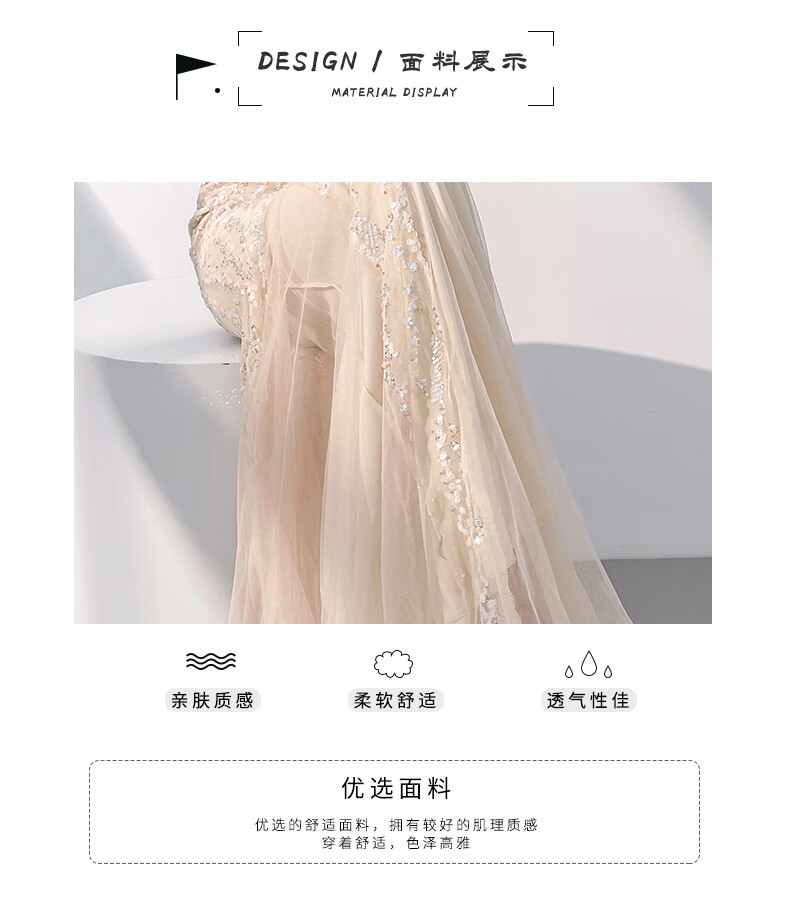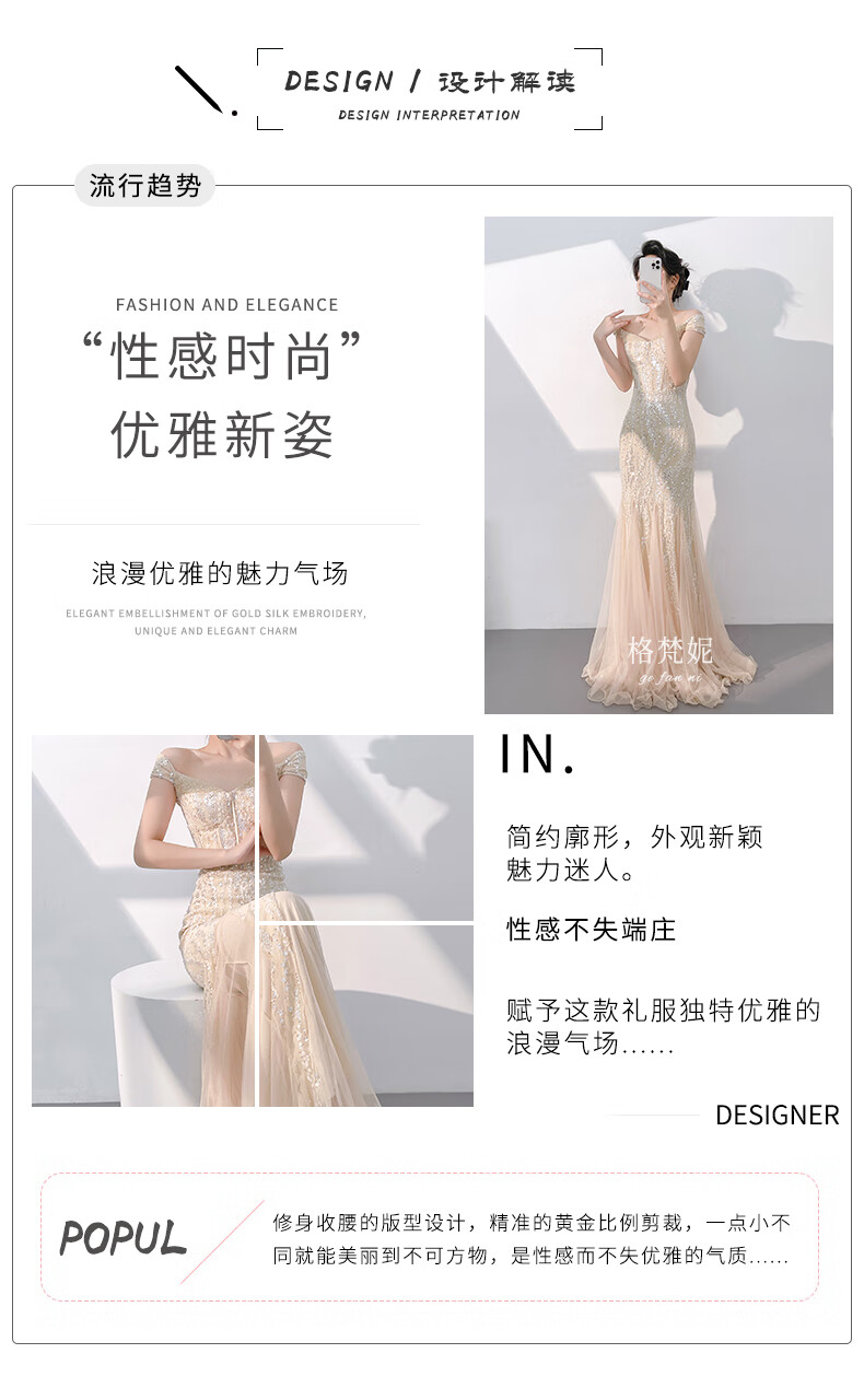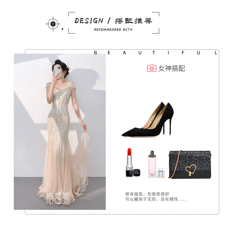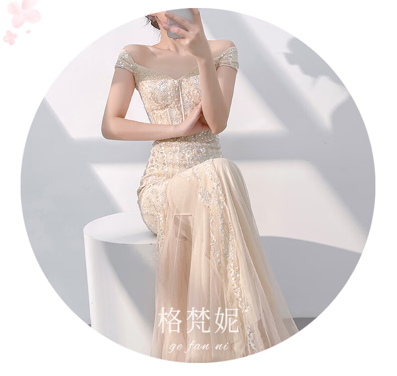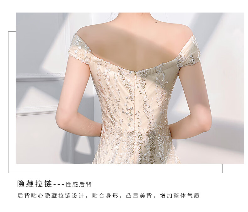 ACJK champagne color evening dress for women 2025 new style, stunning temperament, host one-shoulder fishtail sequined long dress champagne color_ready in stock L