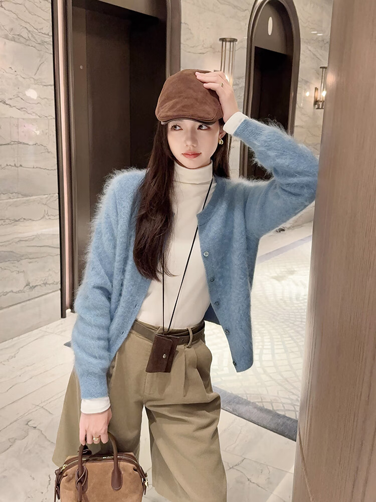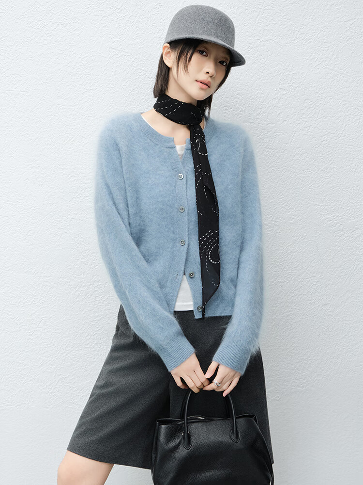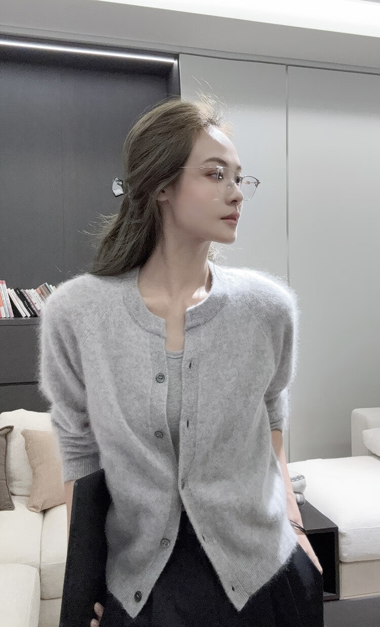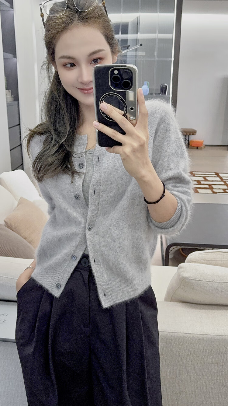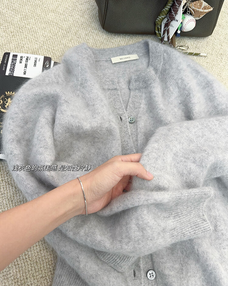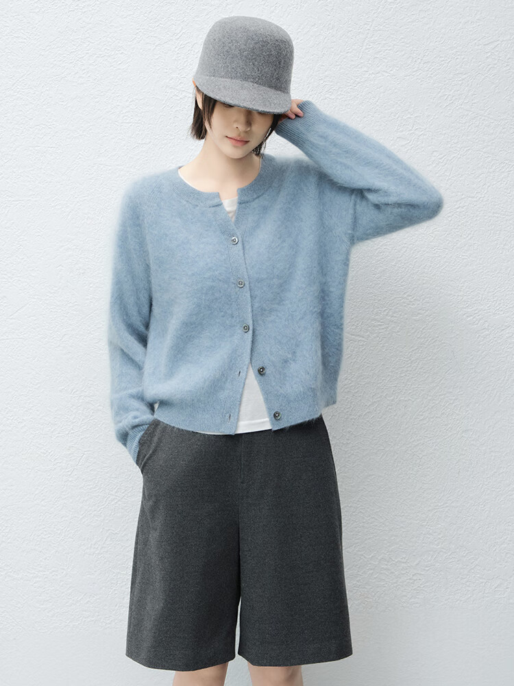 MEIYANG cloud-like cashmere cardigan, all cashmere brushed round neck buttoned short sweater, soft and gentle winter style, blue gray M