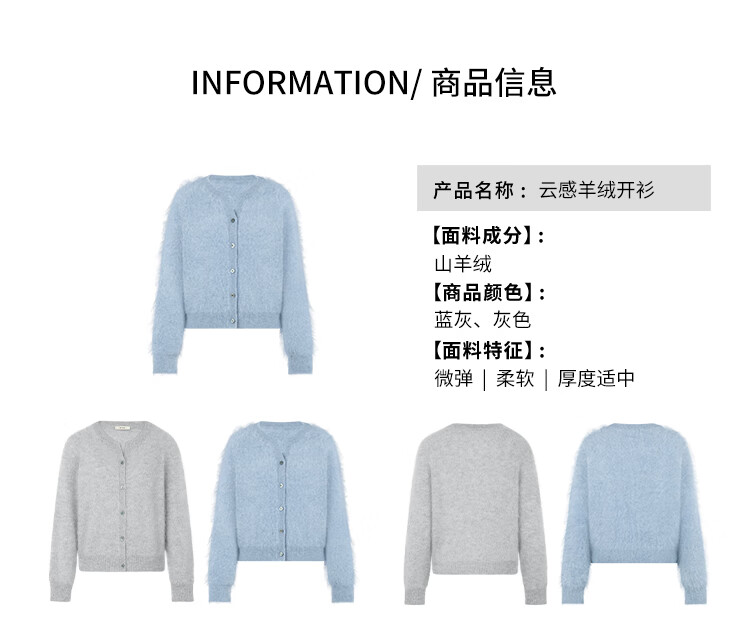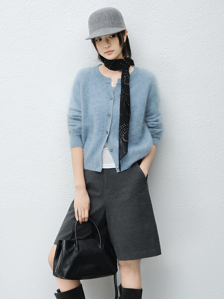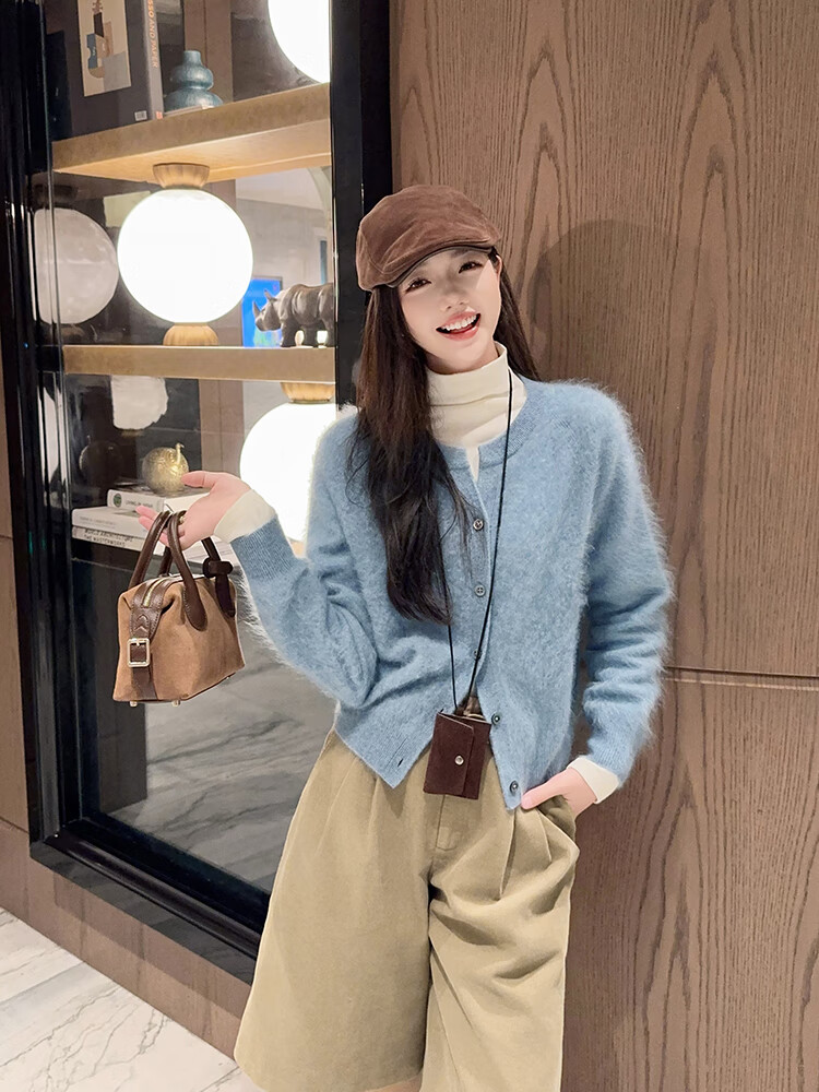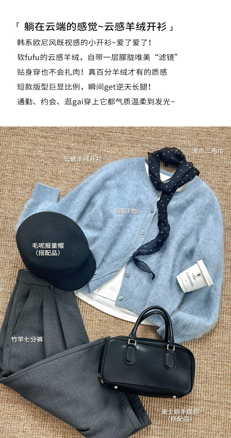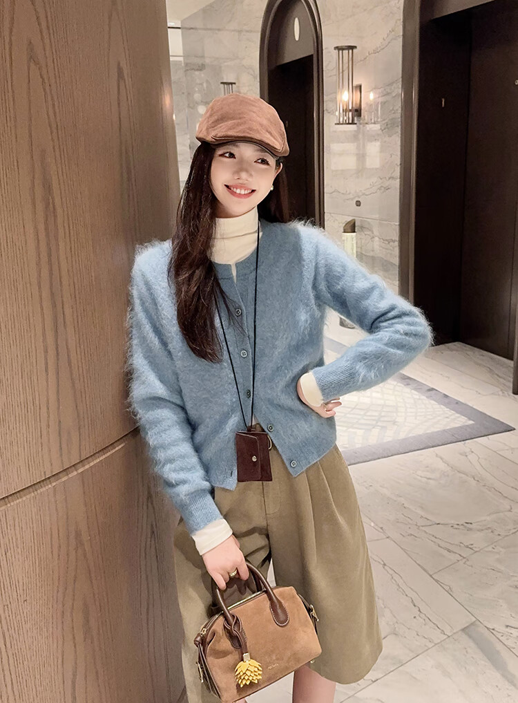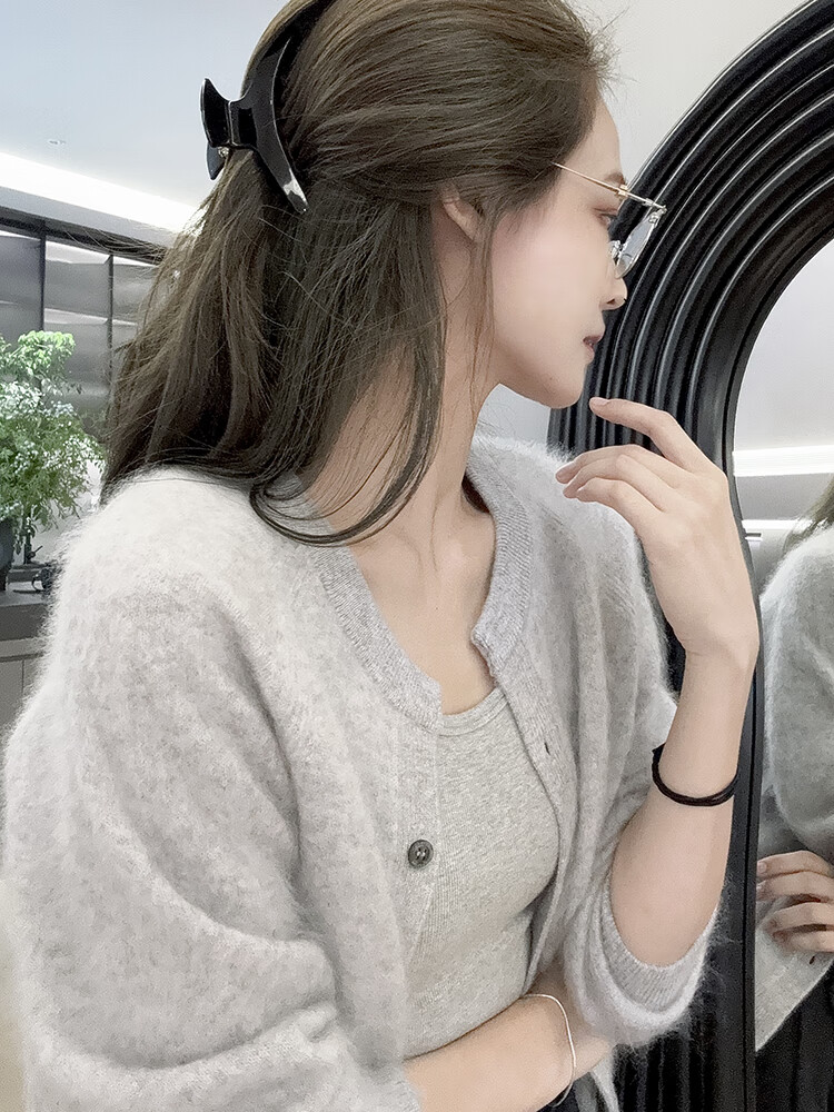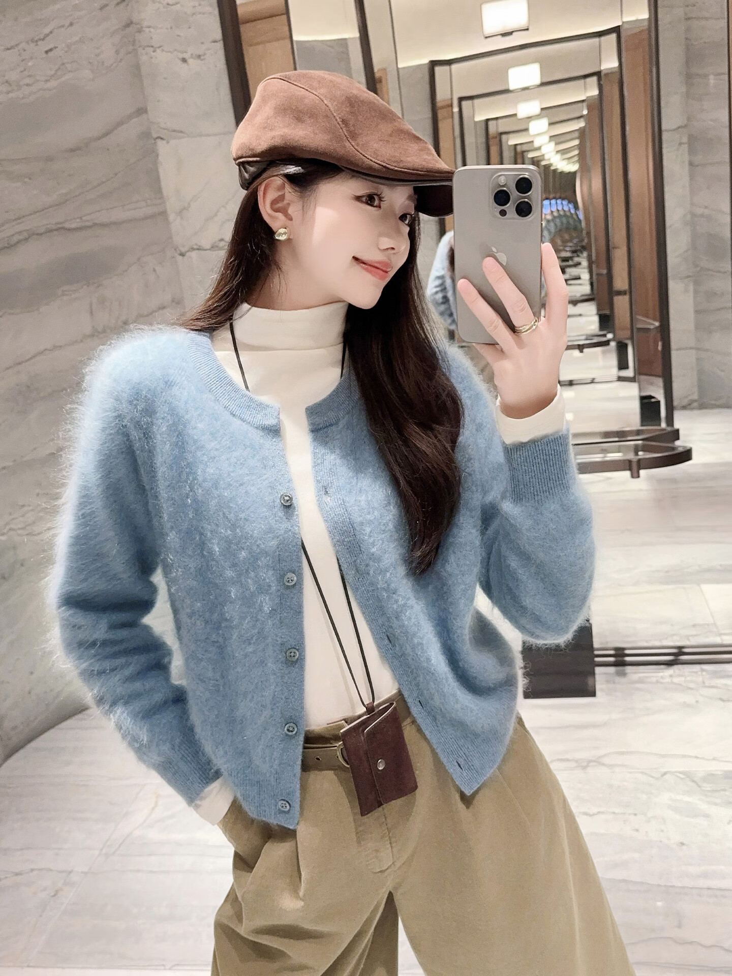 MEIYANG cloud-like cashmere cardigan, all cashmere brushed round neck buttoned short sweater, soft and gentle winter style, blue gray M