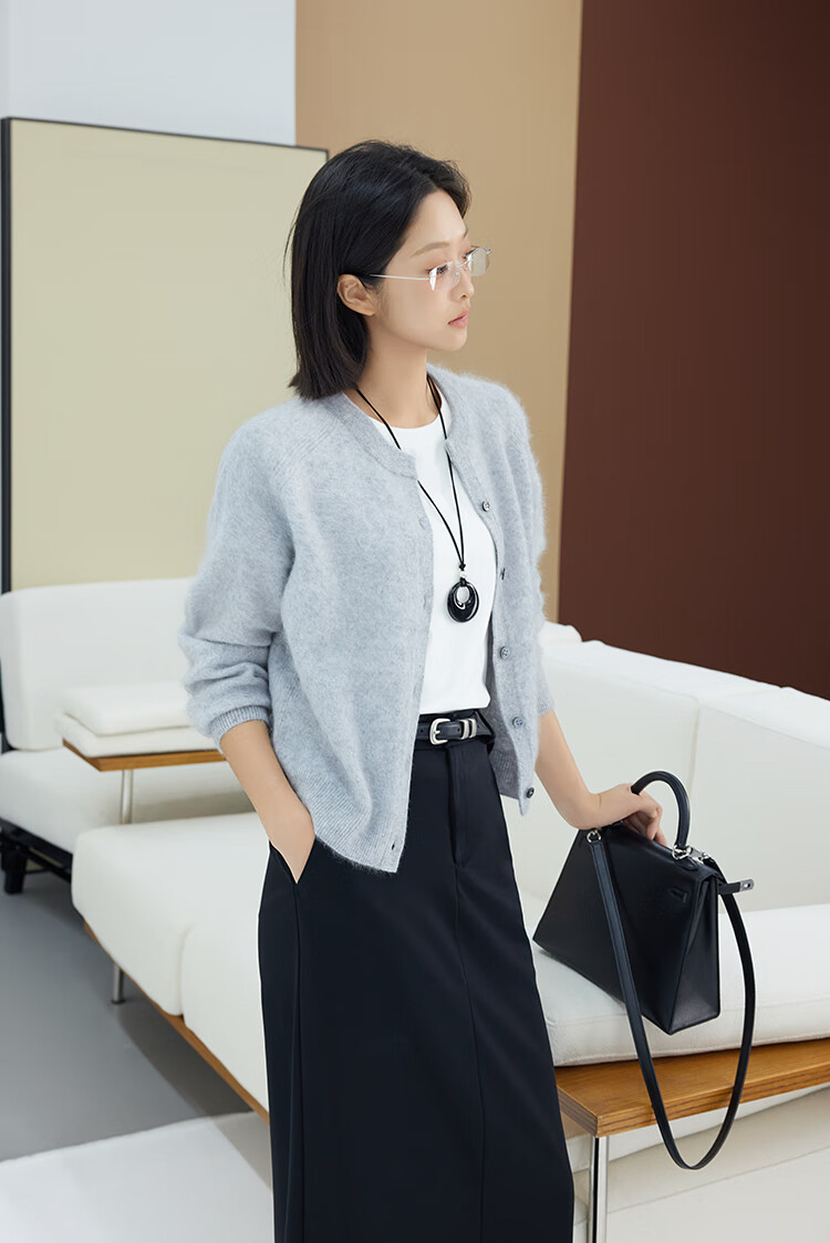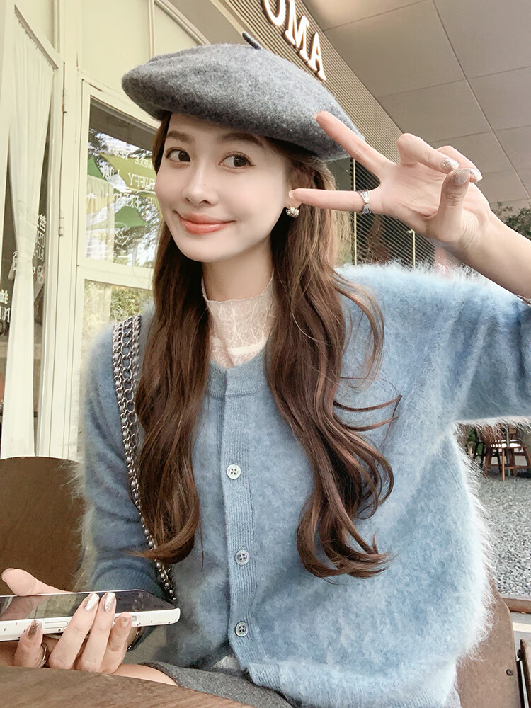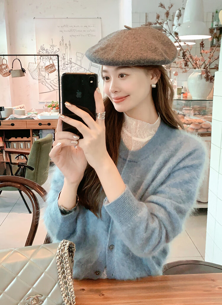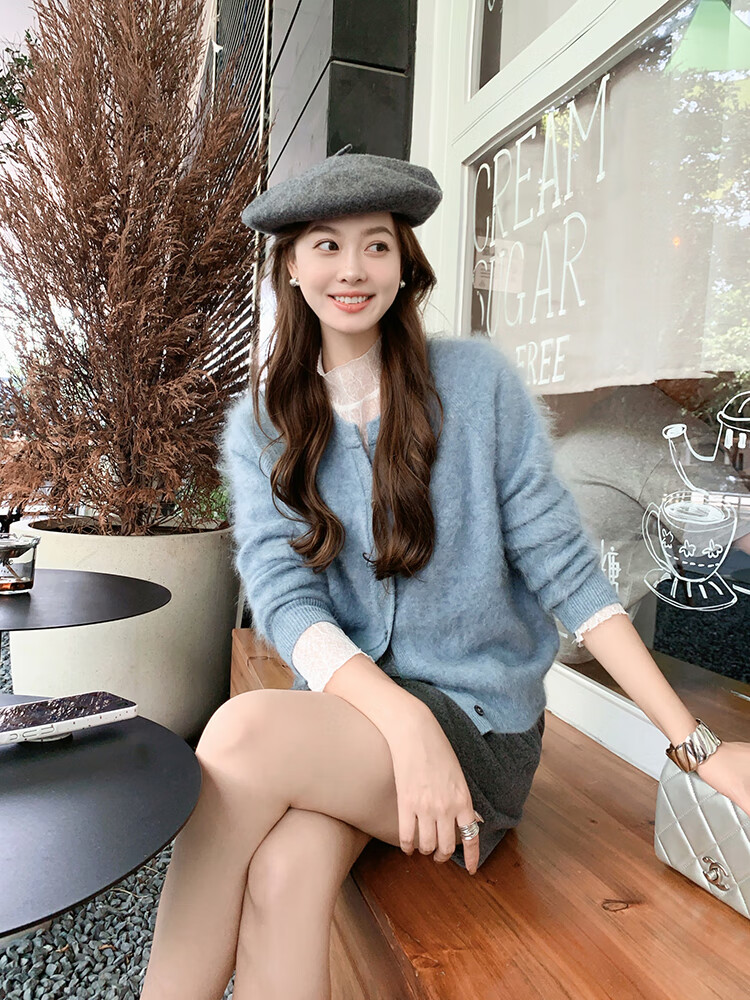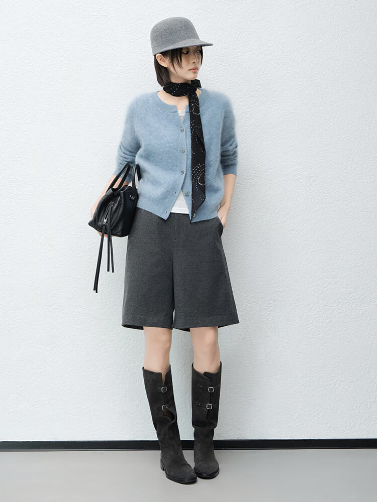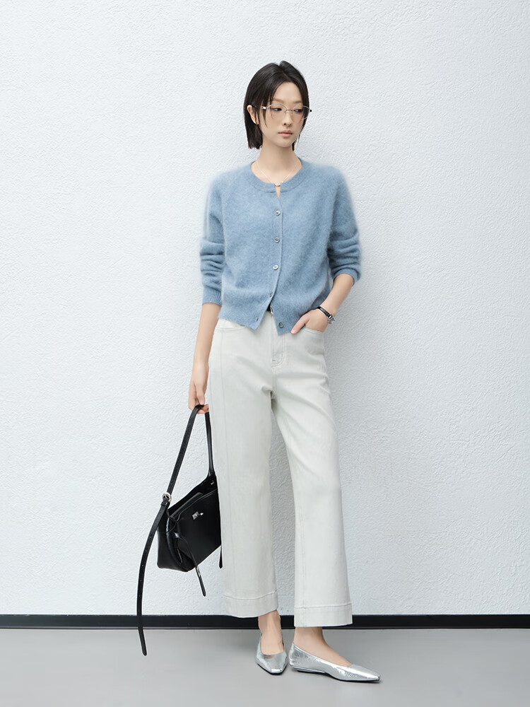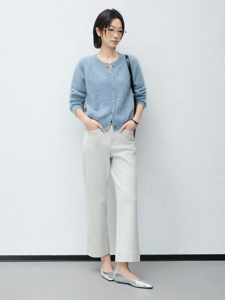 MEIYANG cloud-like cashmere cardigan, all cashmere brushed round neck buttoned short sweater, soft and gentle winter style, blue gray M