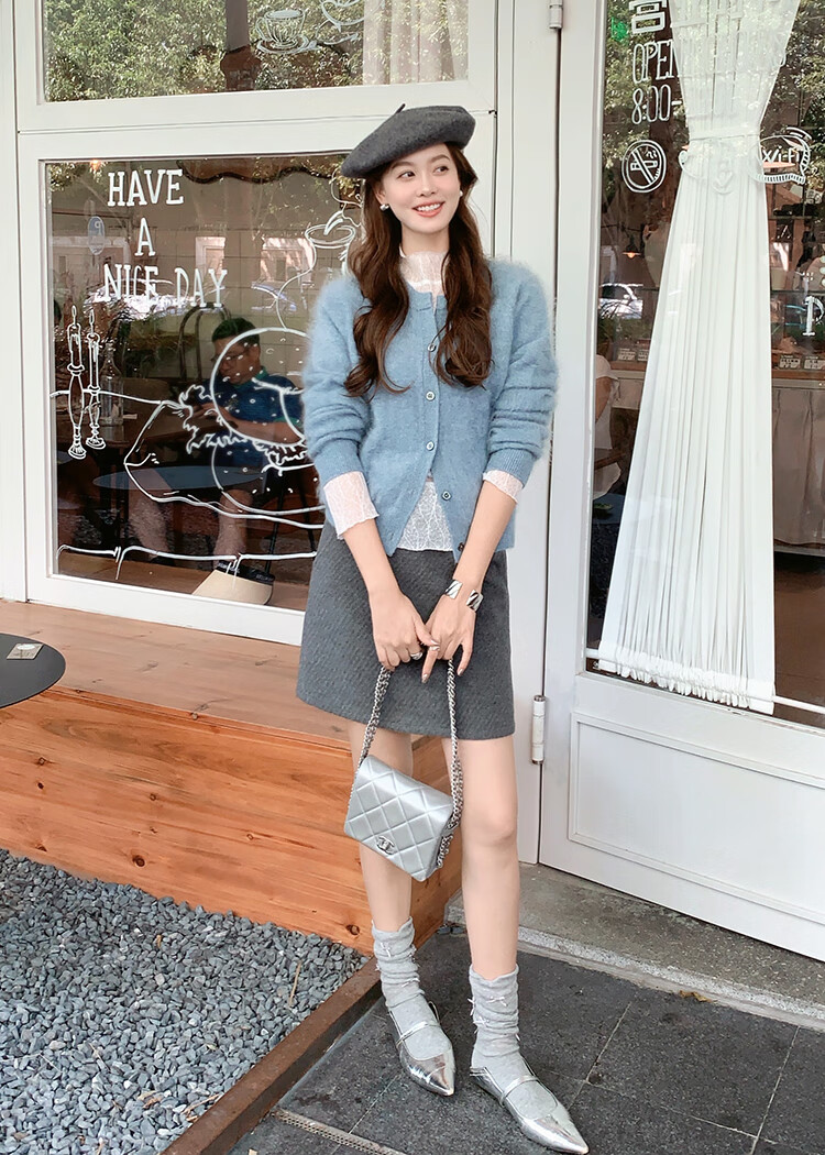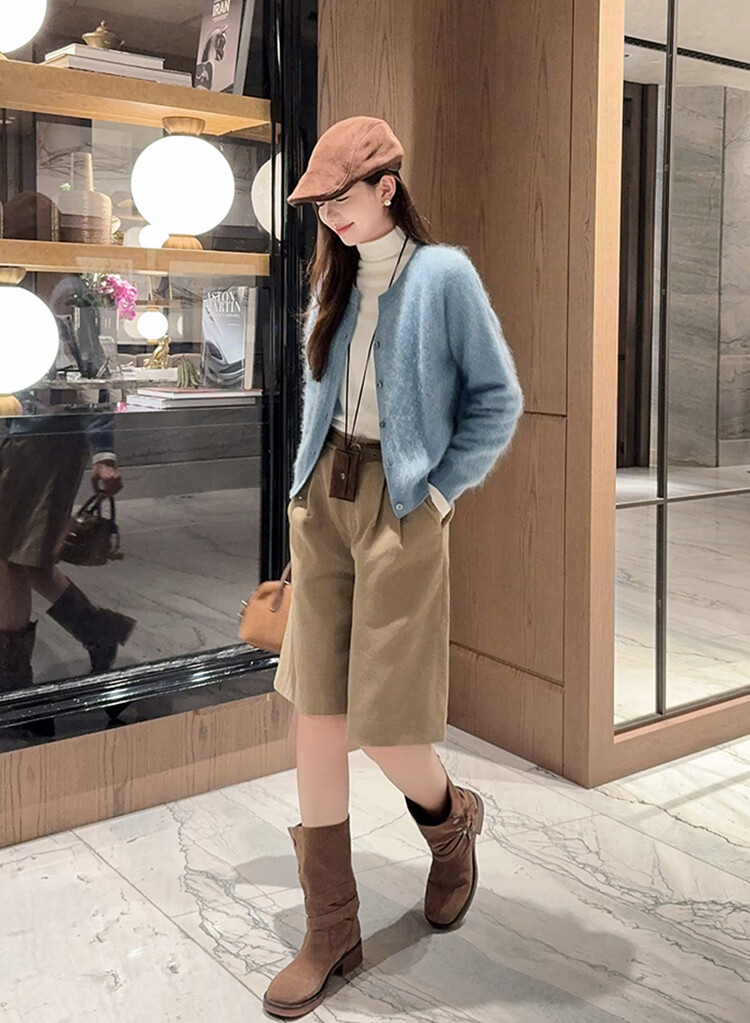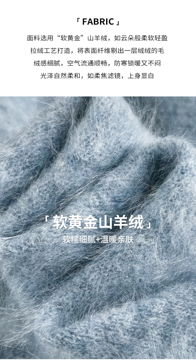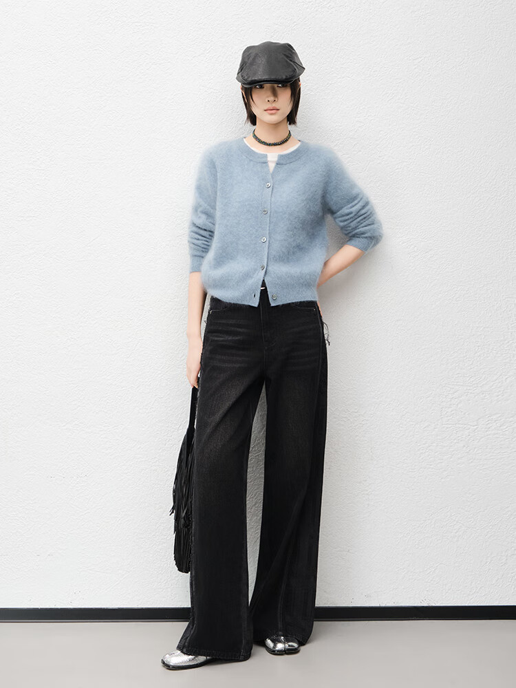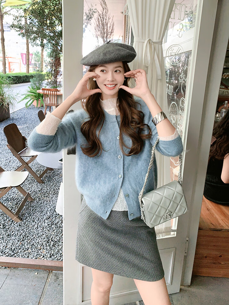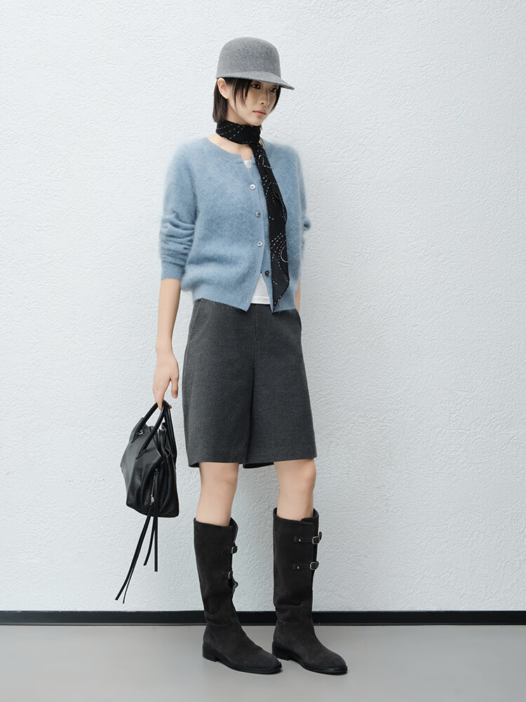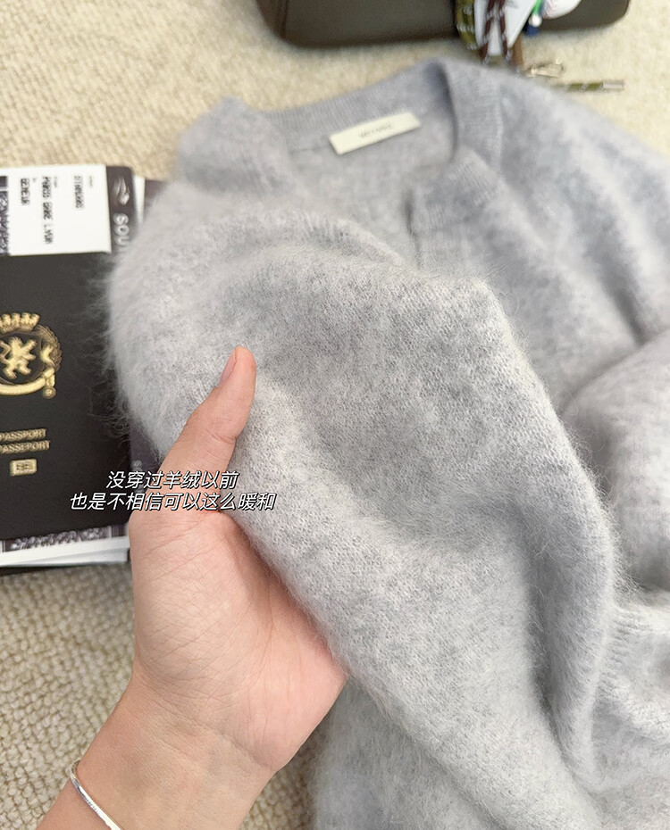 MEIYANG cloud-like cashmere cardigan, all cashmere brushed round neck buttoned short sweater, soft and gentle winter style, blue gray M