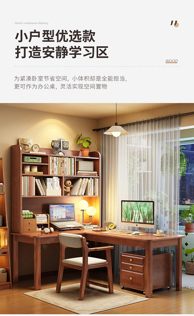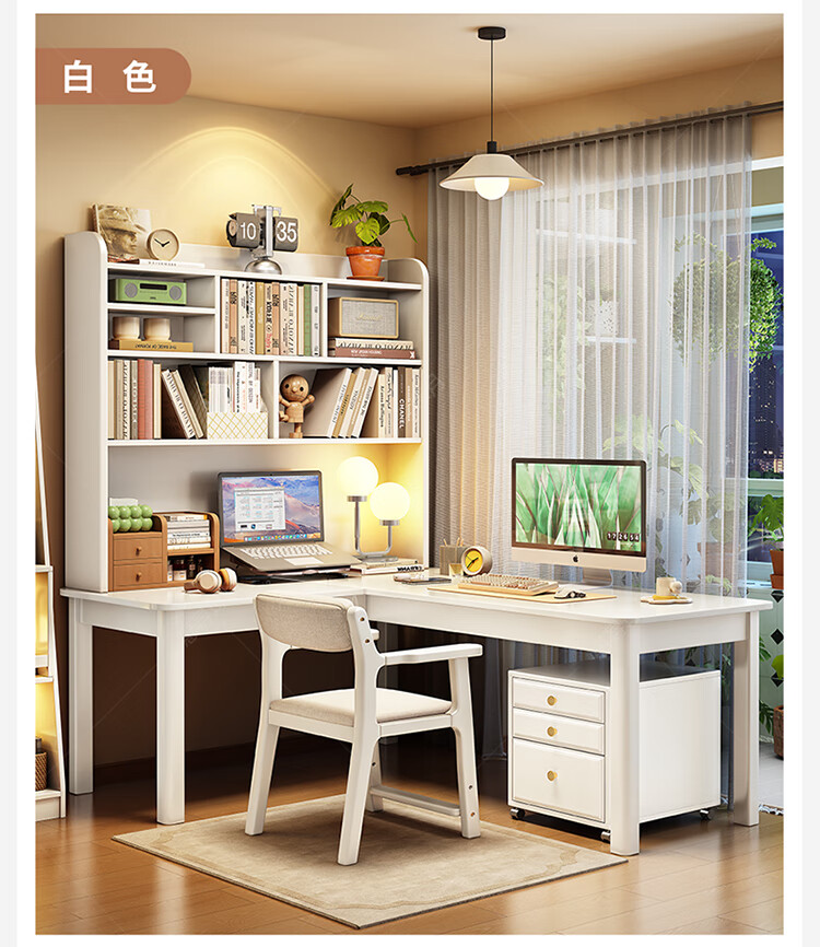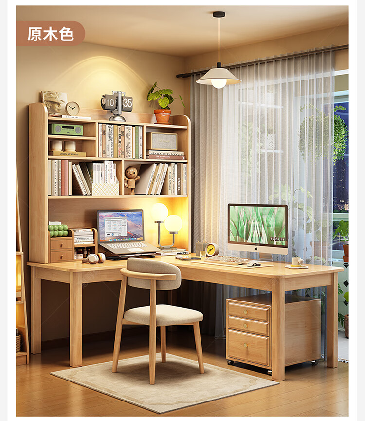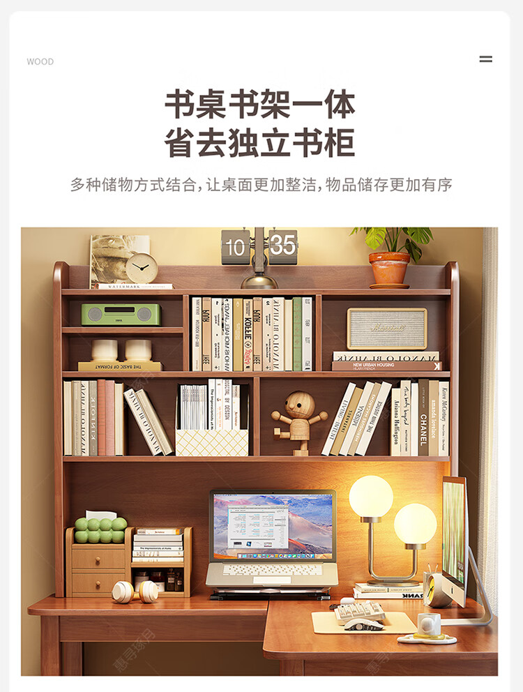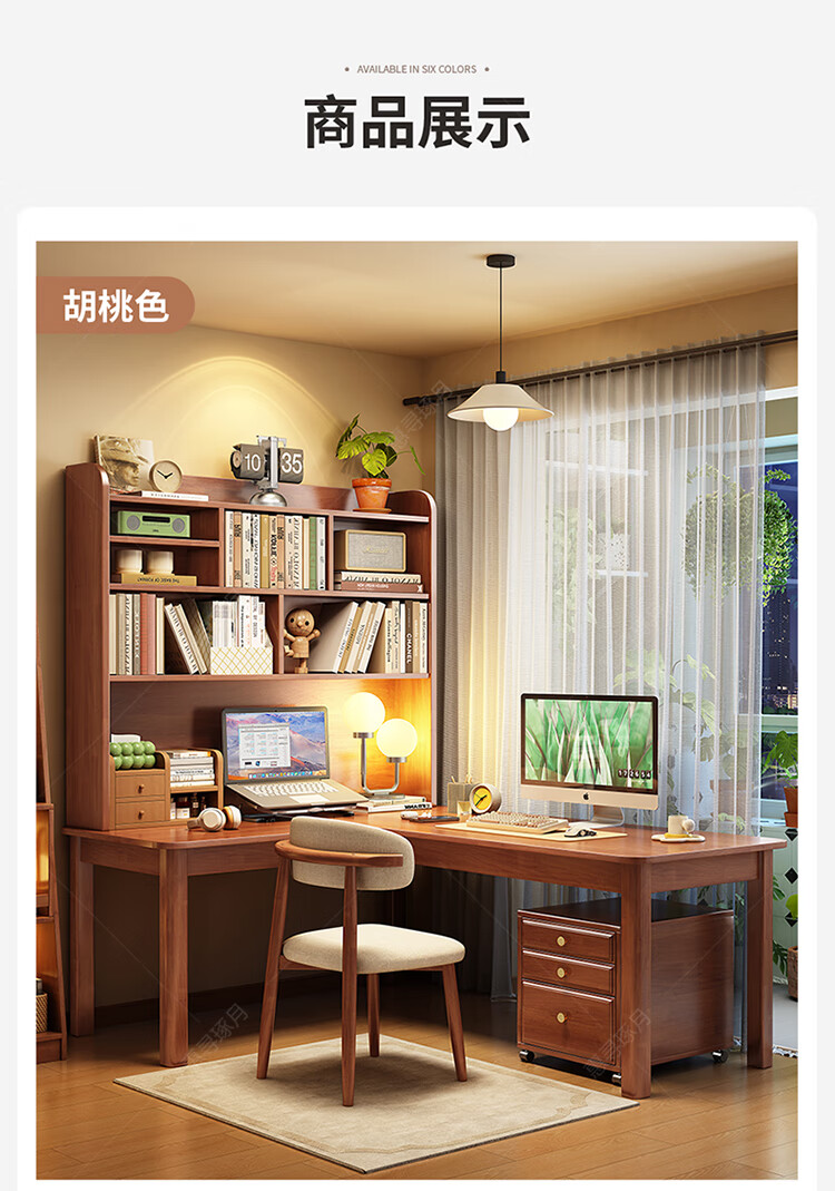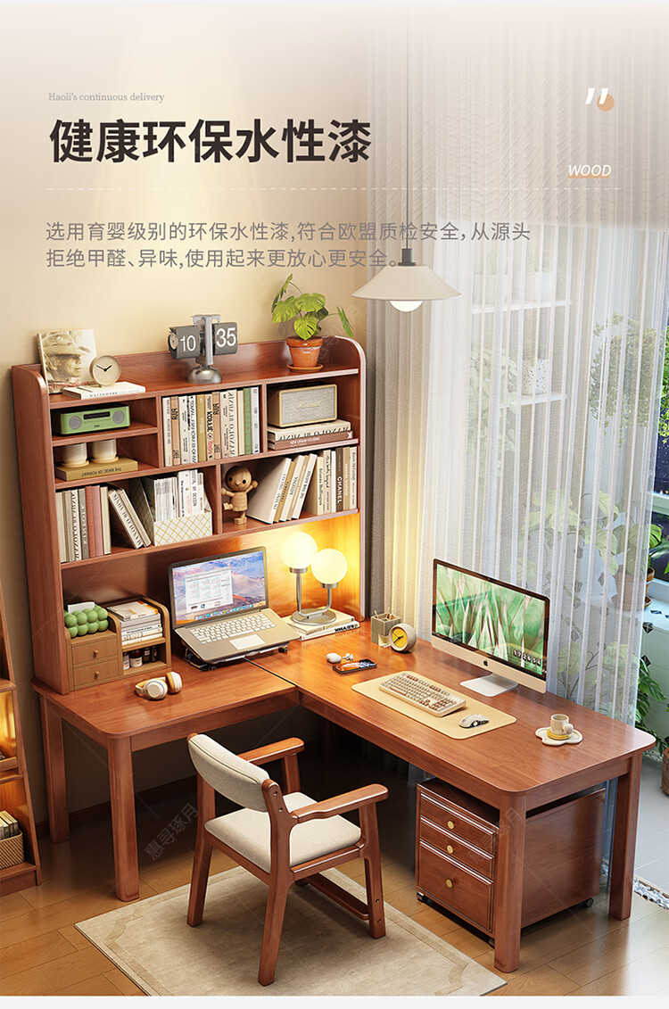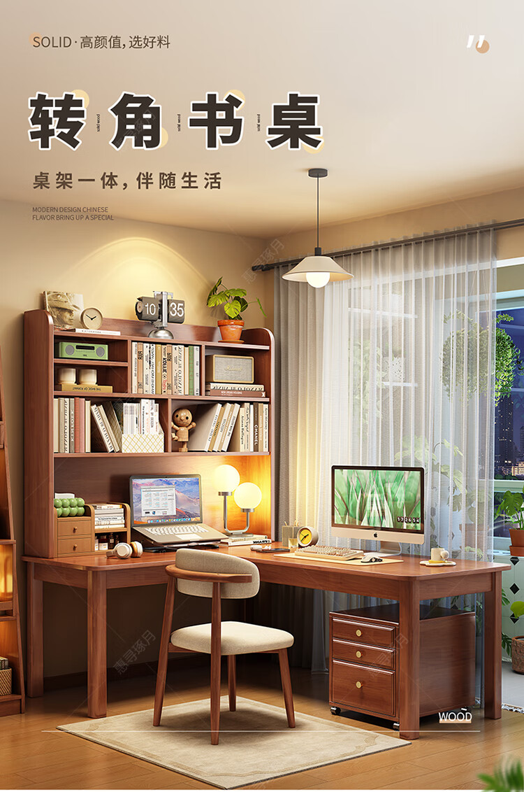 Huixun solid wood corner desk bookshelf integrated home corner L-shaped computer desk 7-shaped workbench semi-surrounded study table walnut color #desk + bookshelf 120cm*60cm*190cm auxiliary seat length 120cm
