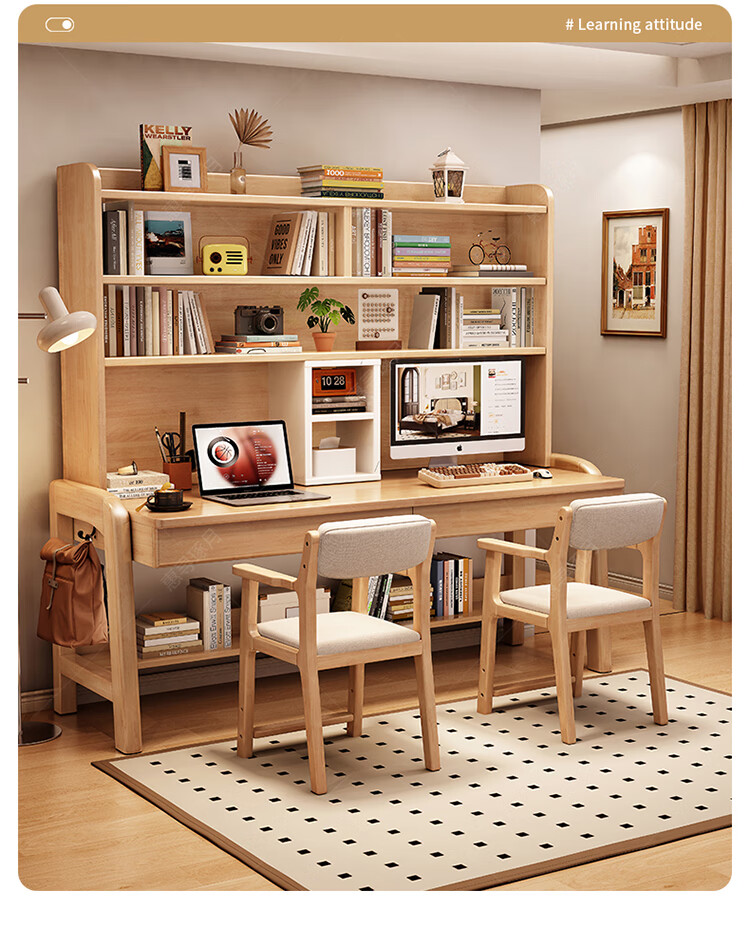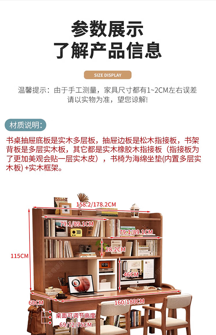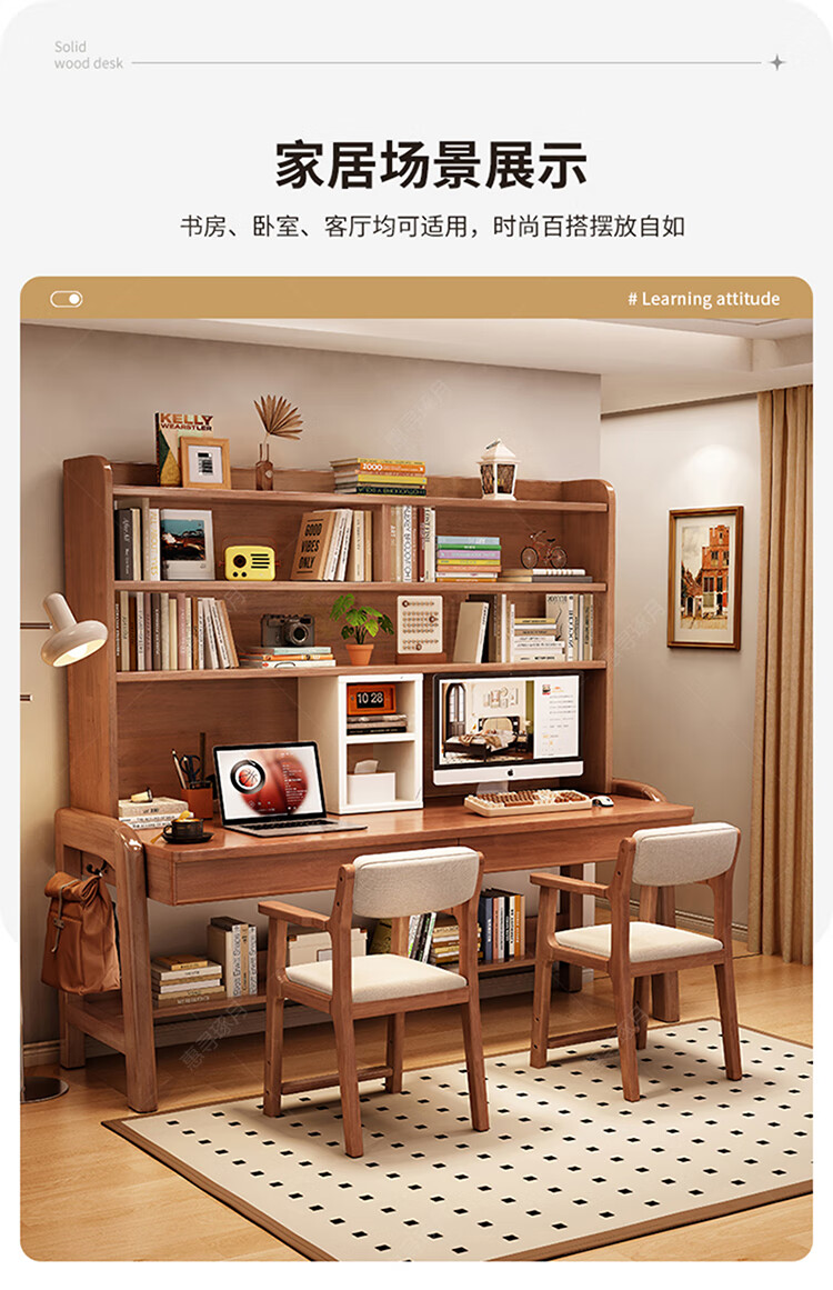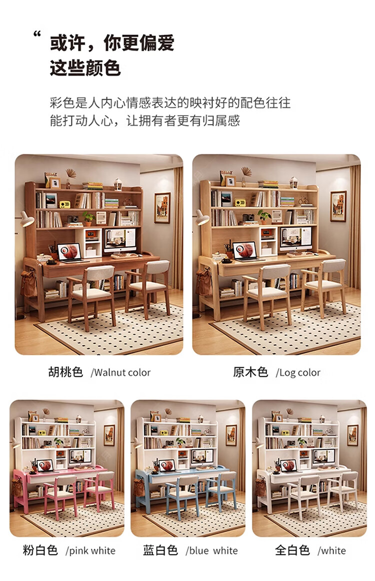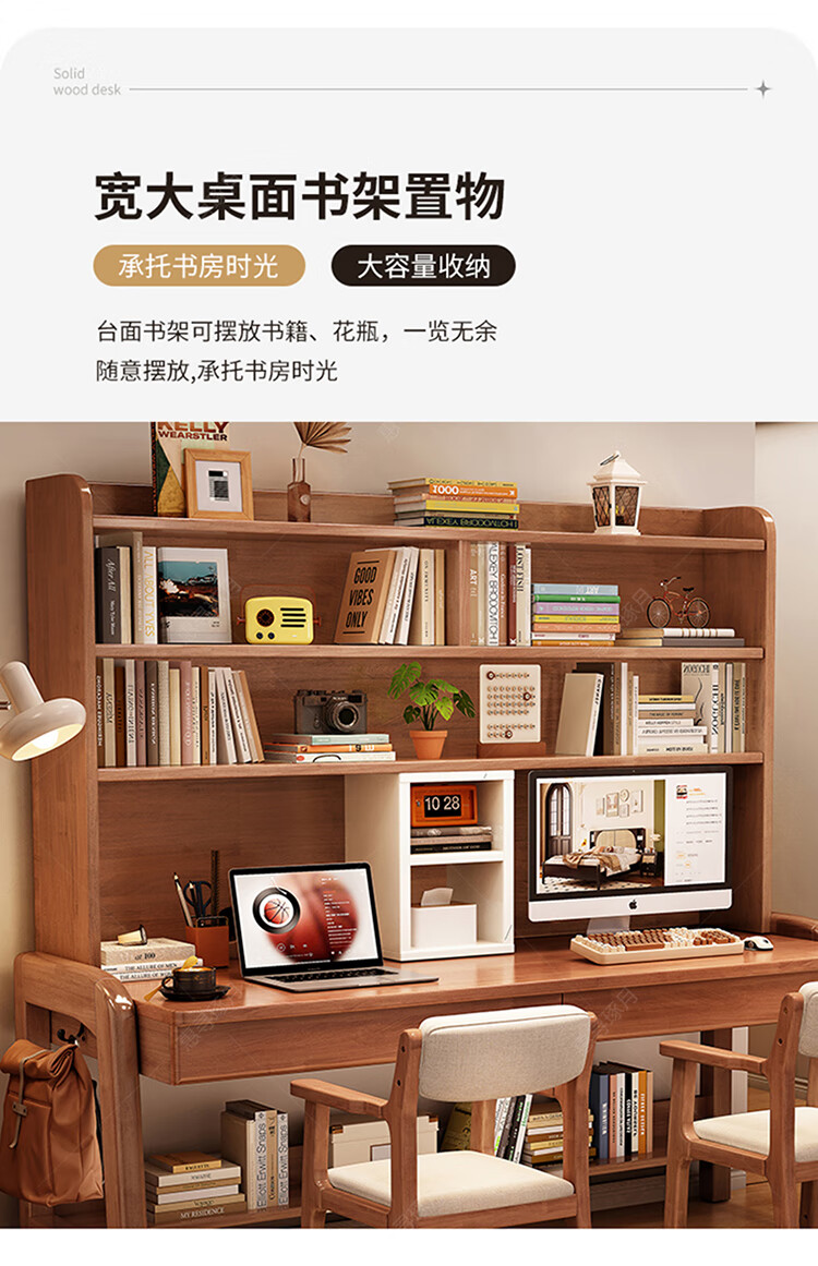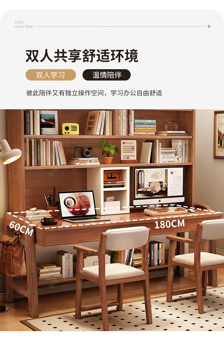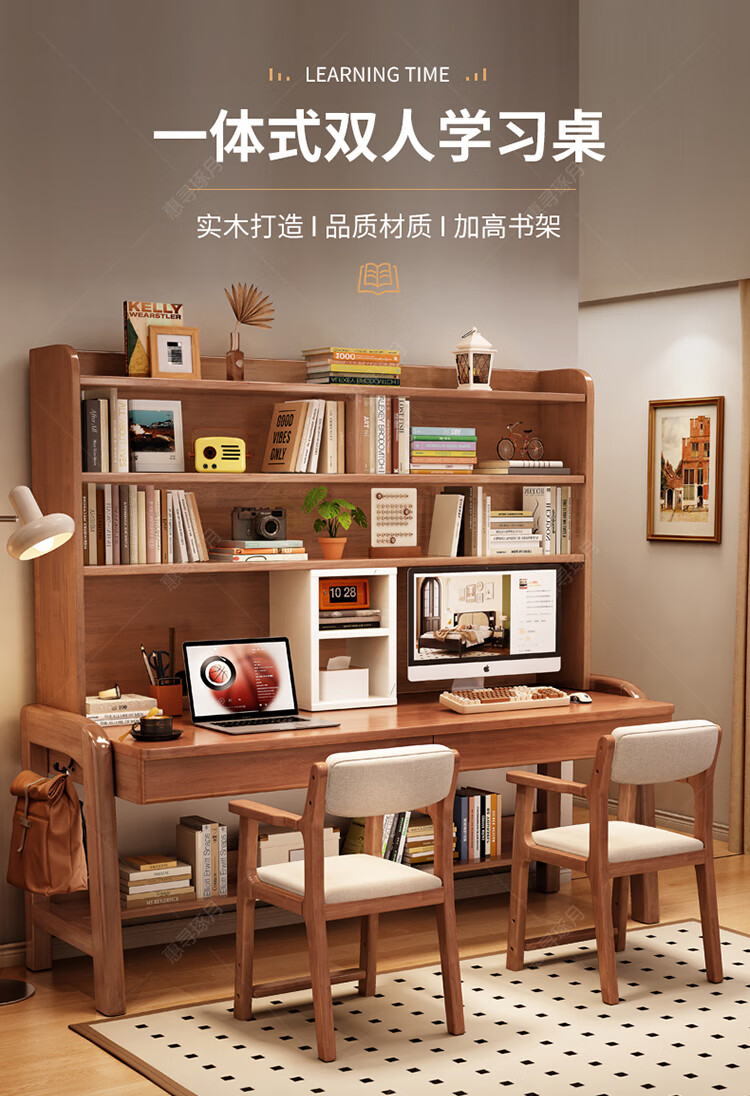 Huixun solid wood double desk bookshelf integrated table student home study table liftable bedroom wall extension computer desk walnut color #double desk + bookshelf 160cm*60cm*75cm total height 190cm