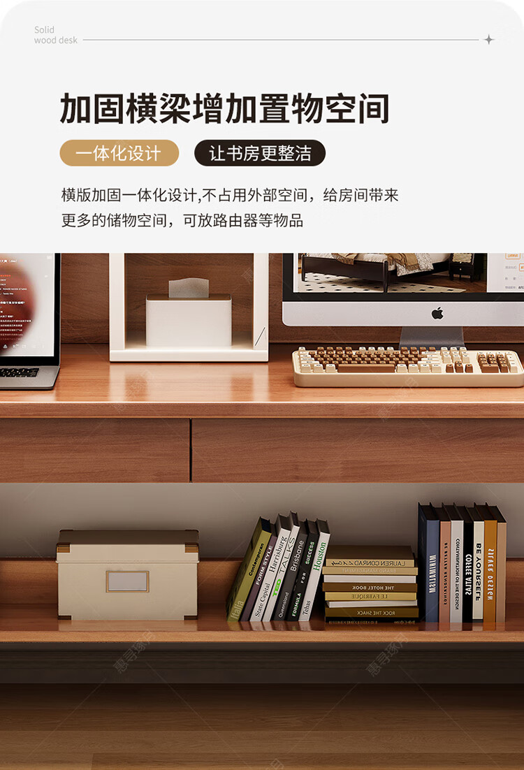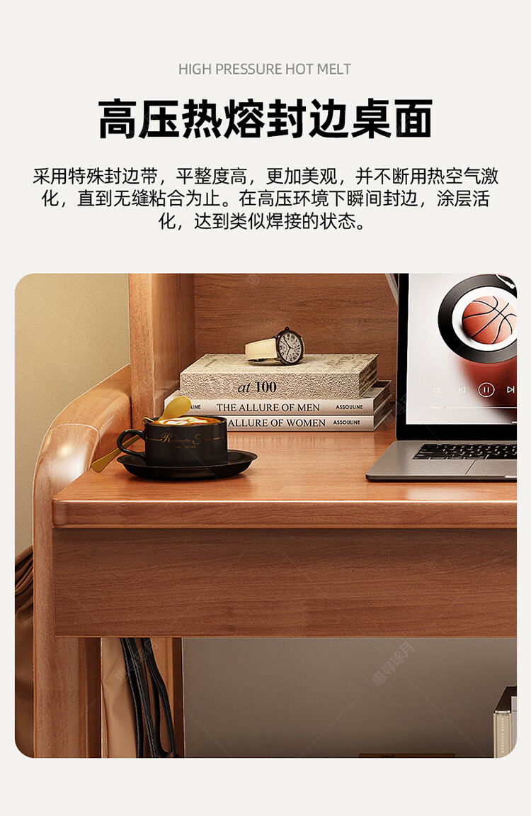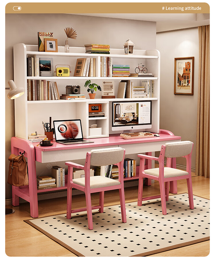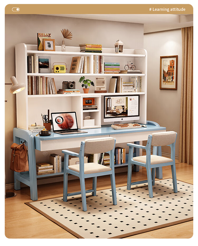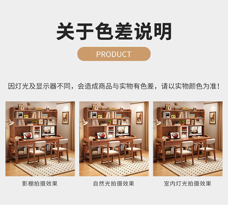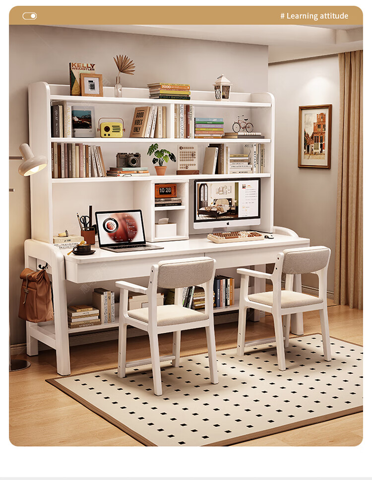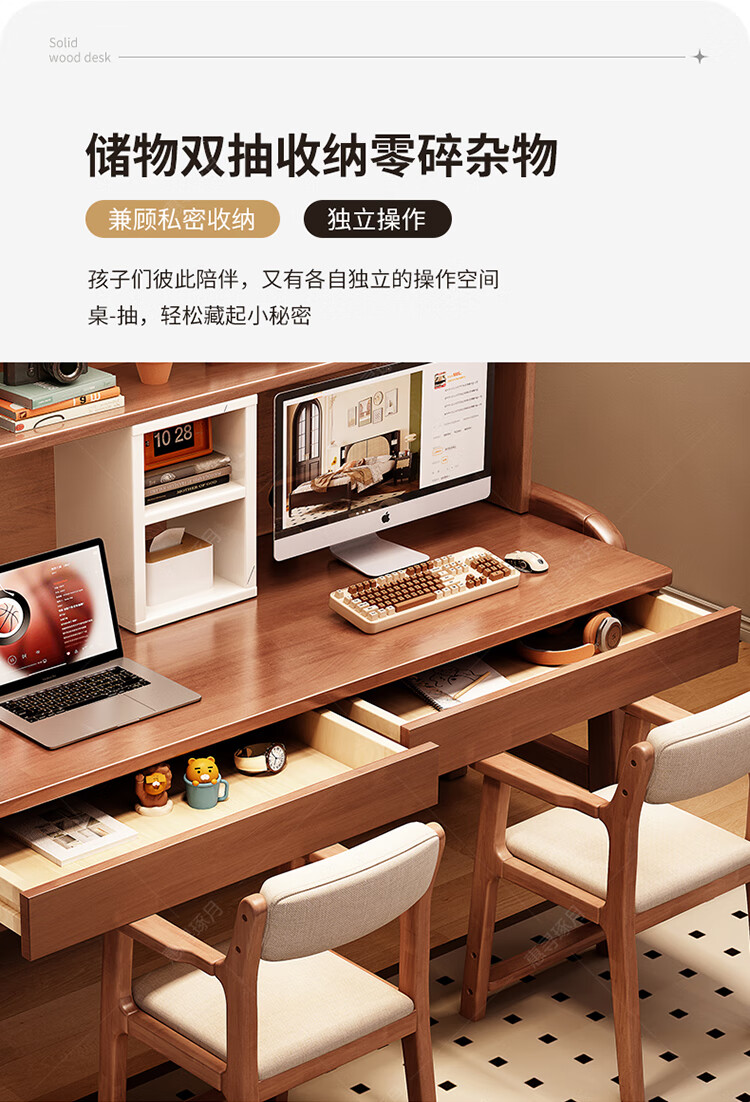 Huixun solid wood double desk bookshelf integrated table student home study table liftable bedroom wall extension computer desk walnut color #double desk + bookshelf 160cm*60cm*75cm total height 190cm