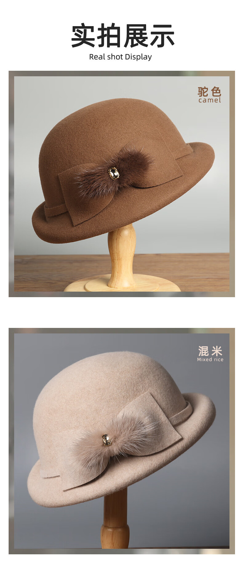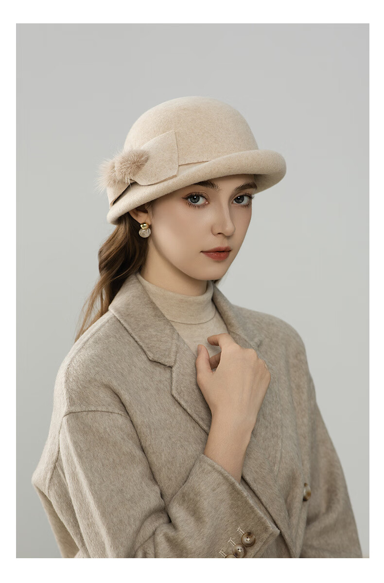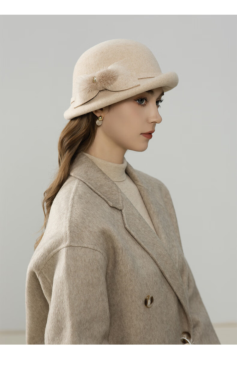 GEFWEIMKL Merino Wool Bucket Hat Women's Autumn and Winter New French Furry Bow Fashion Elegant Top Hat Women Black Adjustable (56-58cm)