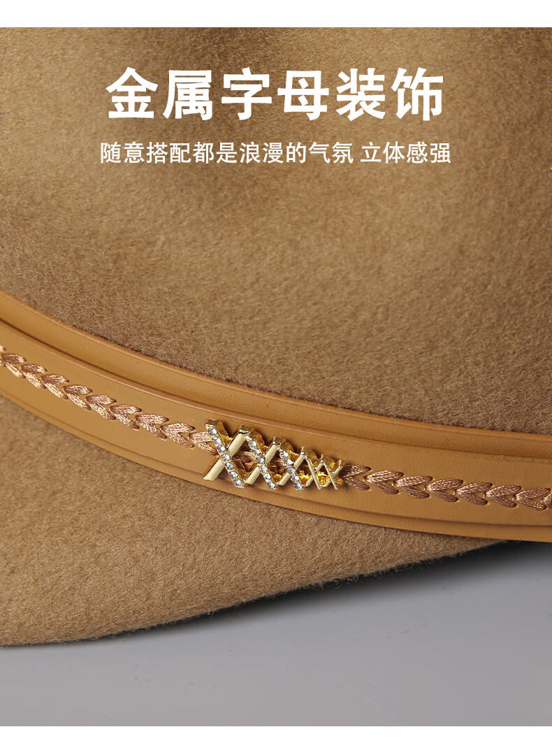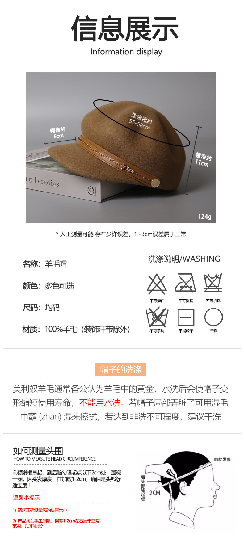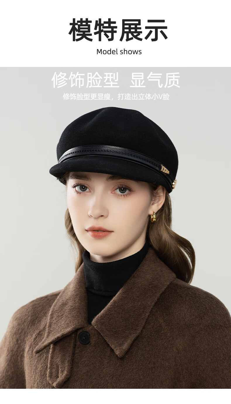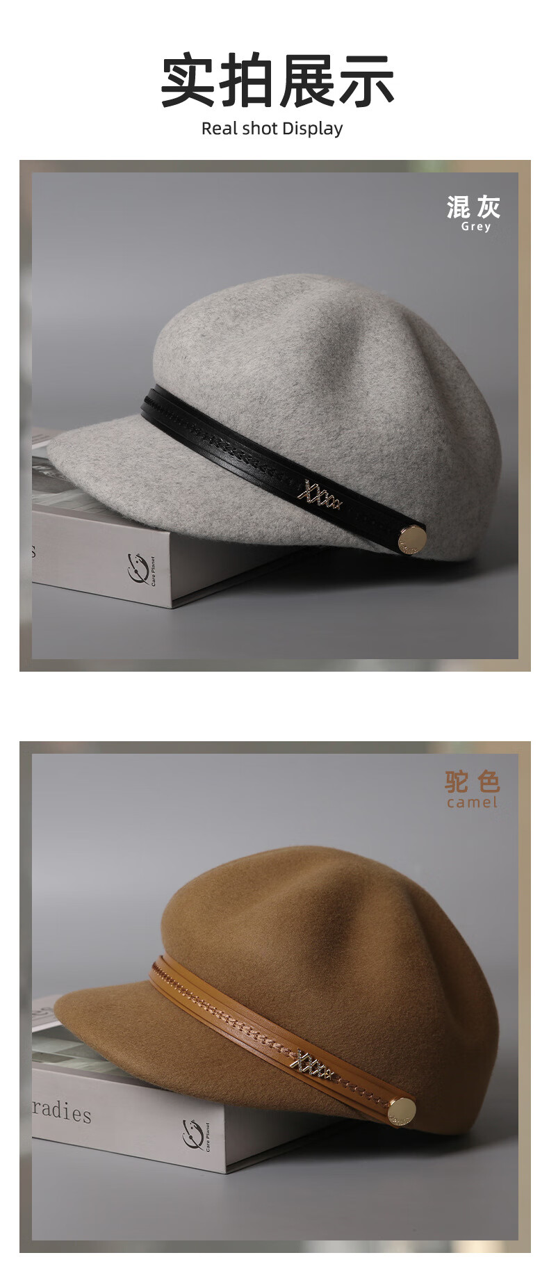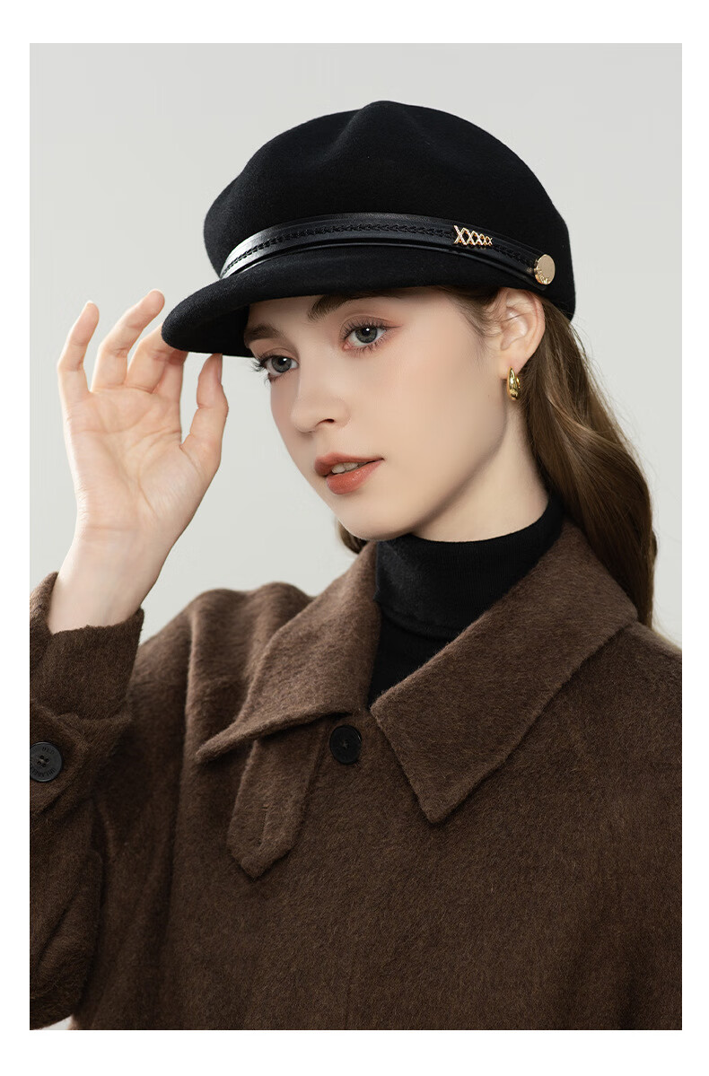 GEFWEIMKL retro pu belt equestrian hat women's autumn and winter merino wool felt hat versatile octagonal hat temperament peaked hat khaki adjustable (56-58cm)