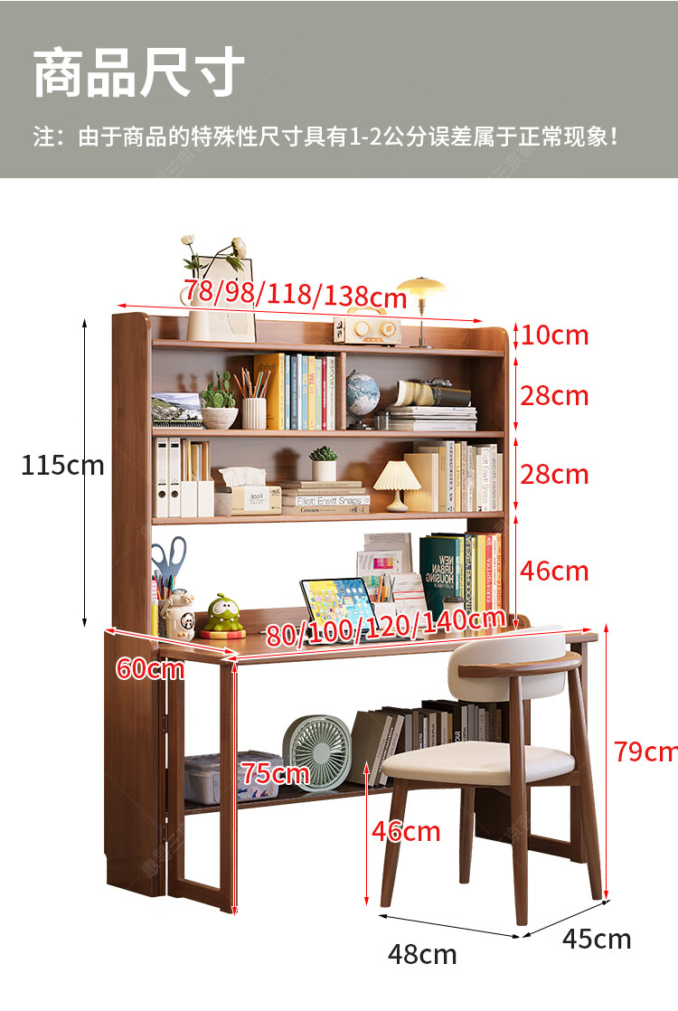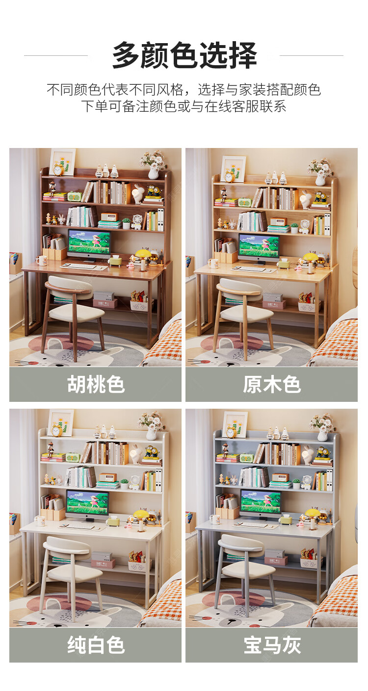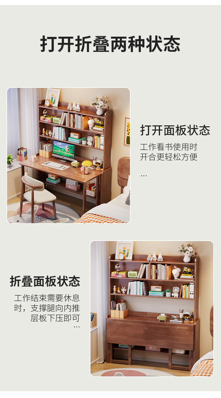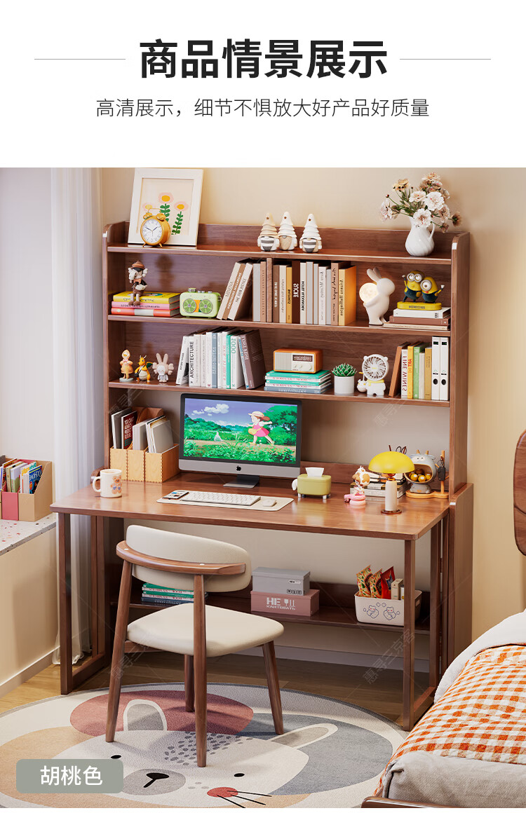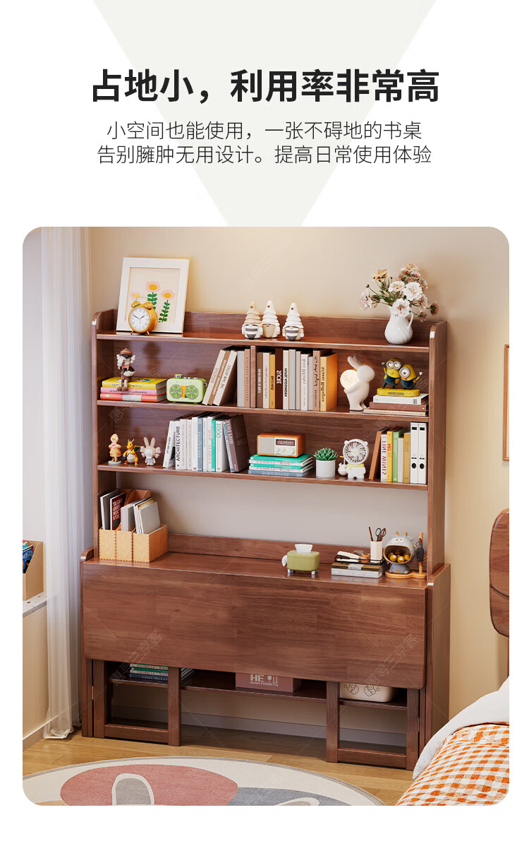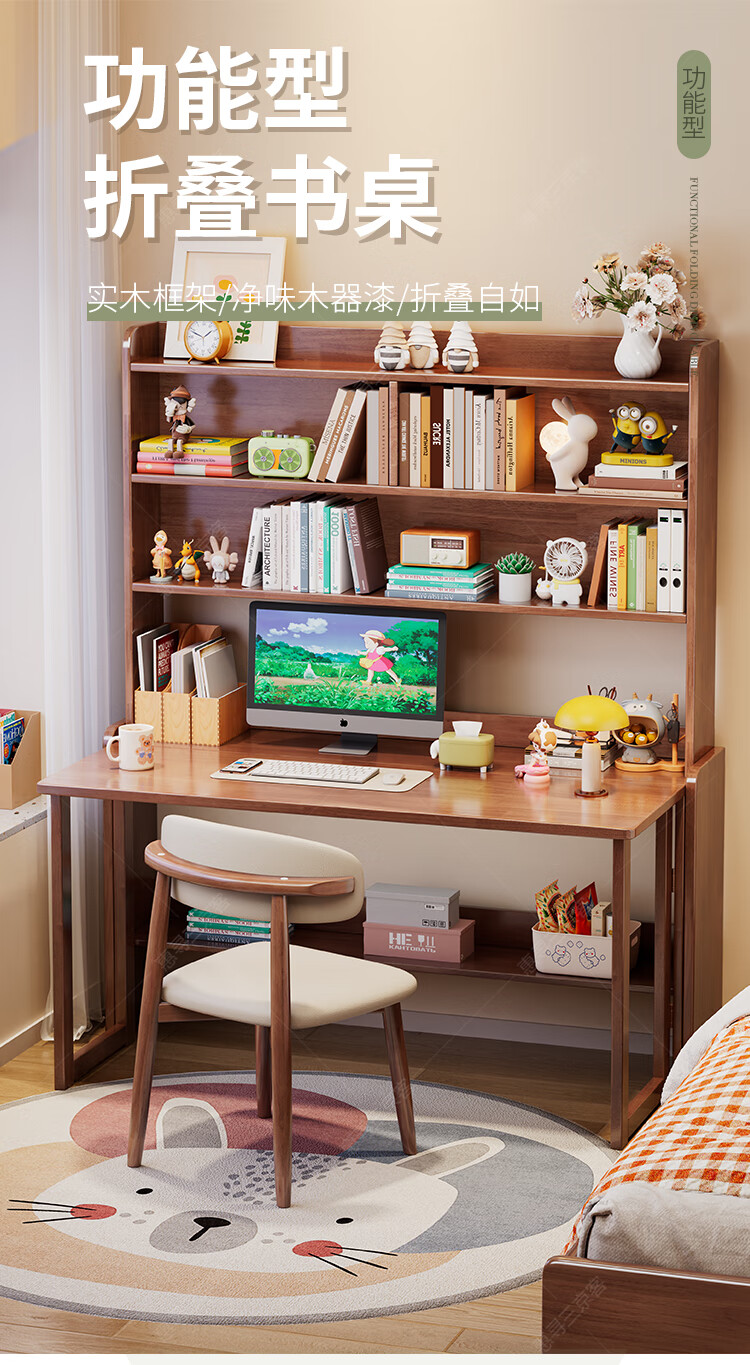 Huixun folding desk solid wood student home computer desk bedroom bedside study table with bookshelf small retractable desk walnut color #desk + bookshelf 80cm*60cm*75cm total height 190cm