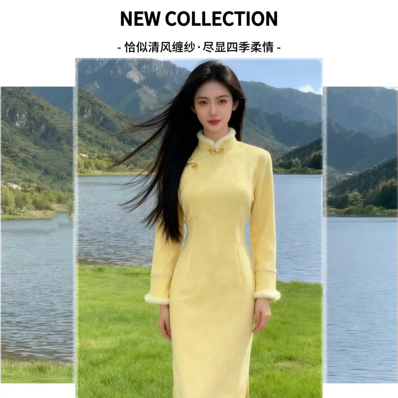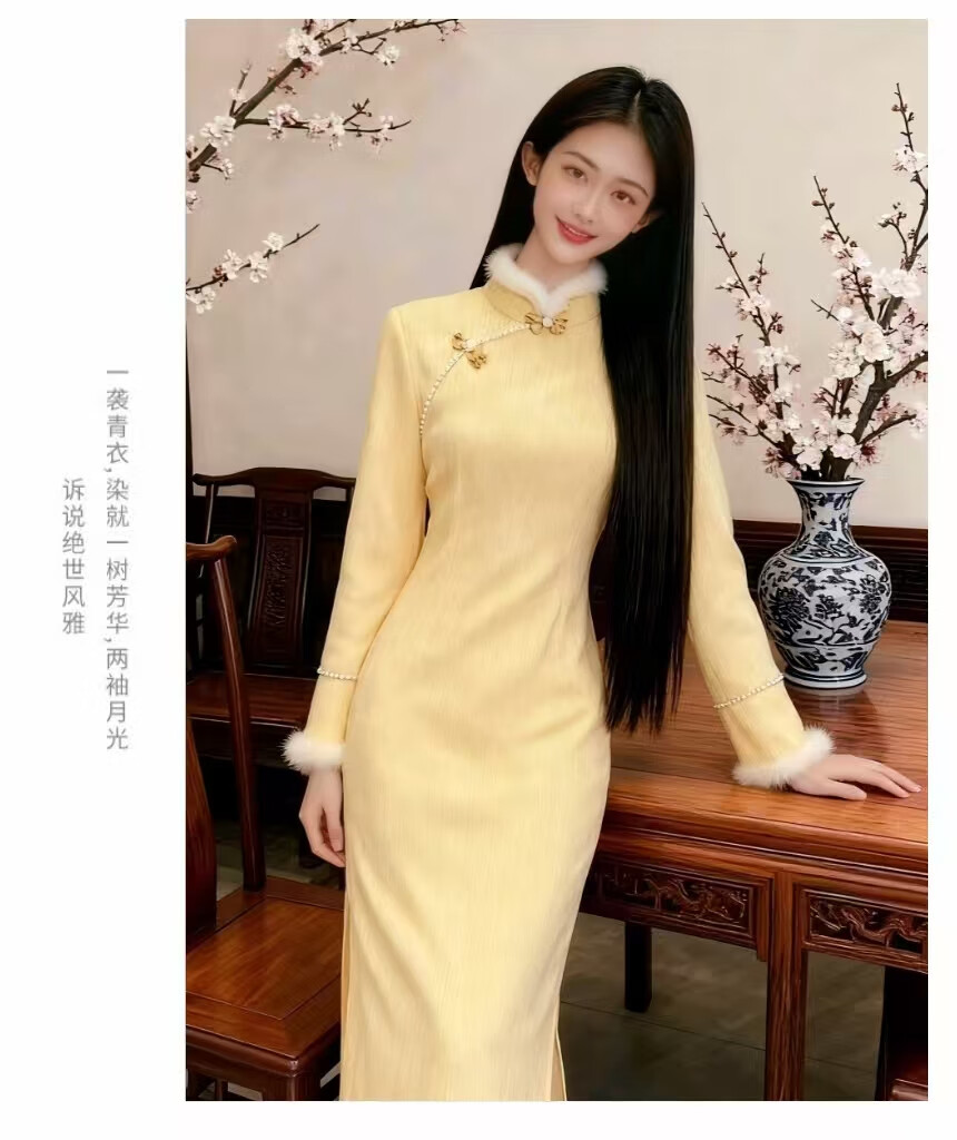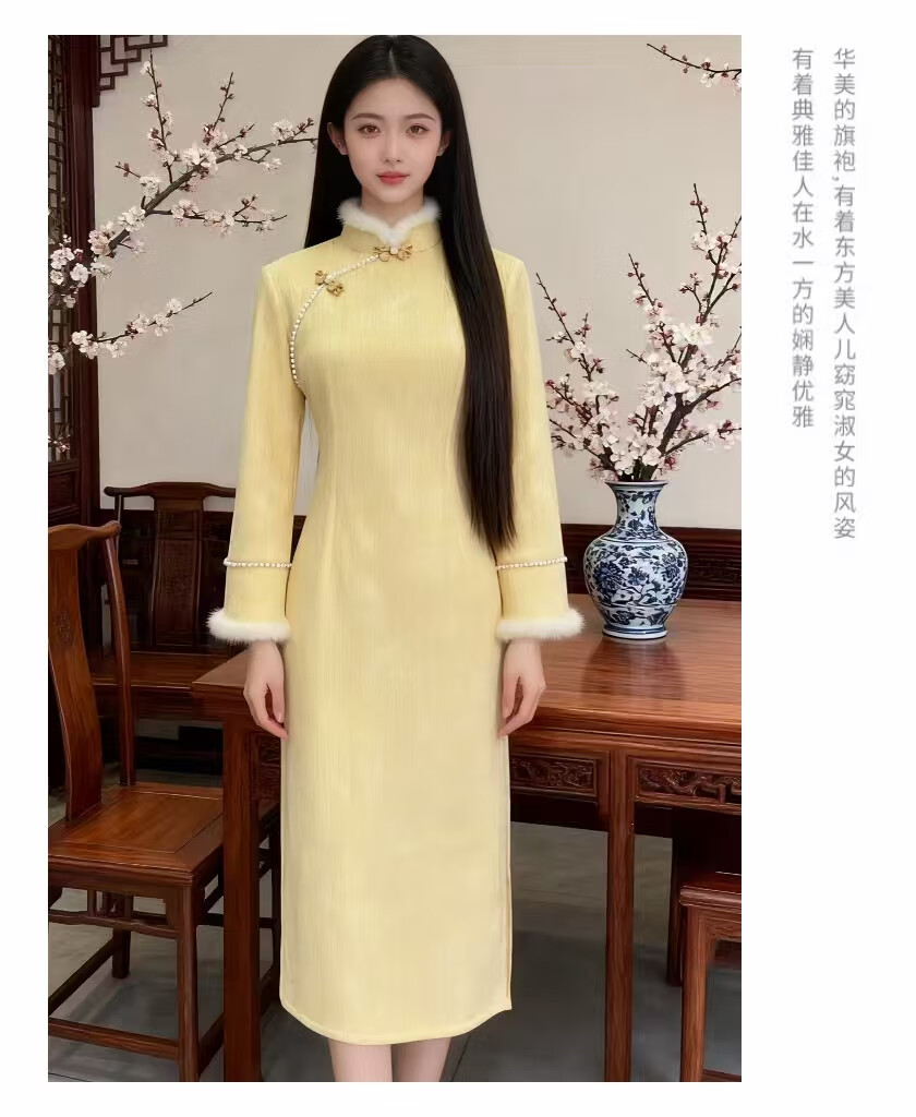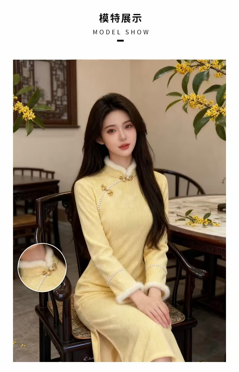 Cloth-like improved cheongsam autumn and winter French retro yellow temperament elegant daily wear new Chinese women's clothing goose yellow M