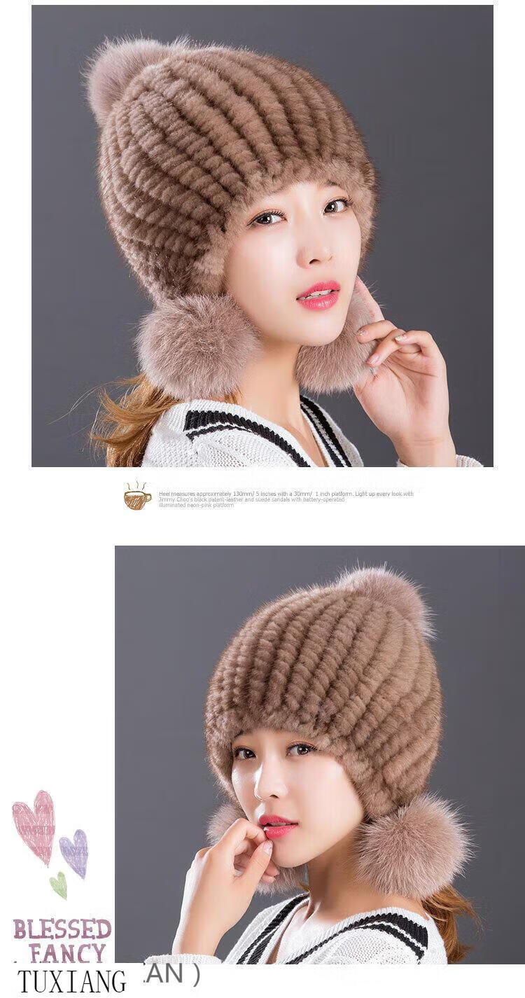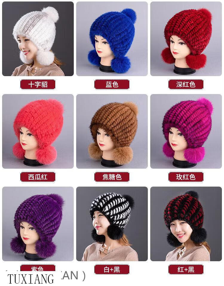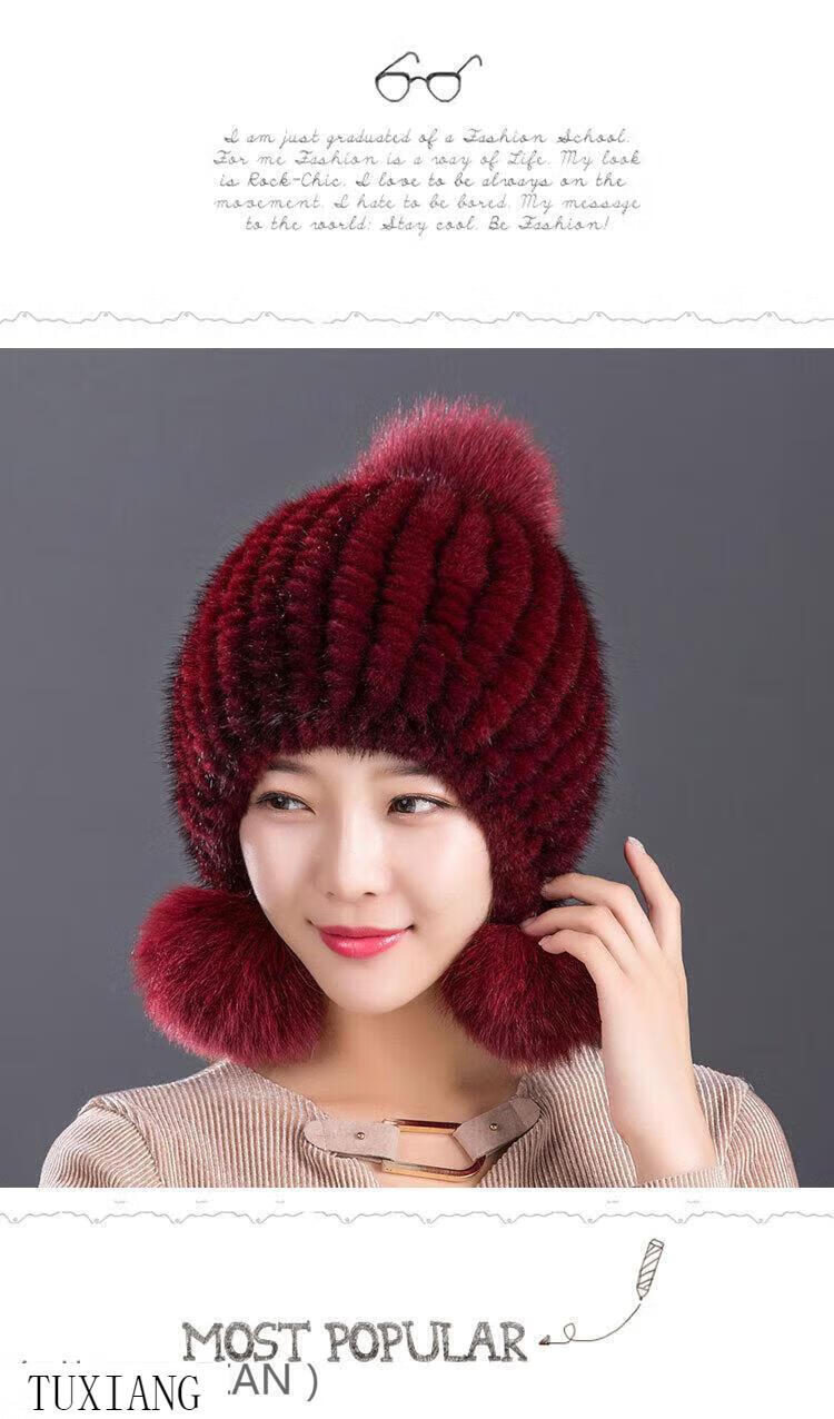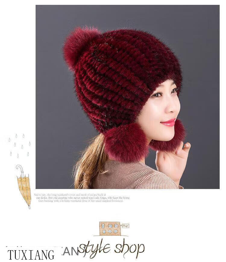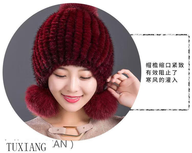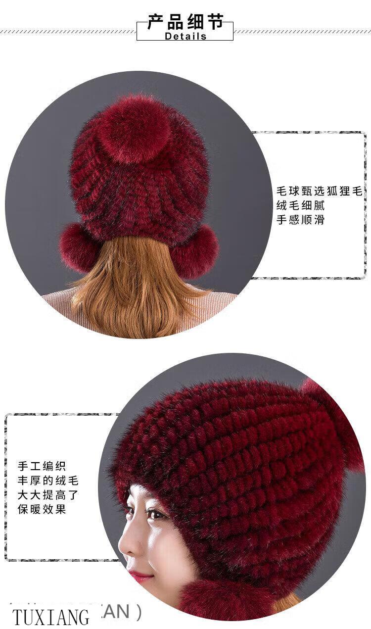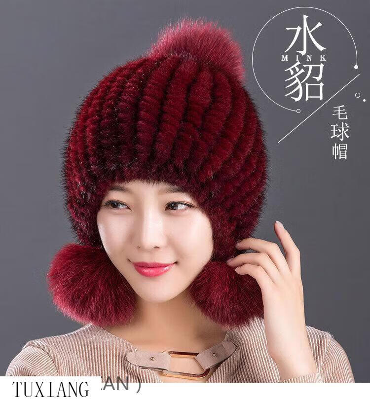 Jiaojing mink hat mink whole mink hat women's winter knitted hat women's ball ear protection wine red dark brown one size fits all, elastic