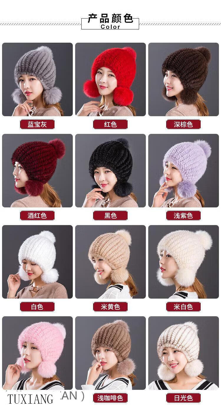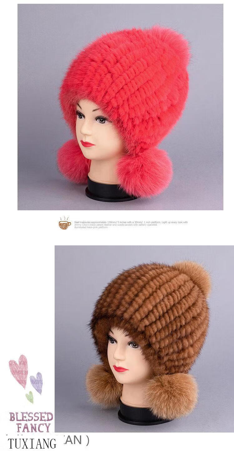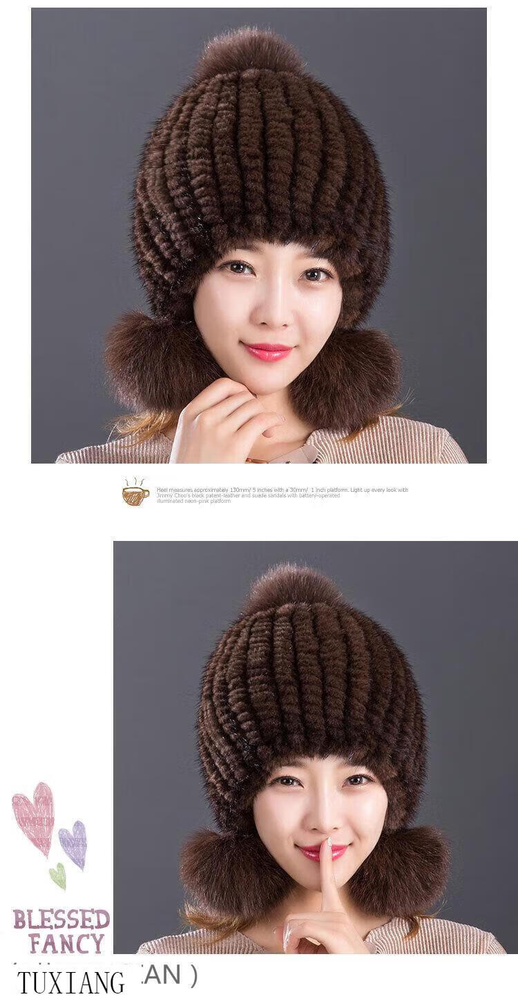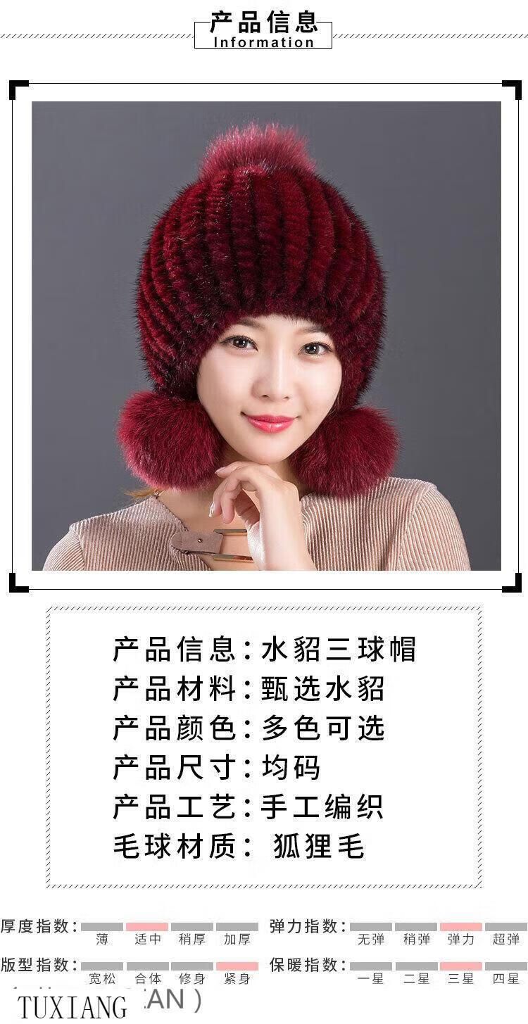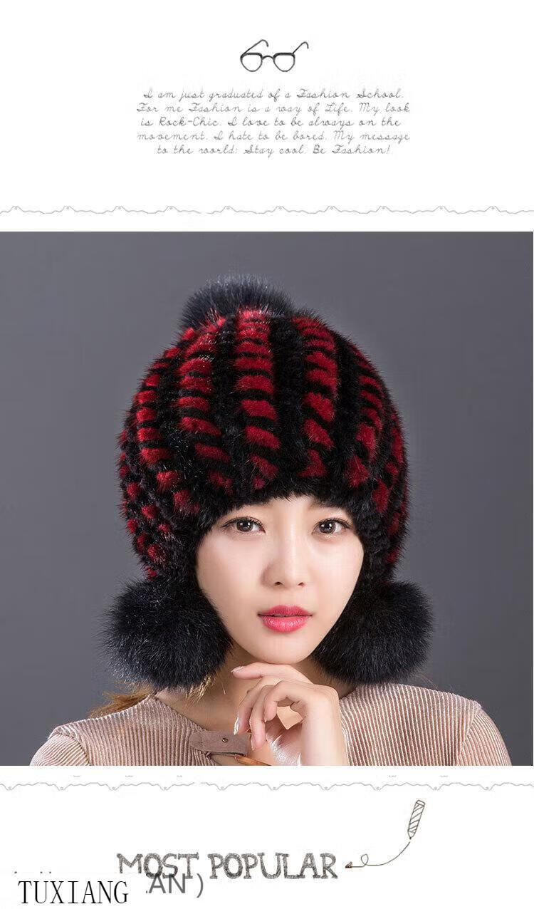 Jiaojing mink hat mink whole mink hat women's winter knitted hat women's ball ear protection wine red dark brown one size fits all, elastic