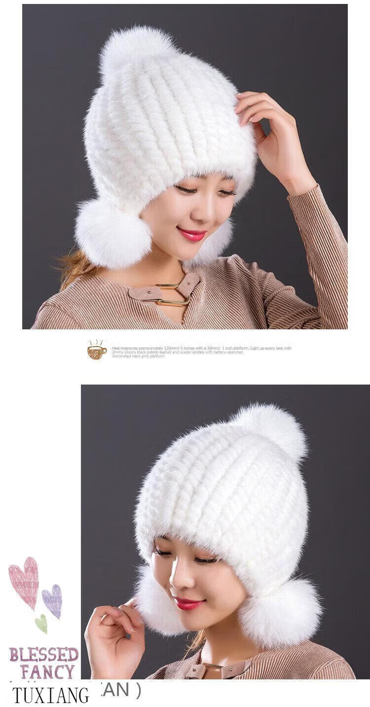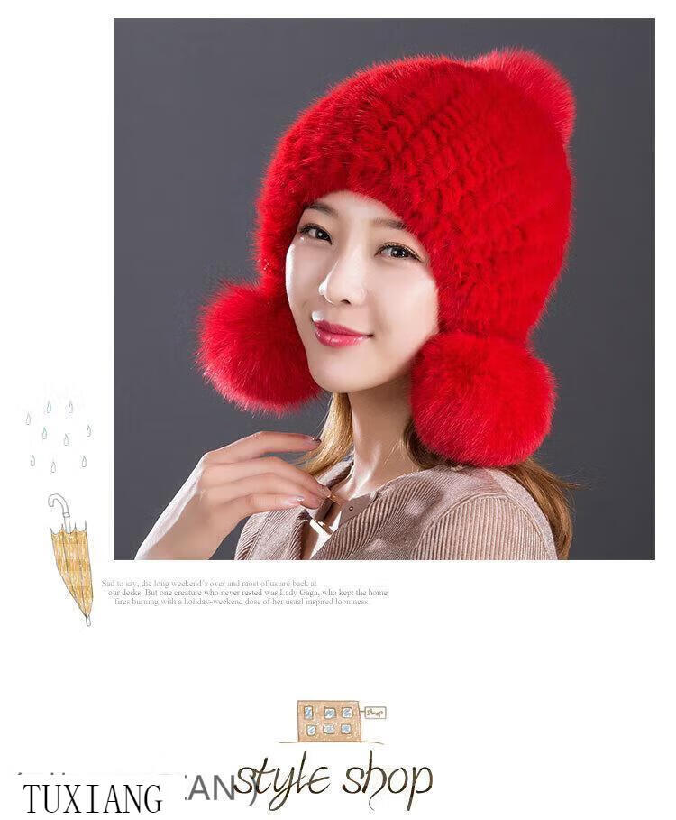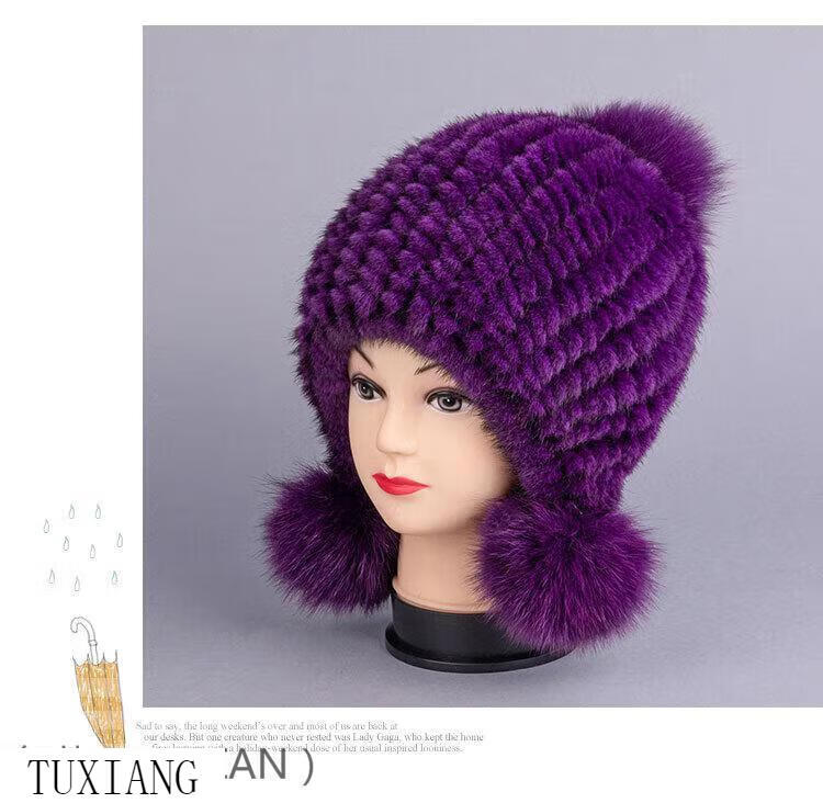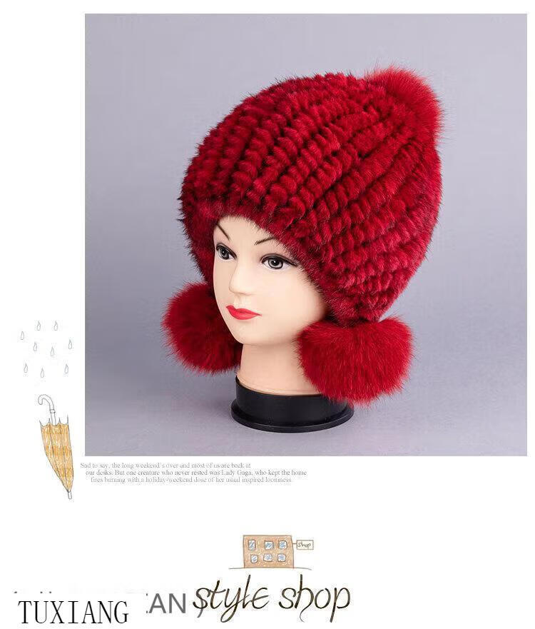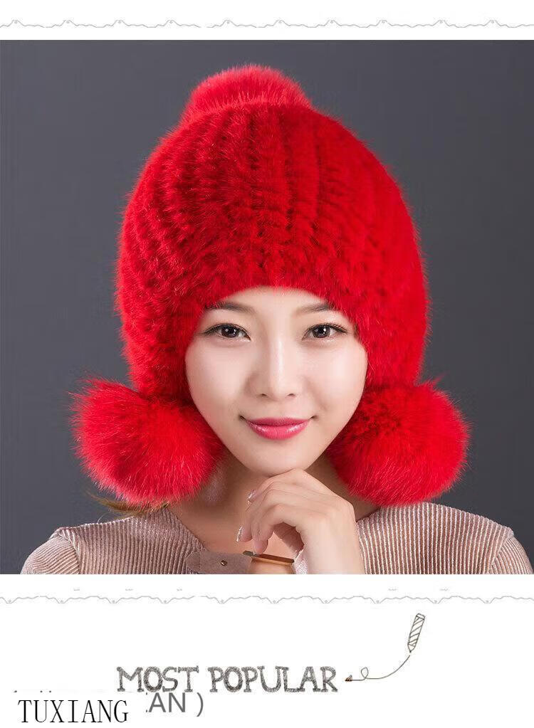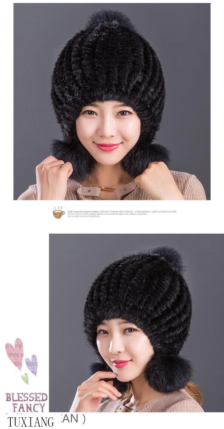 Jiaojing mink hat mink whole mink hat women's winter knitted hat women's ball ear protection wine red dark brown one size fits all, elastic