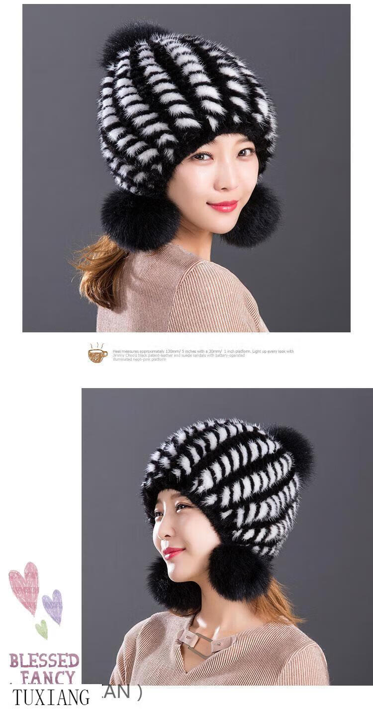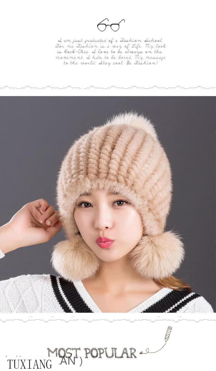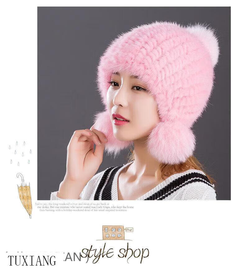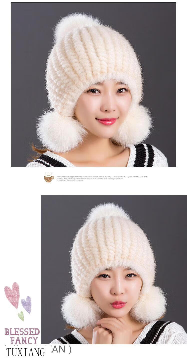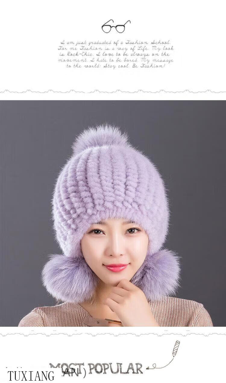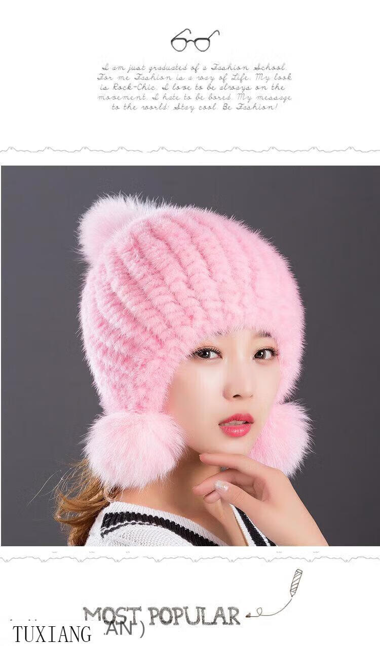 Jiaojing mink hat mink whole mink hat women's winter knitted hat women's ball ear protection wine red dark brown one size fits all, elastic