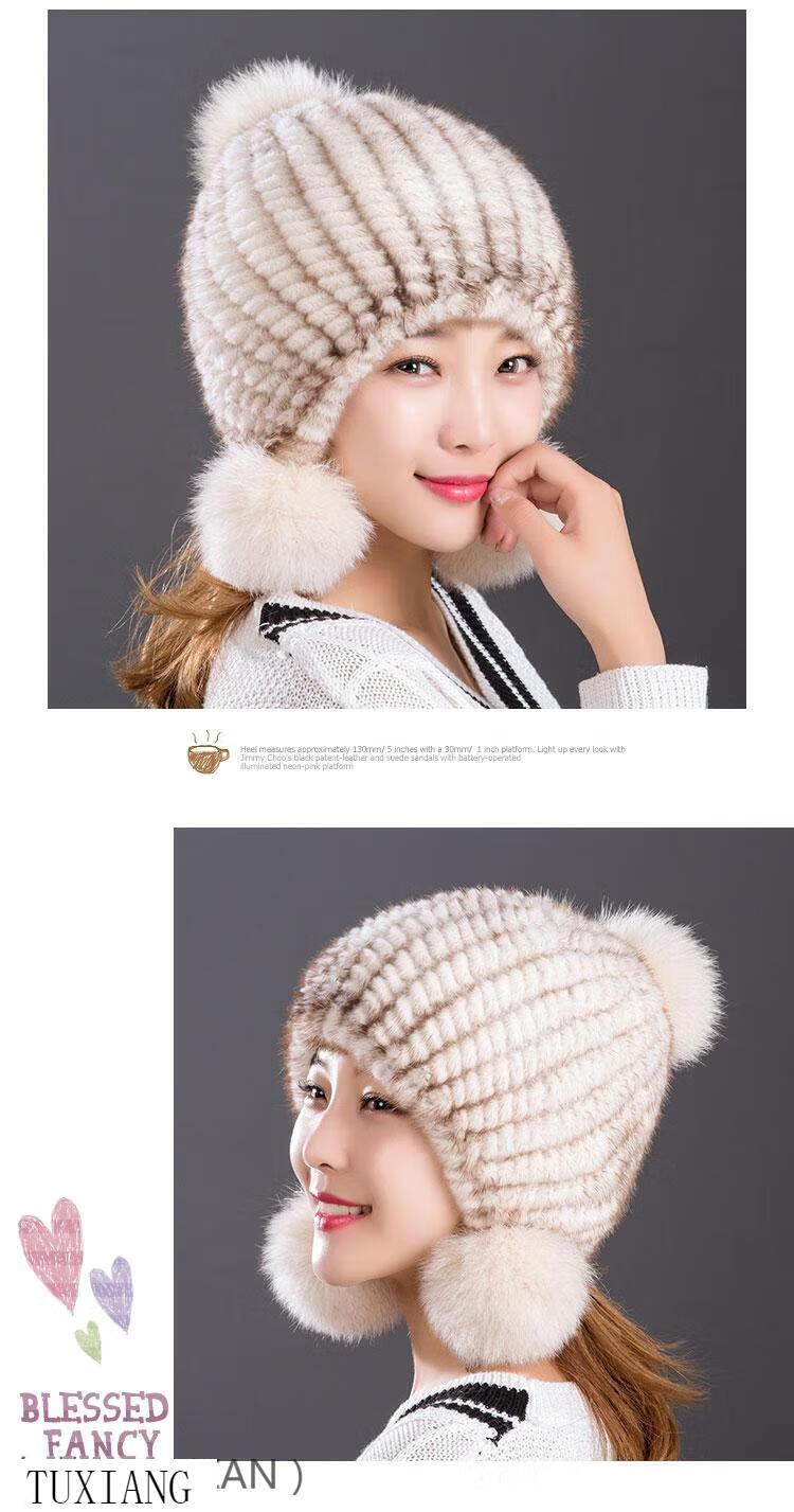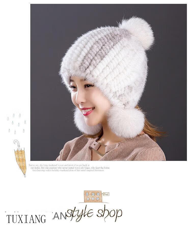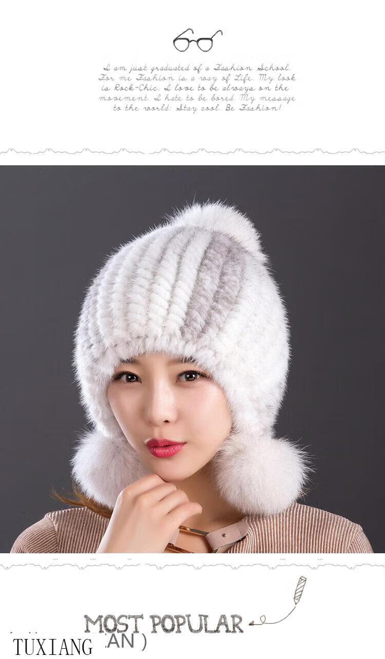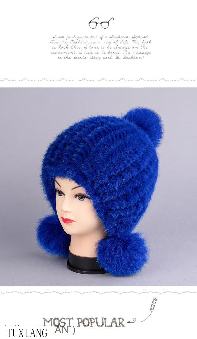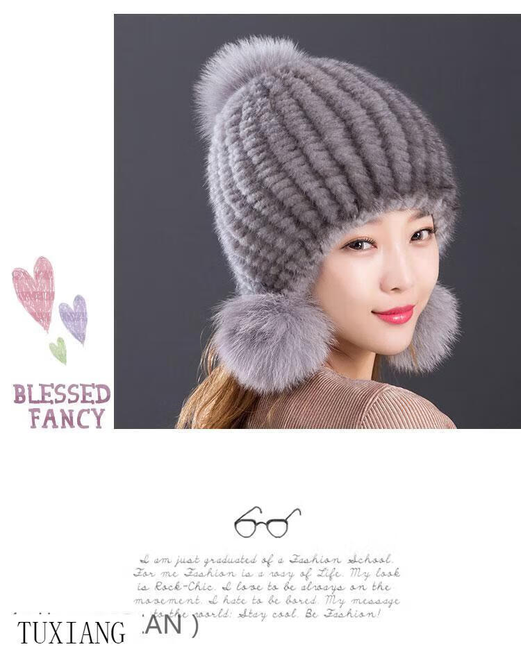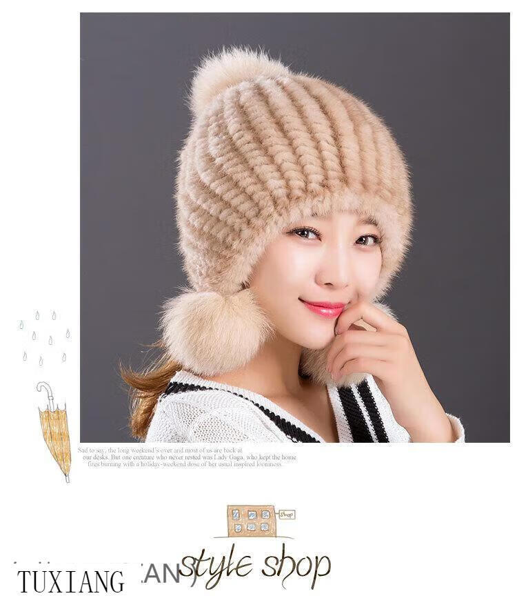 Jiaojing mink hat mink whole mink hat women's winter knitted hat women's ball ear protection wine red dark brown one size fits all, elastic