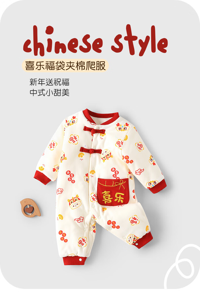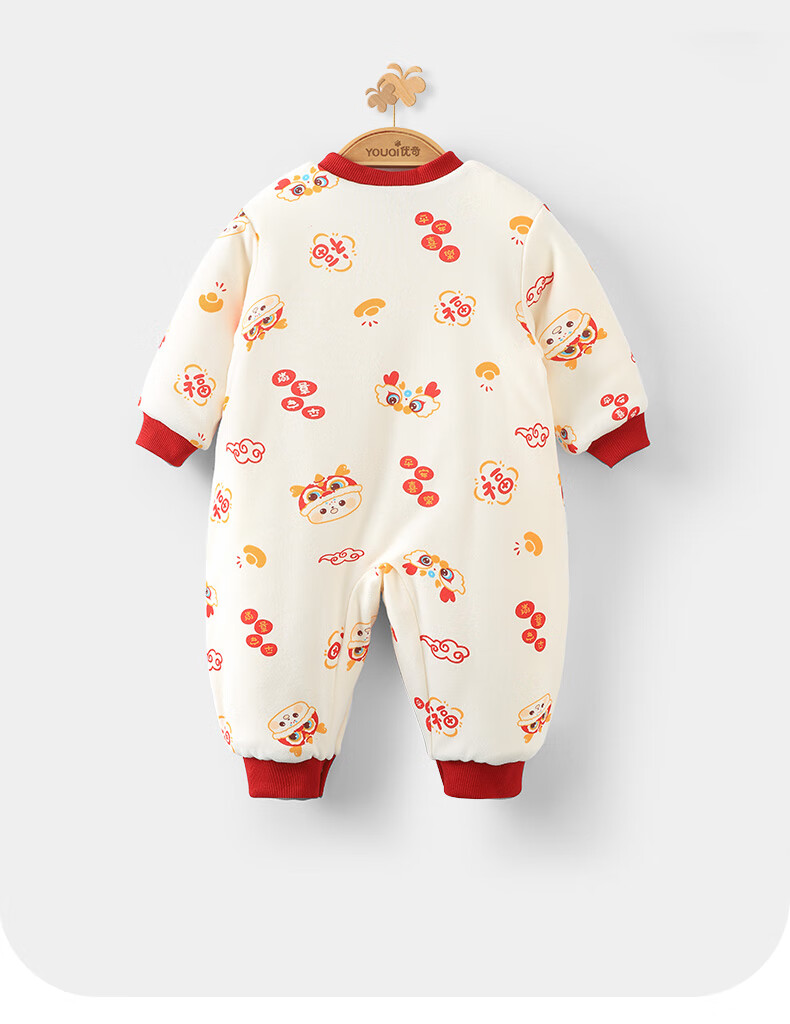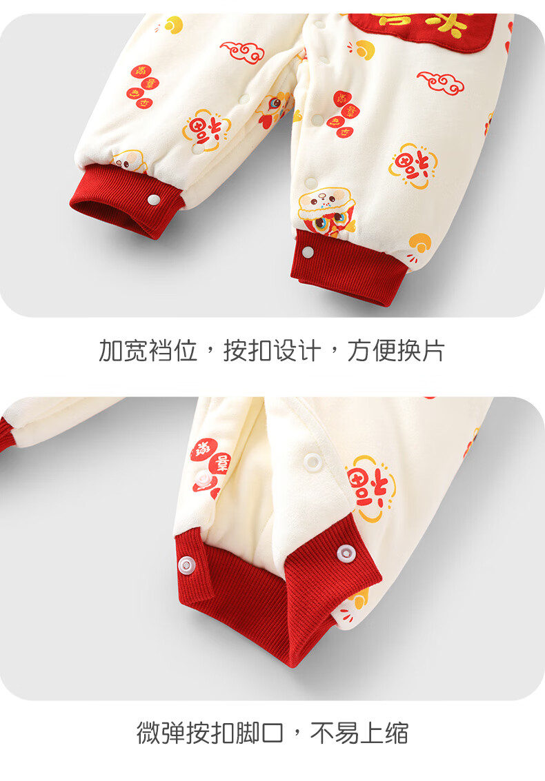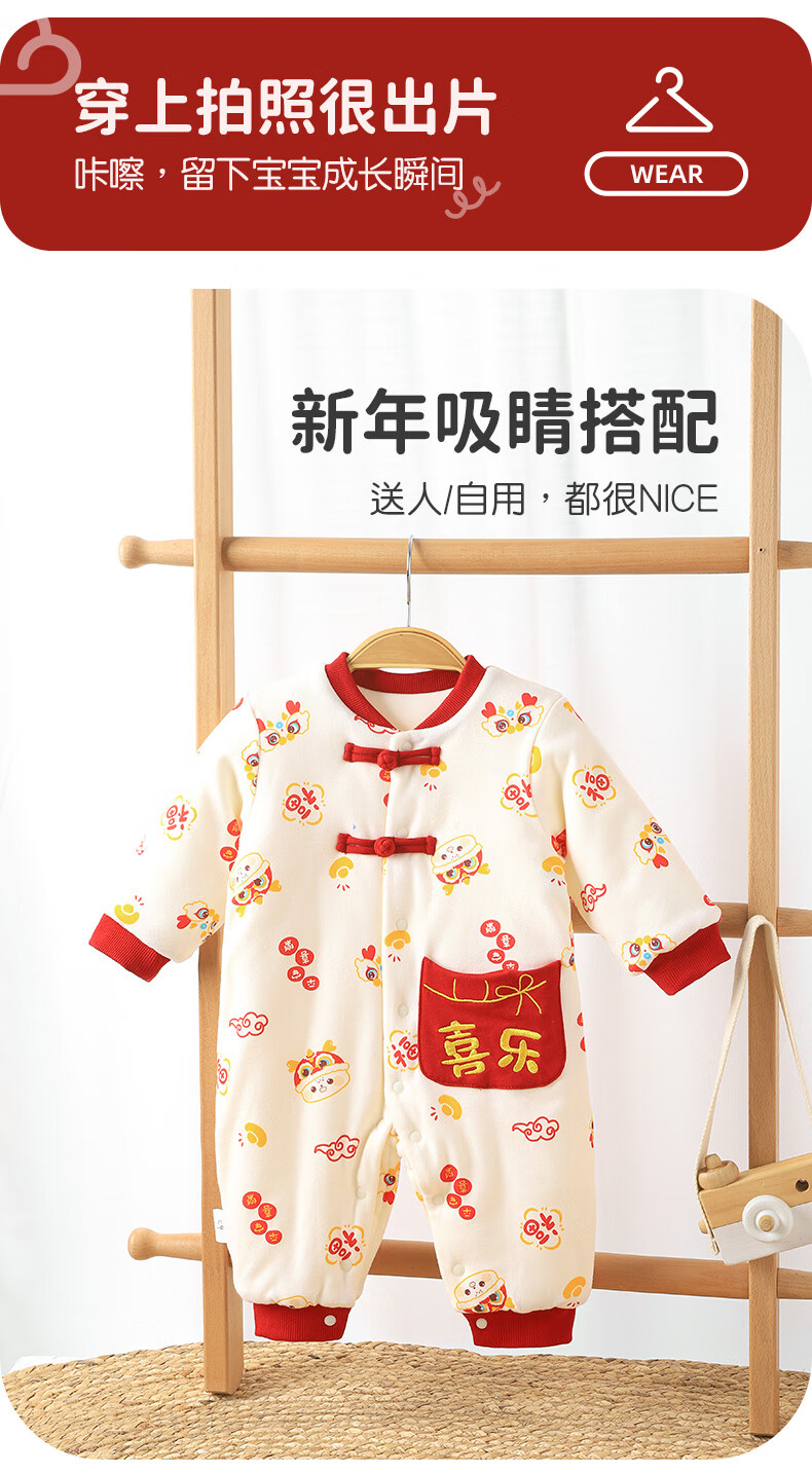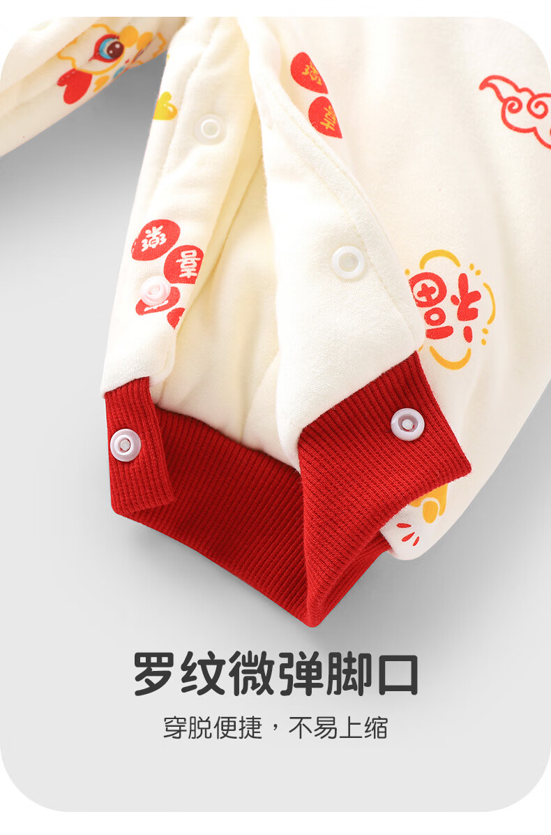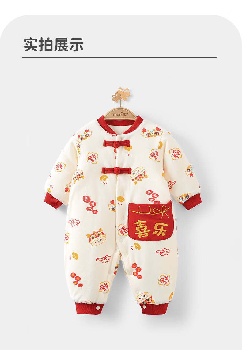 Youqi baby full-month clothing thickened jumpsuit autumn and winter baby 100-day one-year-old clothing warm cotton clothing festive New Year greetings clothing Happy little lucky bag thickened and warm 66cm
