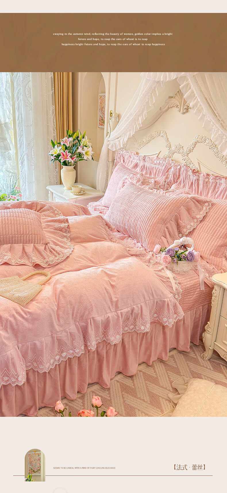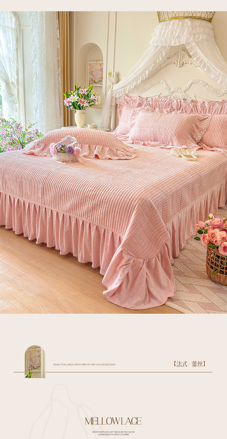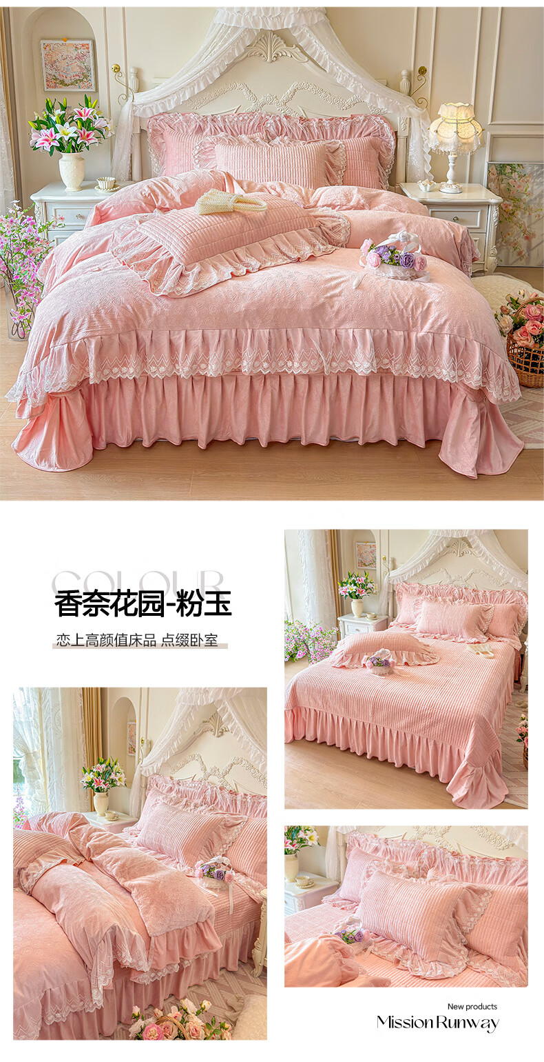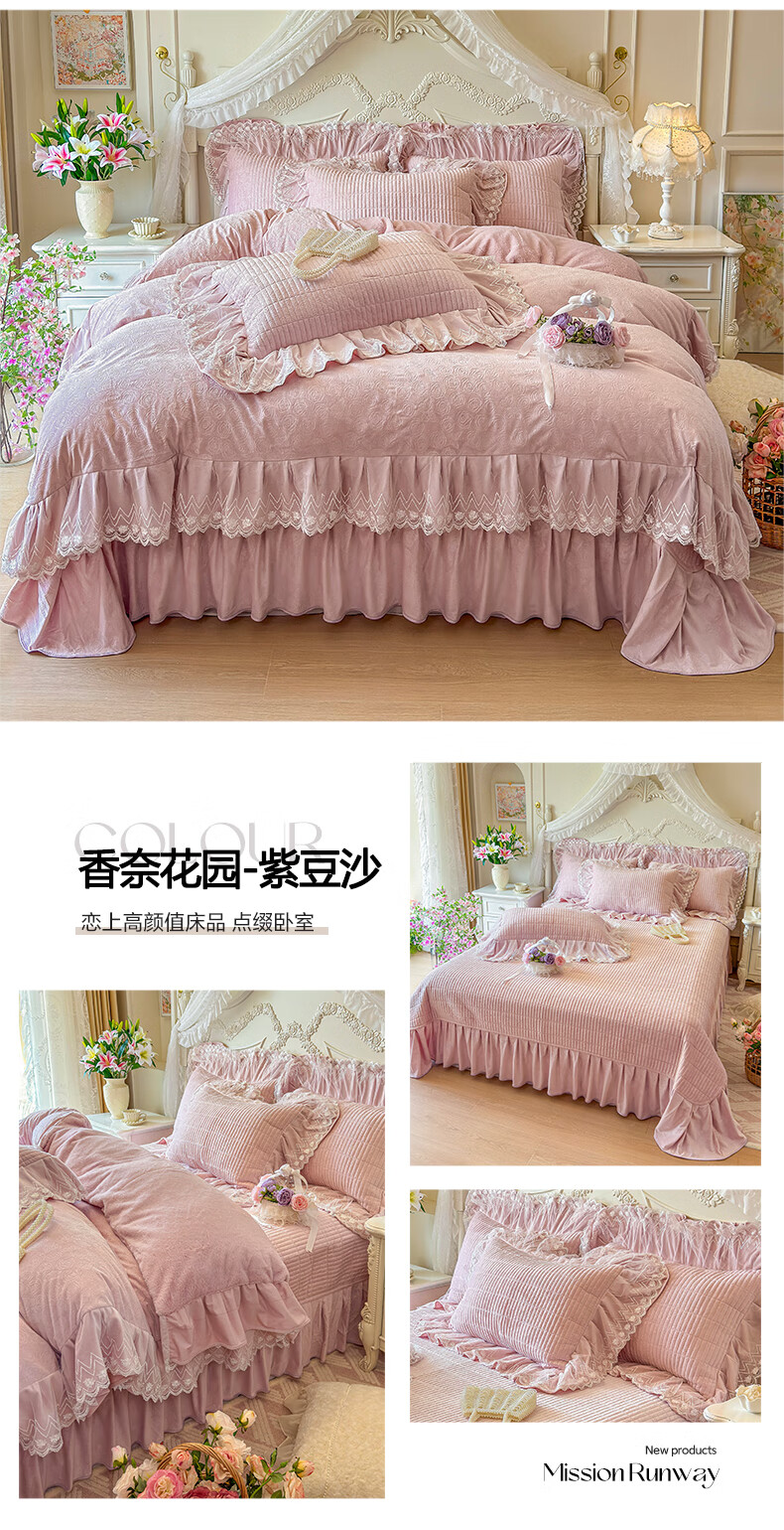 Yalu Korean lace baby velvet bed skirt four-piece set winter double-sided milk velvet warm bed sheet quilt cover three-piece set Chanel Garden-Pink Jade bed cover 1.5m four-piece set