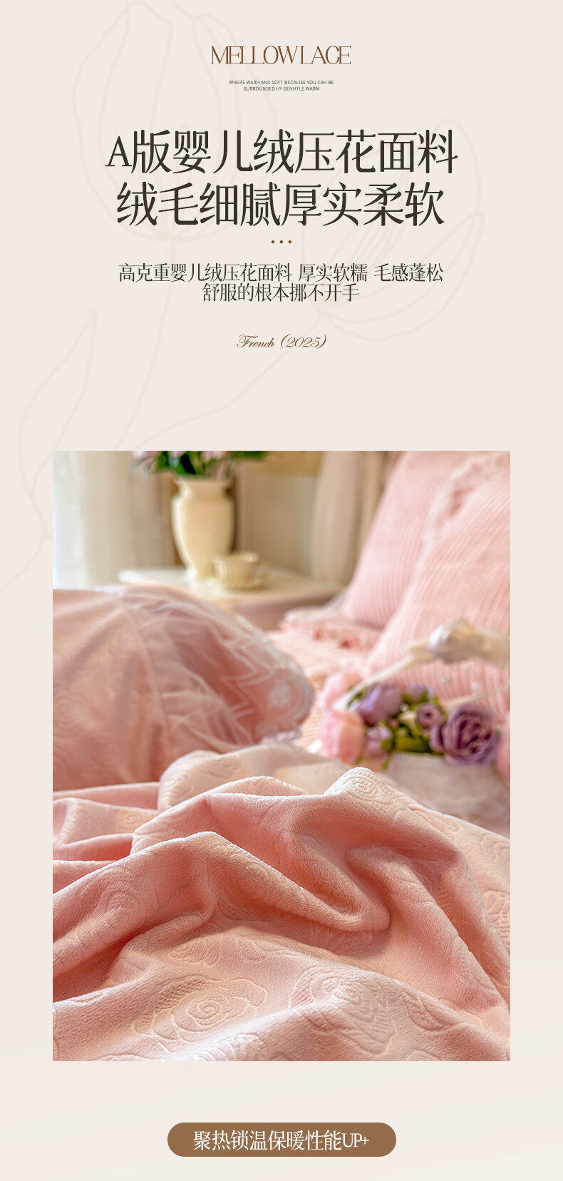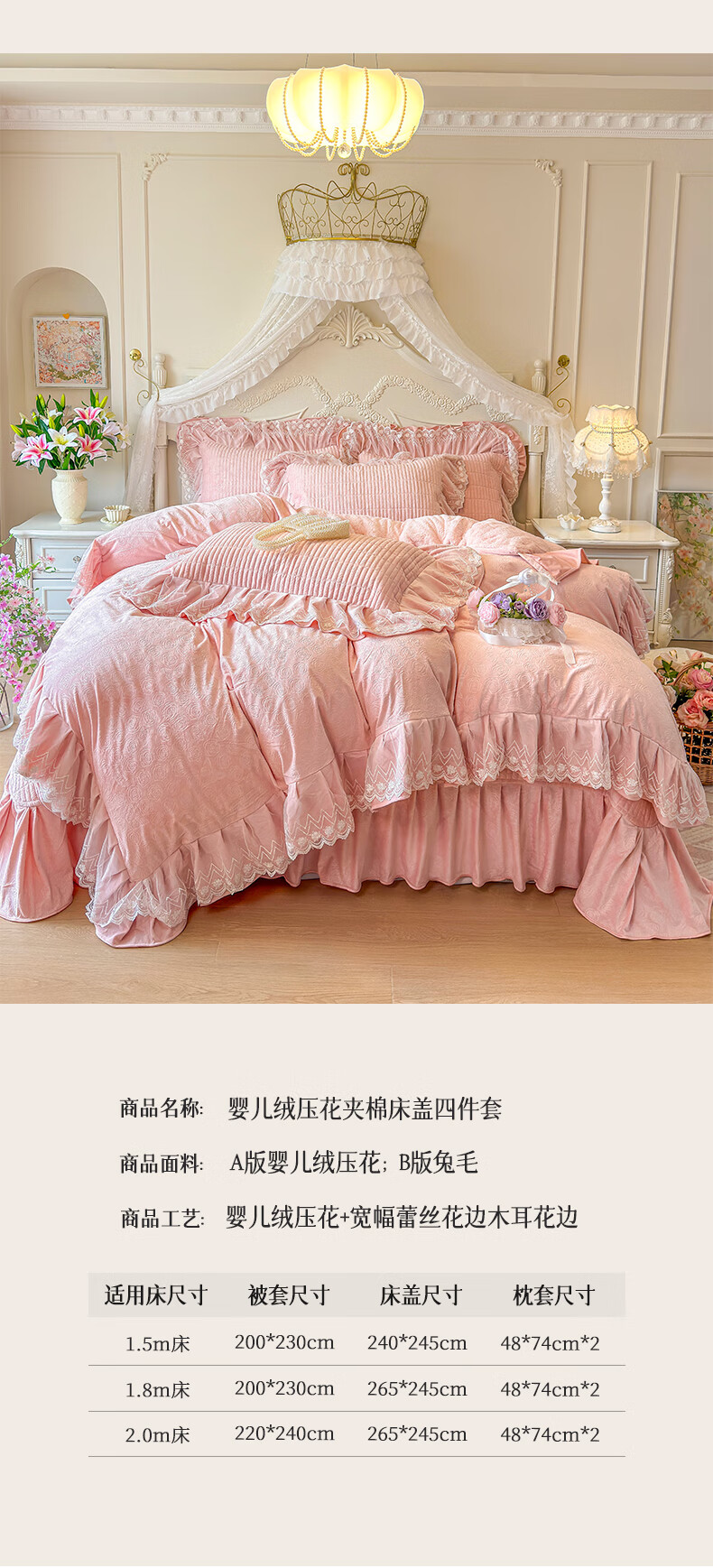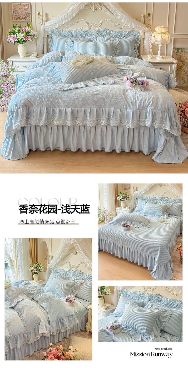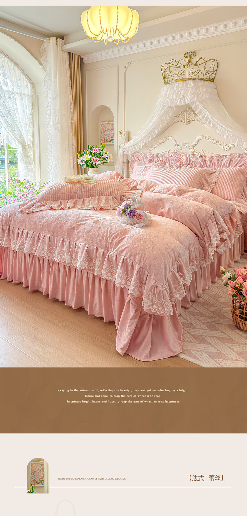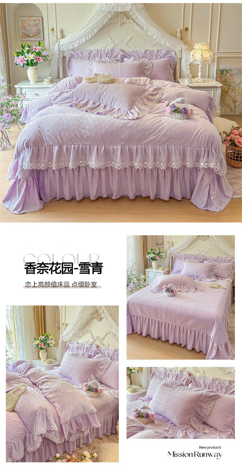 Yalu Korean lace baby velvet bed skirt four-piece set winter double-sided milk velvet warm bed sheet quilt cover three-piece set Chanel Garden-Pink Jade bed cover 1.5m four-piece set