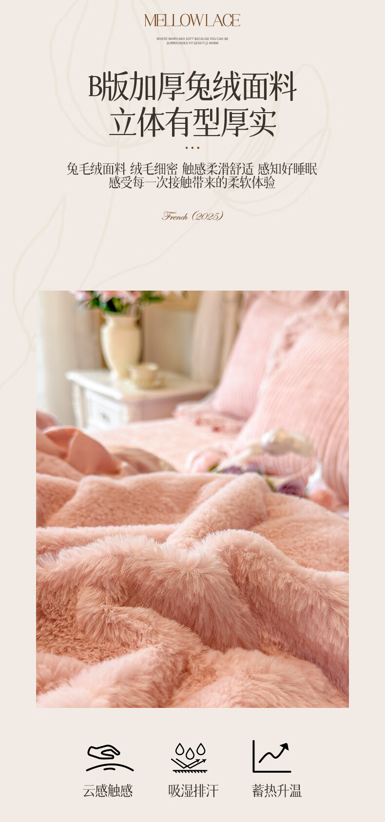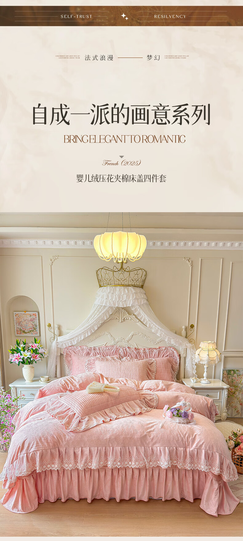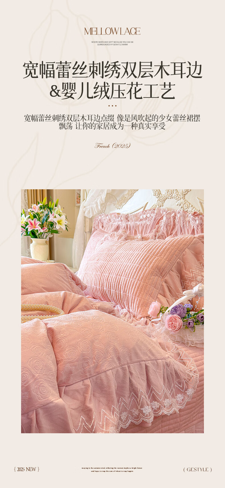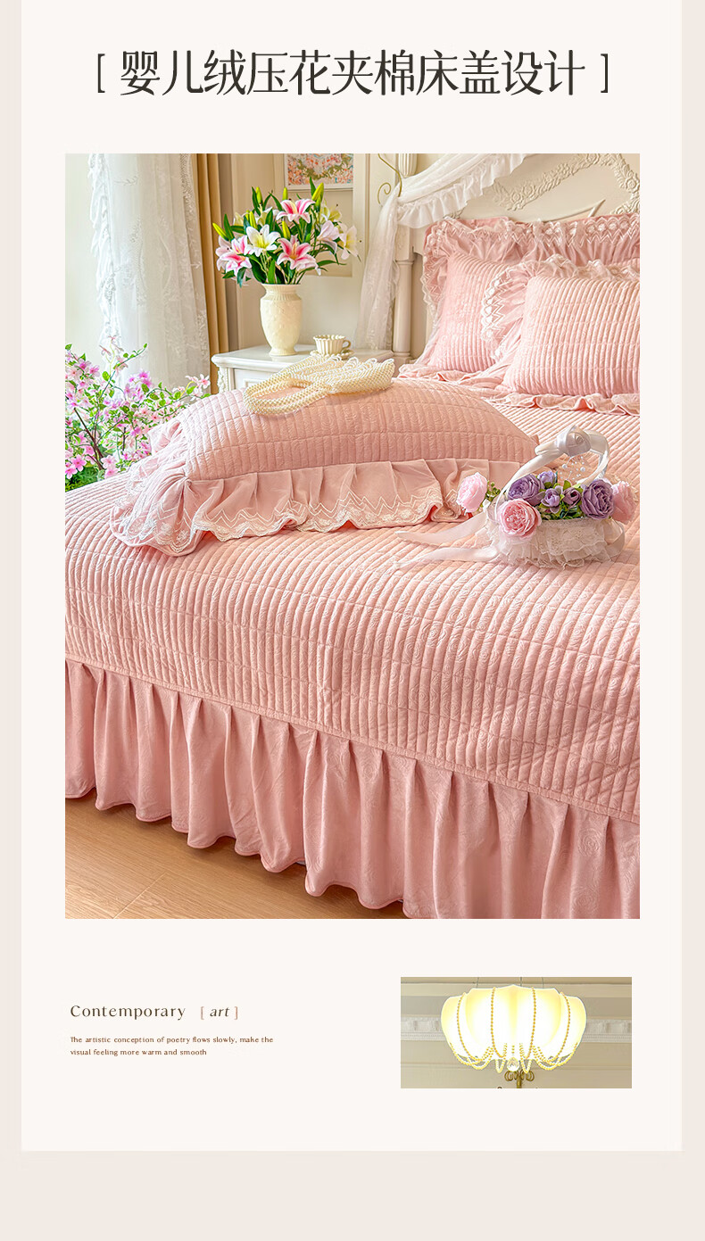 Yalu Korean lace baby velvet bed skirt four-piece set winter double-sided milk velvet warm bed sheet quilt cover three-piece set Chanel Garden-Pink Jade bed cover 1.5m four-piece set