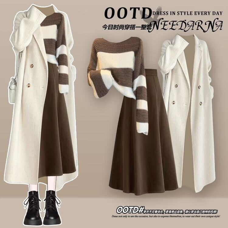 2025 Autumn and Winter Women's Wear Complete Set of Fashionable and Mature Windbreakers, Loose Sweaters, and Popular Skirts Three-piece Set Off-white Coat + Brown White Sweater + Brown Skirt Three-piece Set XL Recommended 120-140 Jin Jin equals 0.5 kg