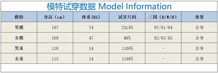 China (cm) 165 / 88-90 170 / 96-98 175 / 108-110 180 / 118-122 185 / 126-130