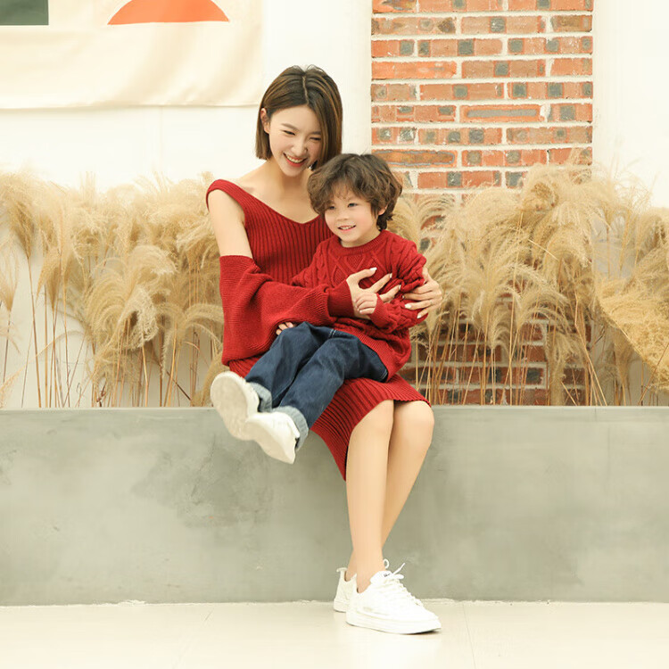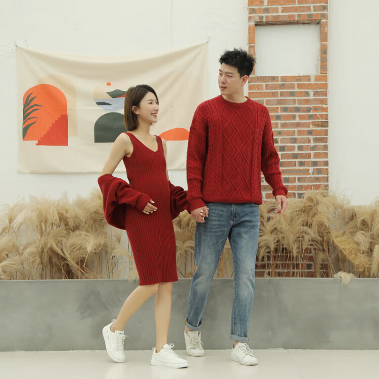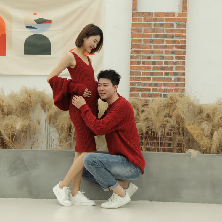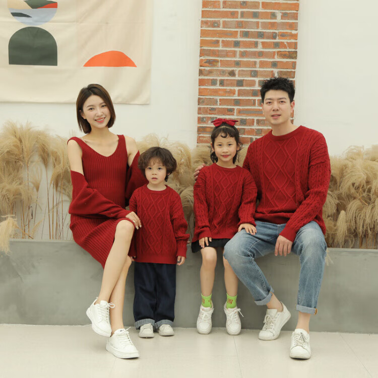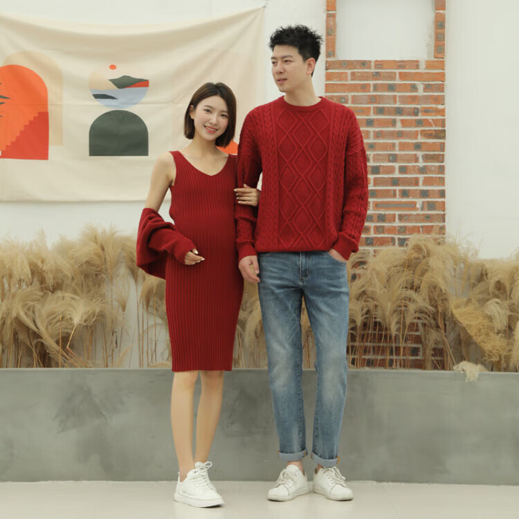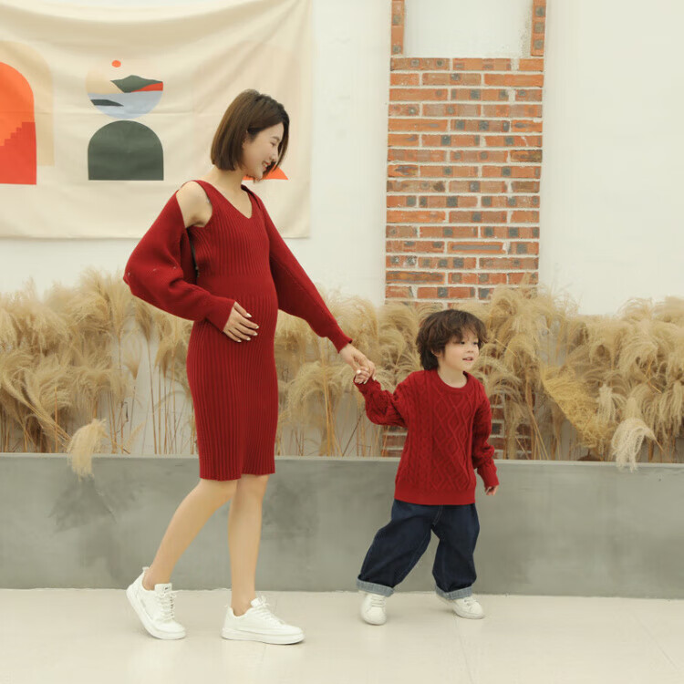 G.duck maternity photography clothing, parent-child clothing, family of three art photography, birth year and New Year red sweater family portrait, burgundy 210 suspender skirt two-piece set, one size fits all