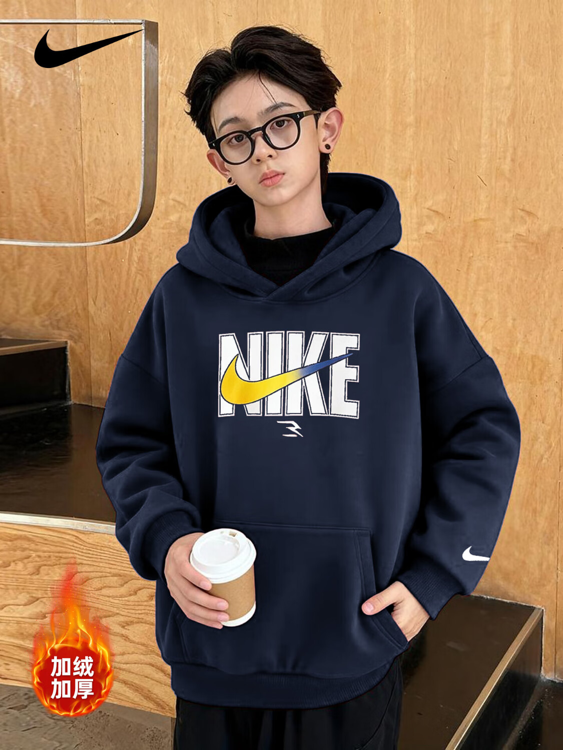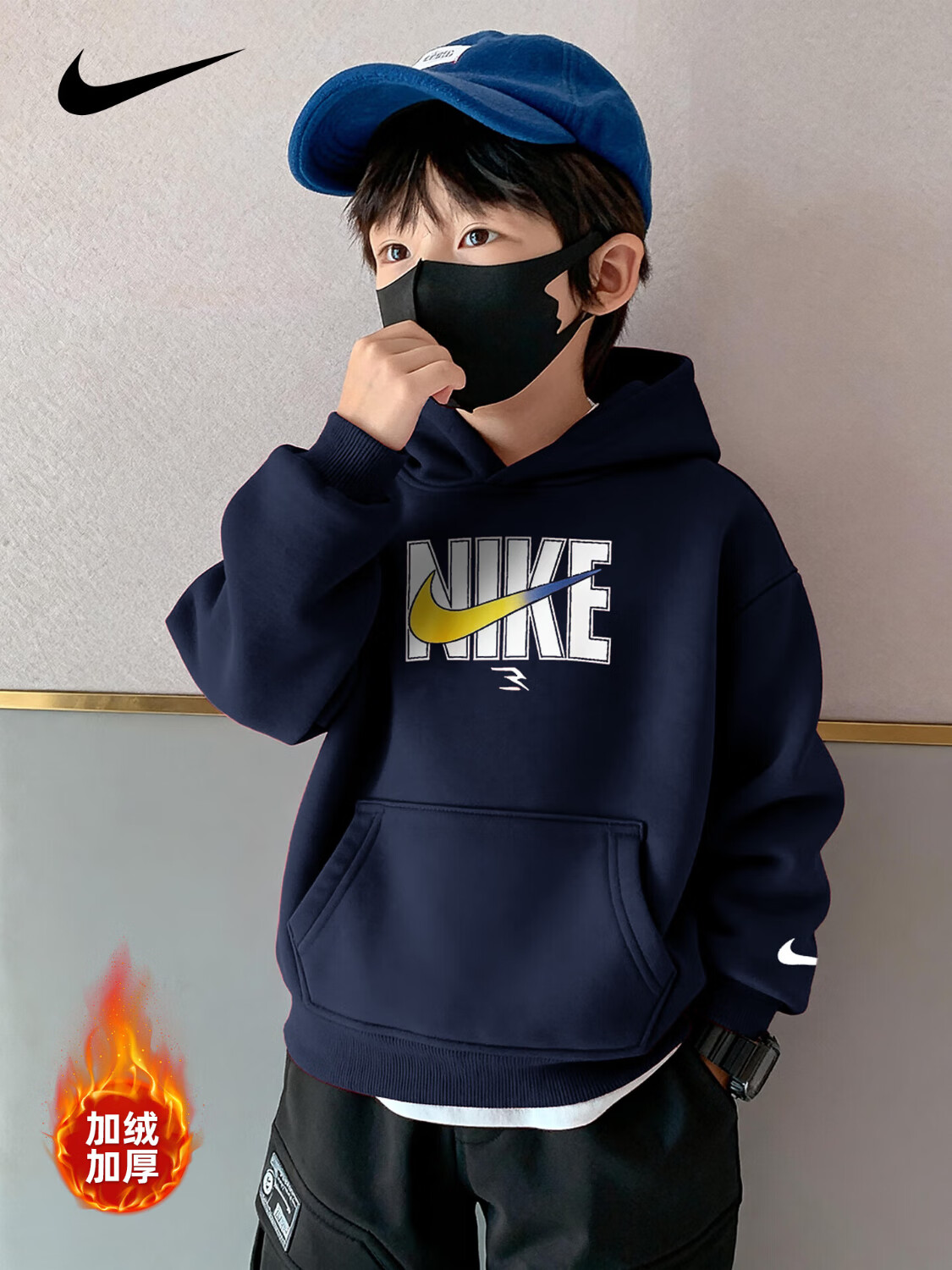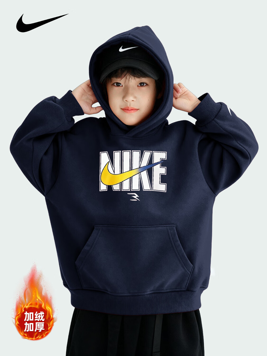 NIKE Nike Boys Hooded Sweatshirt with Velvet 2025 New Autumn and Winter Girls' Clothing Big Children's Thickened Top to Keep Warm in Winter Indigo 2233 Velvet and Thickened High Weight 160/L Recommended Height 152-158cm