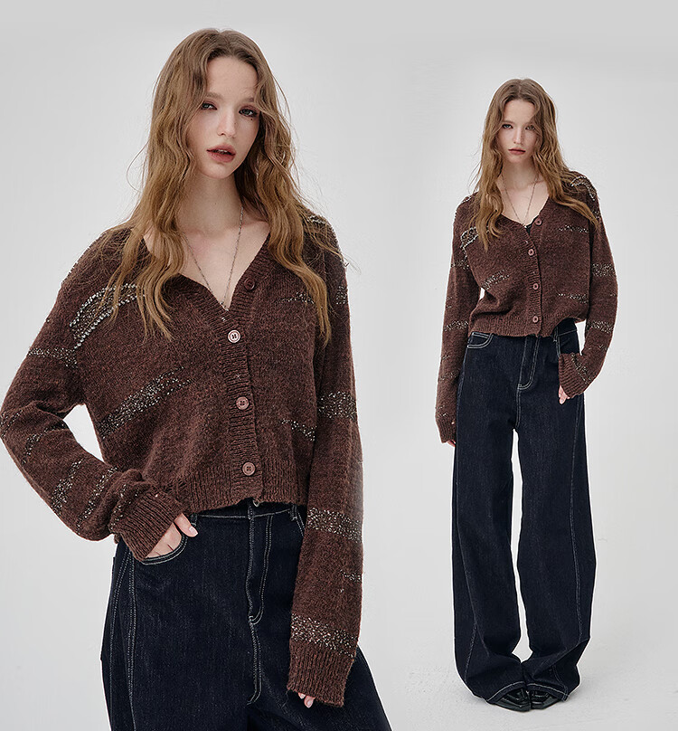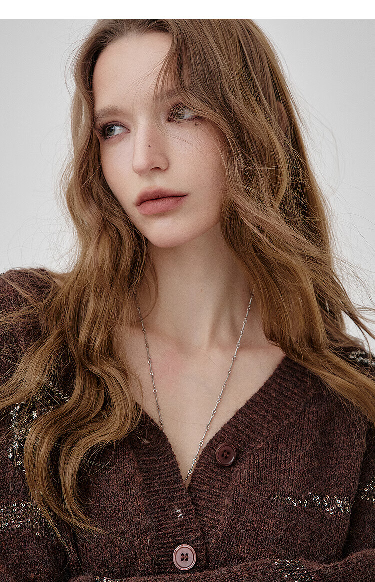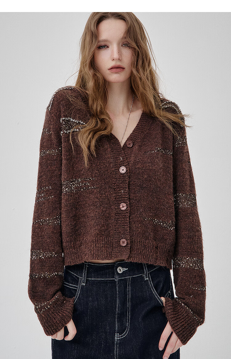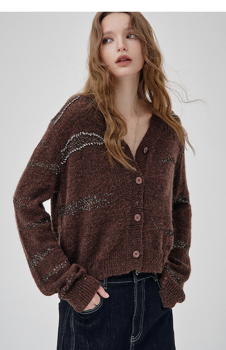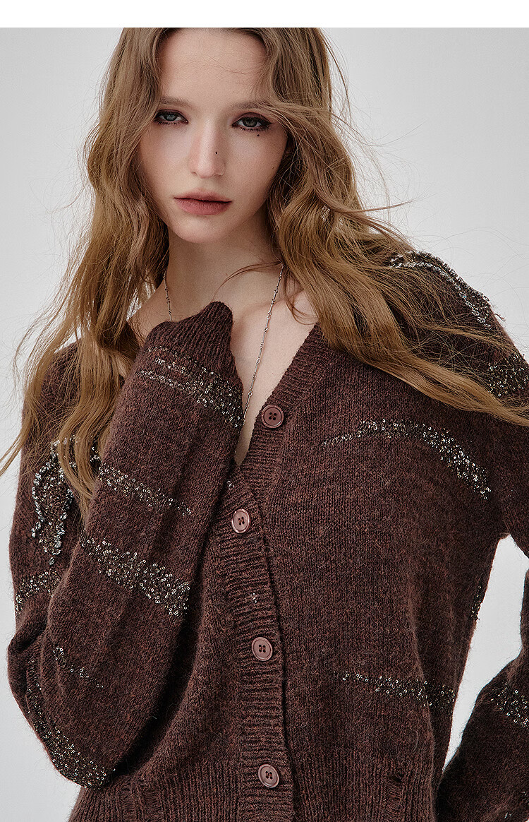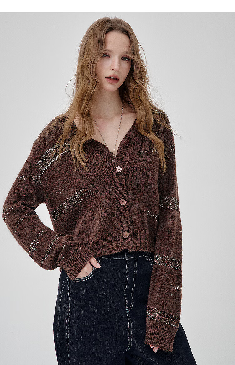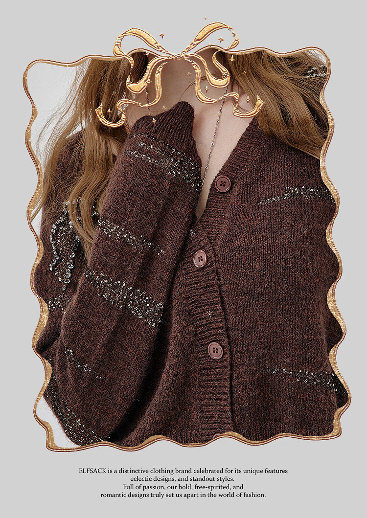 Fairy's pocket v-neck sweater cardigan for women 2025 autumn and winter slimming heavy-duty design long-sleeved sweater top temperament coffee color S