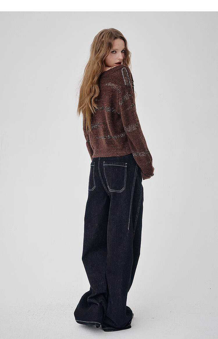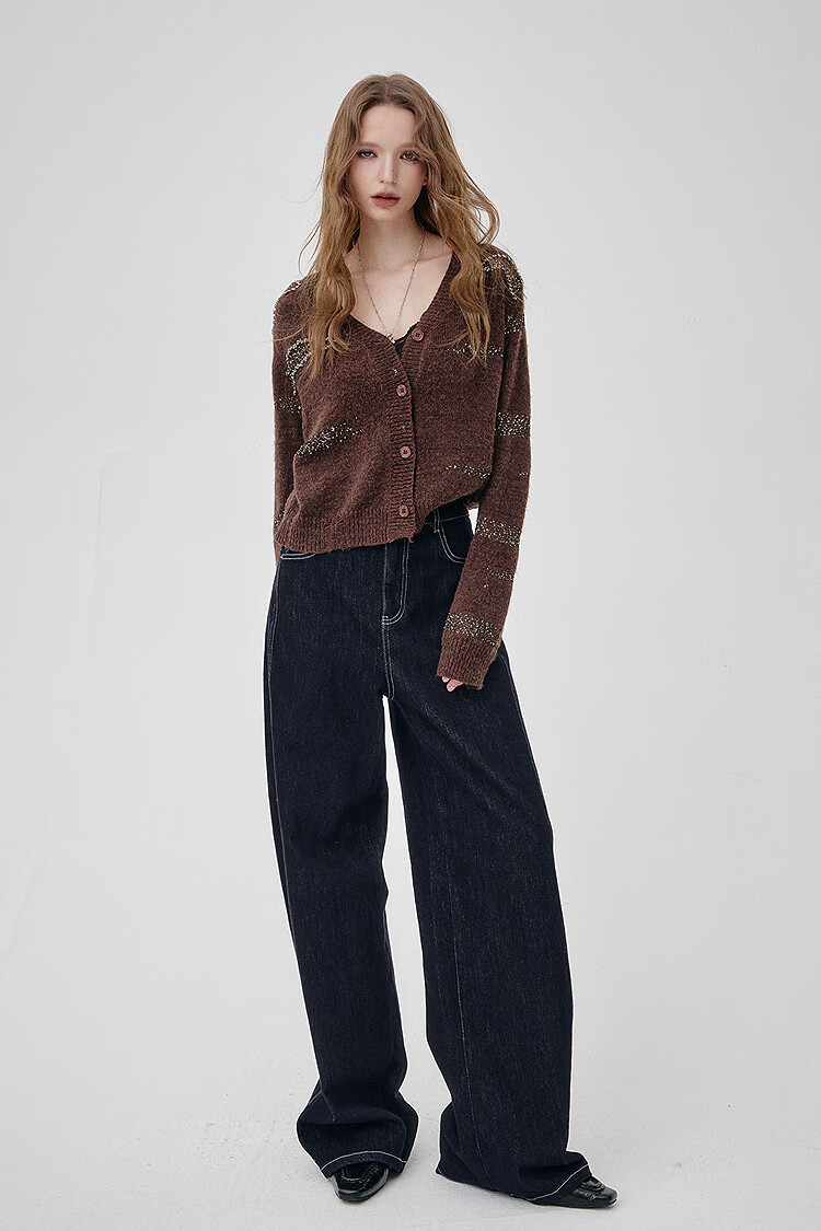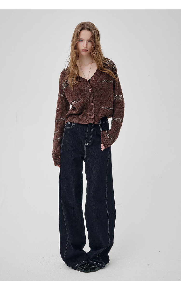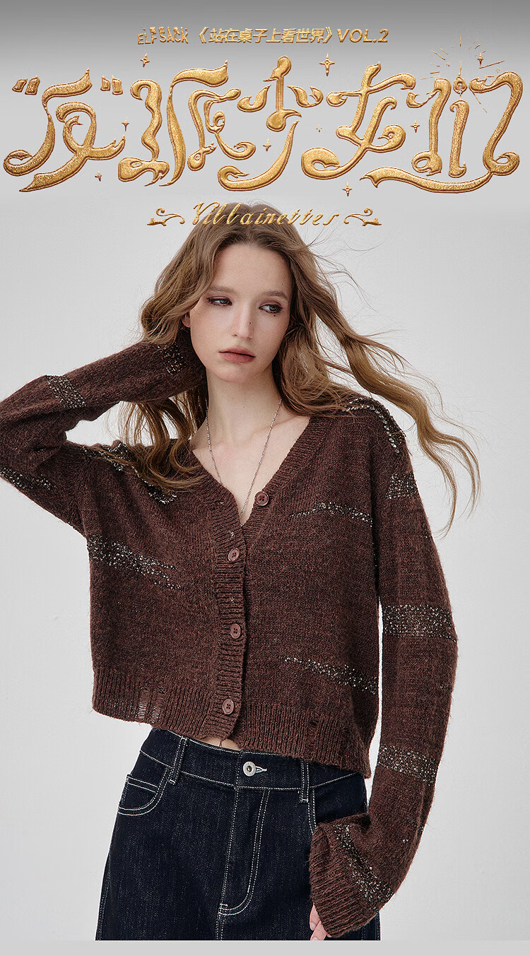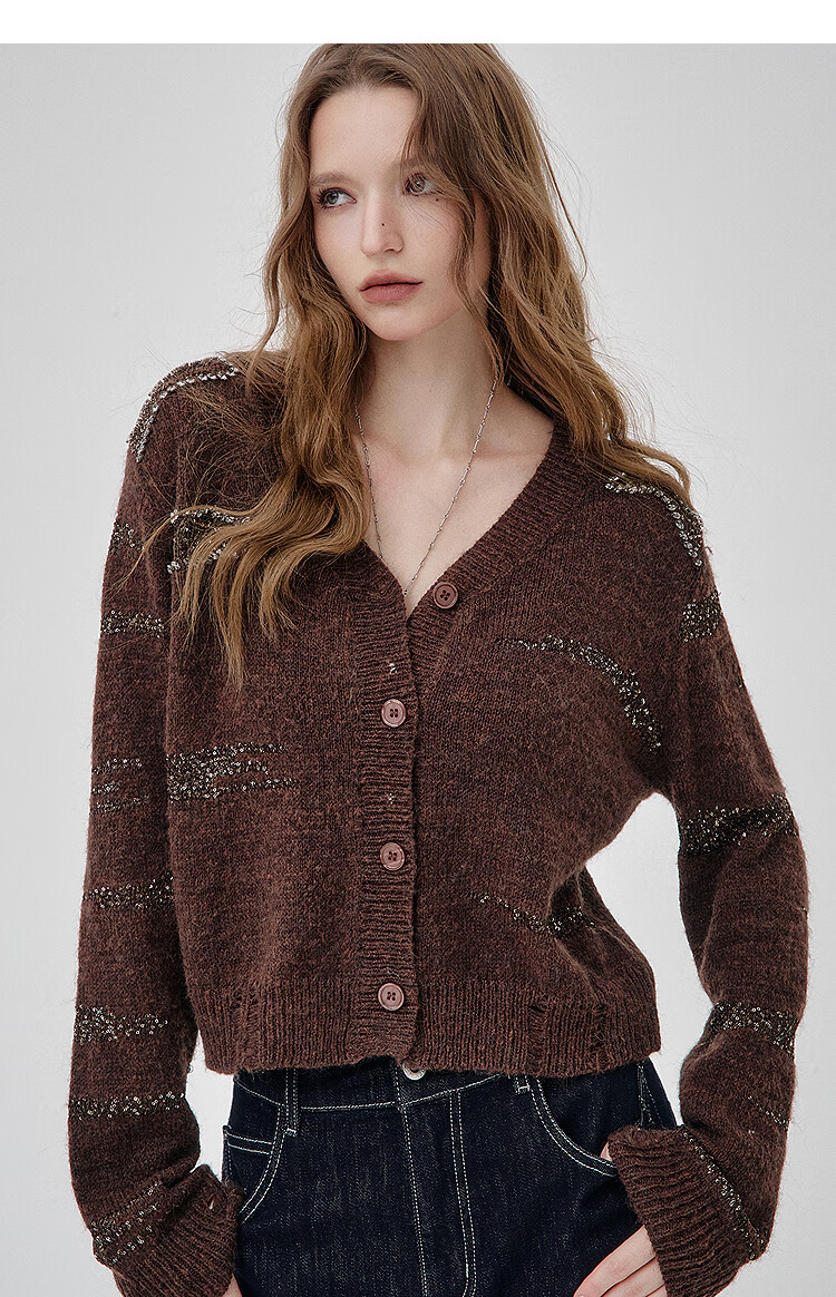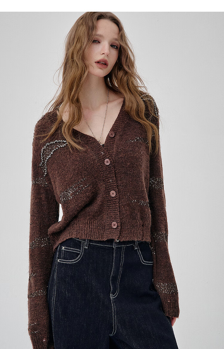 Fairy's pocket v-neck sweater cardigan for women 2025 autumn and winter slimming heavy-duty design long-sleeved sweater top temperament coffee color S