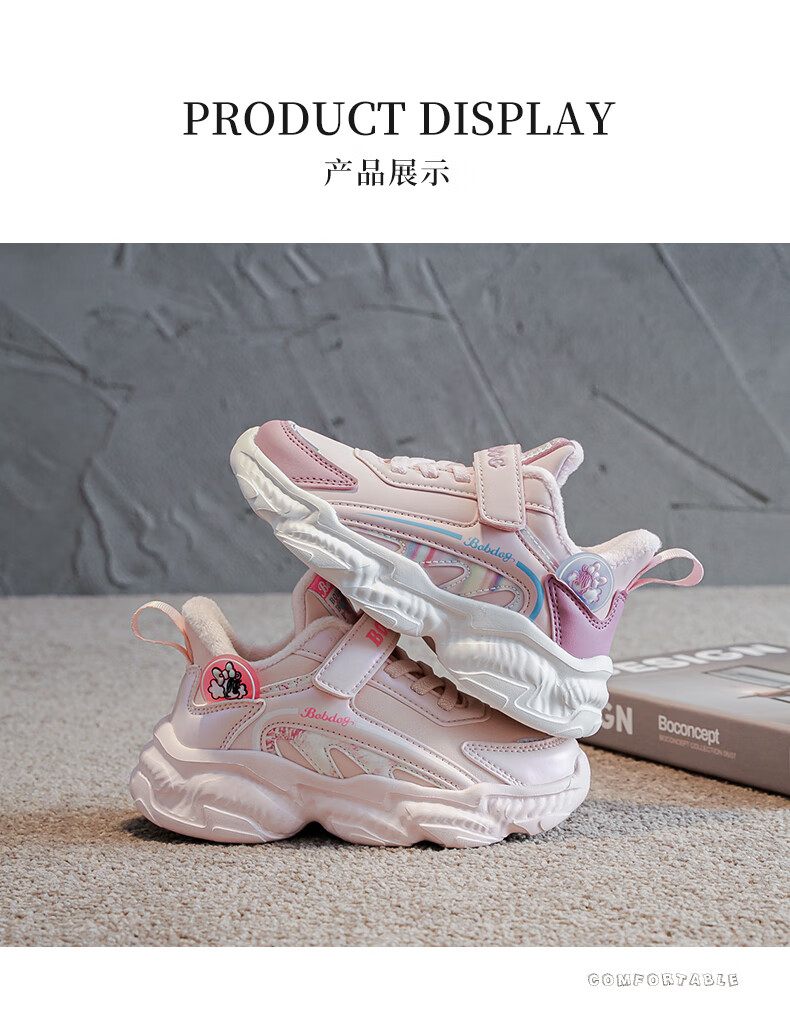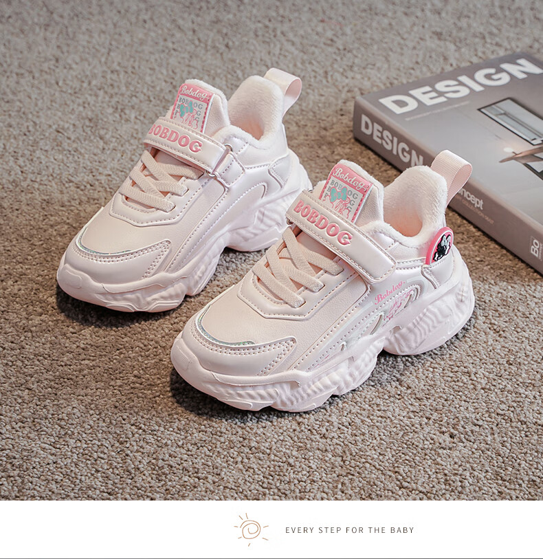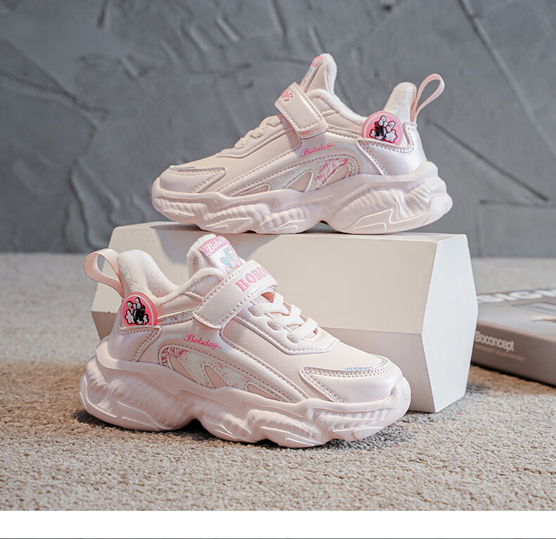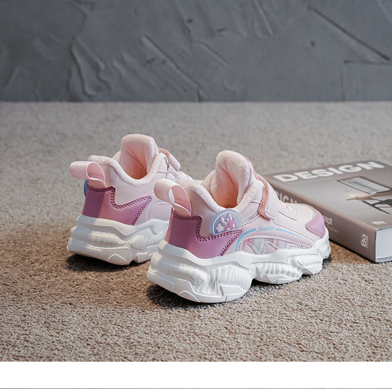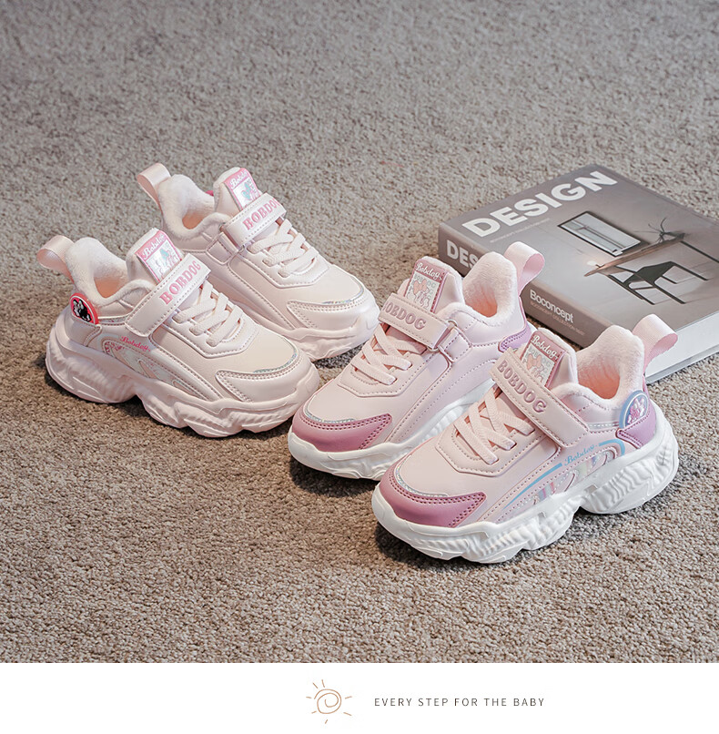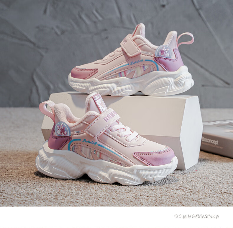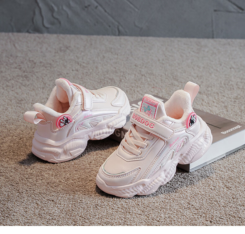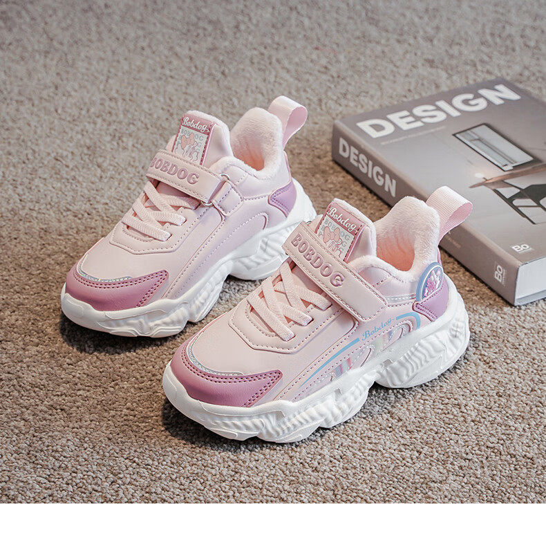 BOBDOG children's shoes, girls' second cotton shoes, winter girls' sports shoes, plus velvet, warm children's cotton shoes, leather waterproof running shoes, pink/purple (plus velvet, second cotton) 29 (suitable for foot length 17.8)